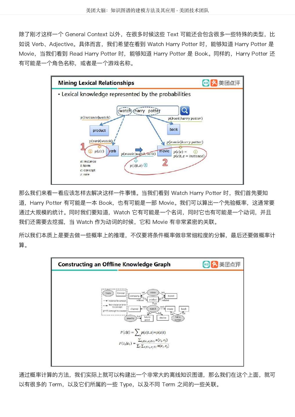 27 . 美团大脑:知识图谱的建模方法及其应用 - 美团技术团队 除了刚才这样一个 General Context 以外,在很多时候这些 Text 可能还会包含很多一些特殊的类型,比 如说 Verb、Adjective。具体而言,我们希望在看到 Watch Harry Potter 时,能够知道 Harry Potter 是 Movie,当我们看到 Read Harry Potter 时,能够知道 Harry Potter 是 Book。同样的,Harry Potter 还 有可能是一个角色名称,或者是一个游戏名称。 那么我们来看一看应该怎样去解决这样一件事情。当我们看到 Watch Harry Potter 时,我们首先要知 道,Harry Potter 有可能是一本 Book,也有可能是一部 Movie。我们可以算出一个先验概率,这通常要 通过大规模的统计。同时我们要知道,Watch 它有可能是一个名词,同时它也有可能是一个动词,并且 我们还需要去挖掘,当 Watch 作为动词的时候,它和 Movie 有非常紧密的关联。 所以我们本质上是要去做一些概率上的推理,不仅要将条件概率做非常细粒度的分解,最后还要做概率计 算。 通过概率计算的方法,我们实际上就可以构建出一个非常大的离线知识图谱,那么我们在这个上面,就可 以有很多的 Term,以及它们所属的一些 Type,以及不同 Term 之间的一些关联。