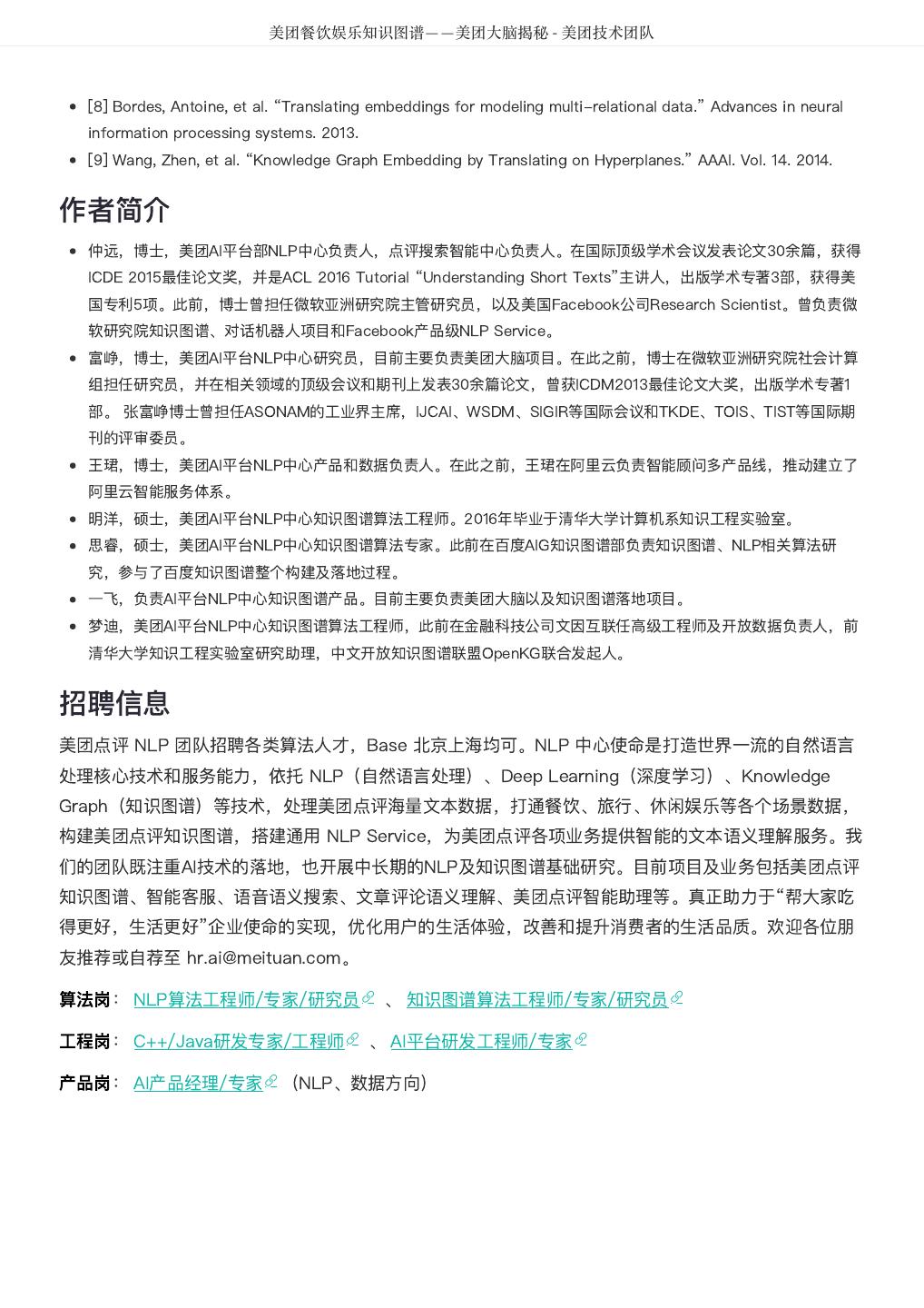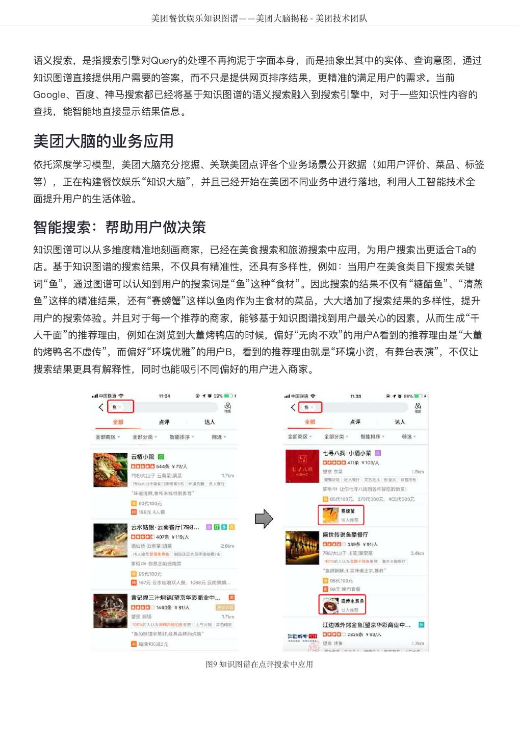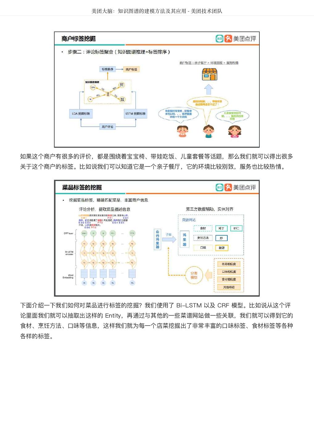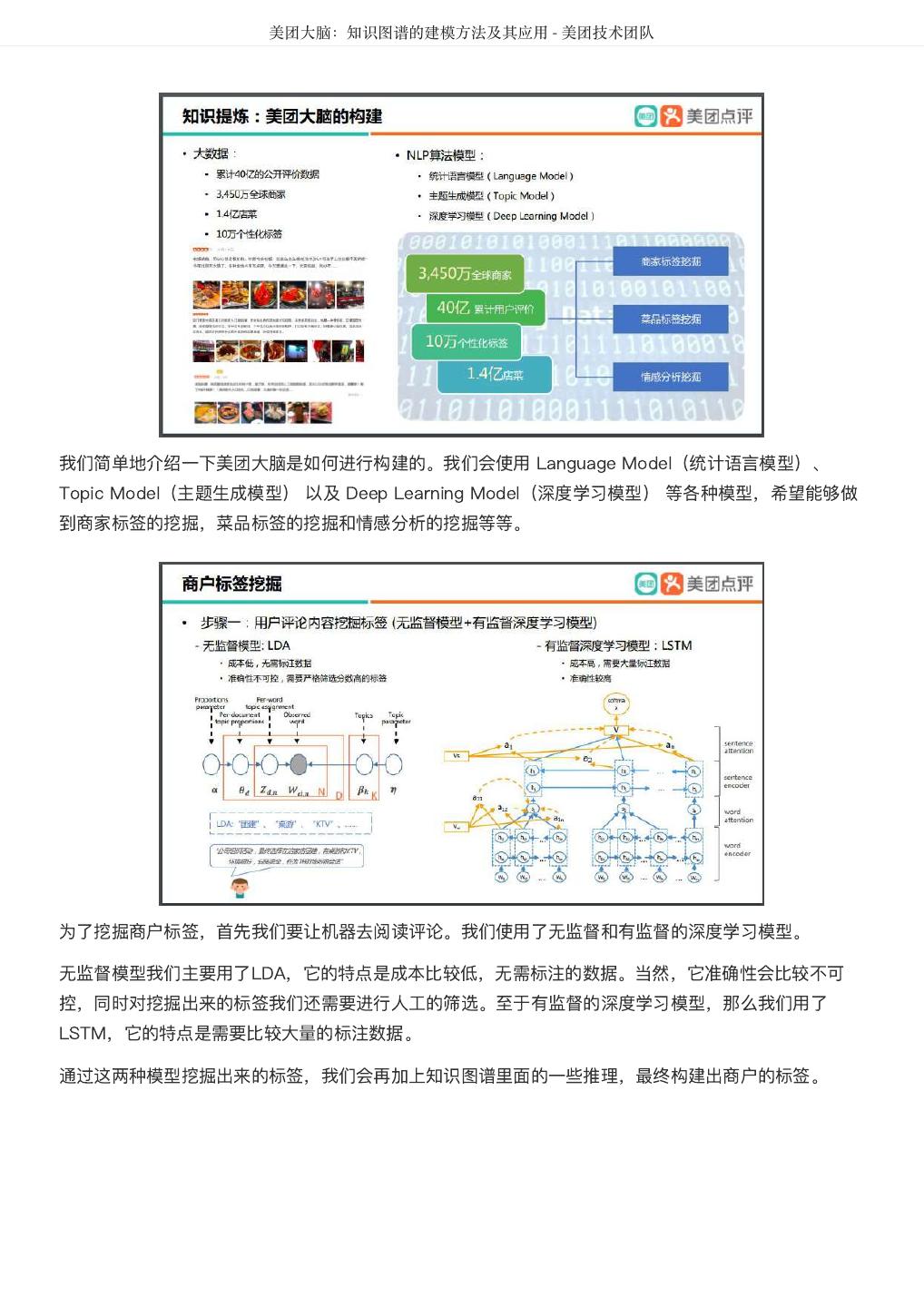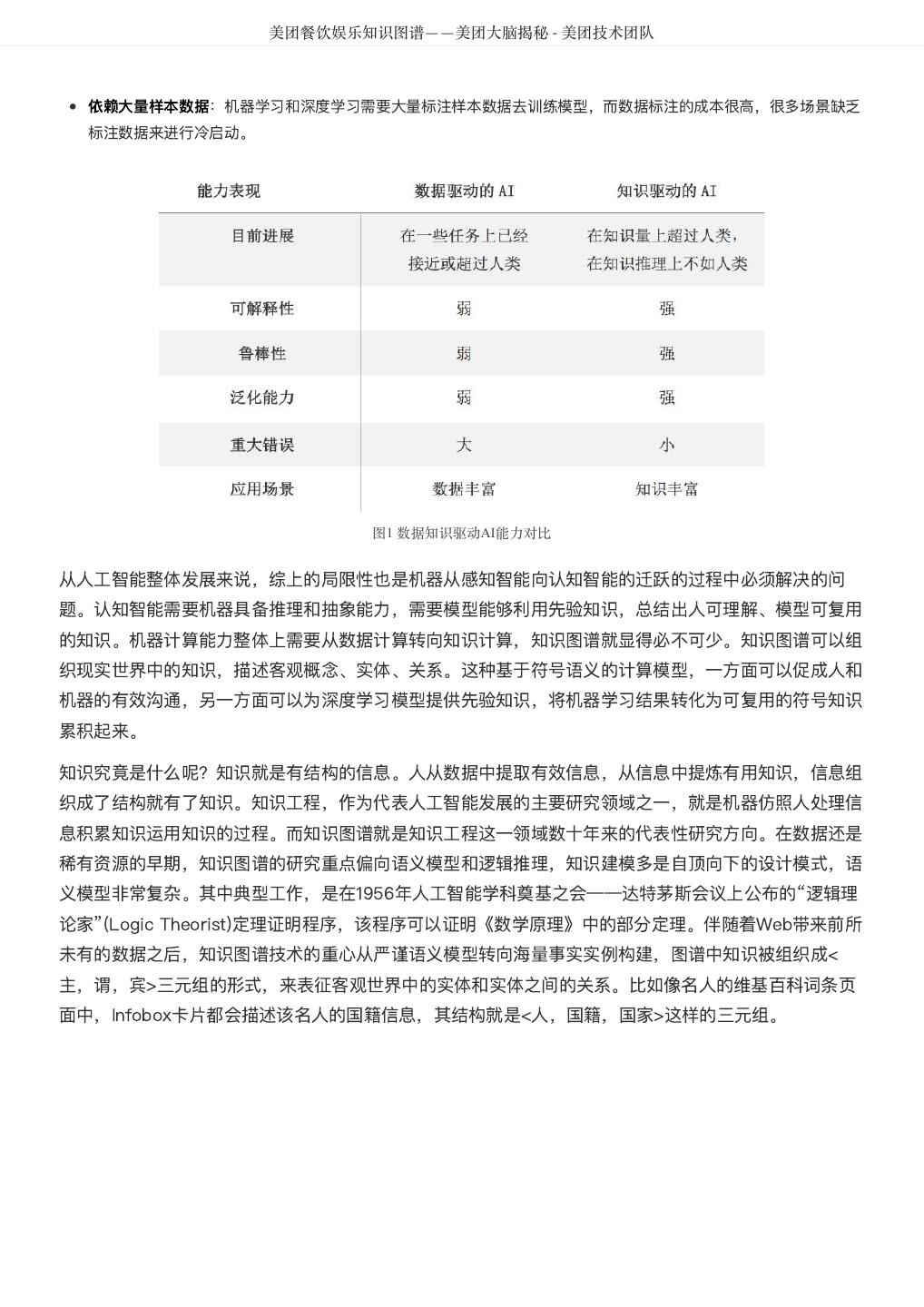 17 . 美团大脑:知识图谱的建模方法及其应用 - 美团技术团队 作为全球领先的生活服务电子商务平台,美团点评在人工智能领域也在积极地进行布局。今年 2 月份, AI 平台部 NLP 中心正式成立,我们的愿景是用人工智能帮大家吃得更好,生活更好。语言是人类智慧的 结晶,而自然语言处理是人工智能中最为困难的问题之一,其核心是让机器能像人类一样理解和使用语 言。 我们希望在不久的将来,当用户发表一条评价的时候,能够让机器阅读这条评价,充分理解用户的喜怒哀 乐。当用户进入大众点评的一个商家页面时,面对成千上万条用户评论,我们希望机器能够代替用户快速 地阅读这些评论,总结商家的情况,供用户进行参考。未来,当用户有任何餐饮、娱乐方面的决策需求的 时候,美团点评能够提供人工智能助理服务,帮助用户快速的进行决策。 所有这一切,都依赖于人工智能背后两大技术驱动力:深度学习和知识图谱。我们可以将这两个技术进行 一个简单的比较: 我们将深度学习归纳为隐性的模型,它通常是面向某一个具体任务,比如说下围棋、识别猫、人脸识别、 语音识别等等。通常而言,在很多任务上它能够取得非常优秀的结果,同时它也有非常多的局限性,比如 说它需要海量的训练数据,以及非常强大的计算能力,难以进行任务上的迁移,而且可解释性比较差。