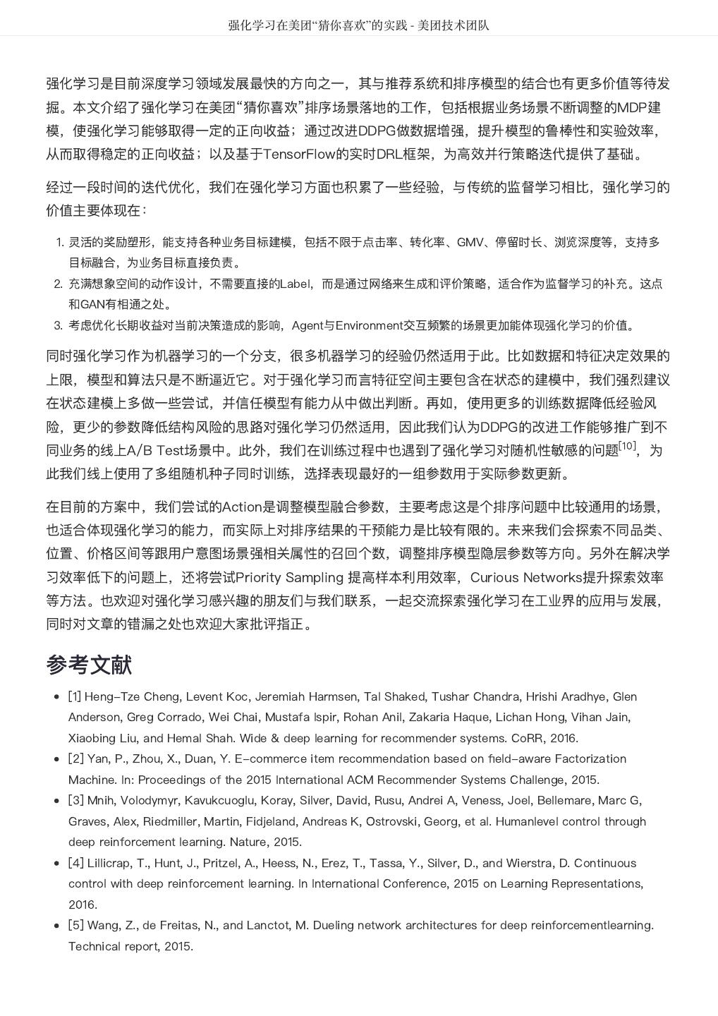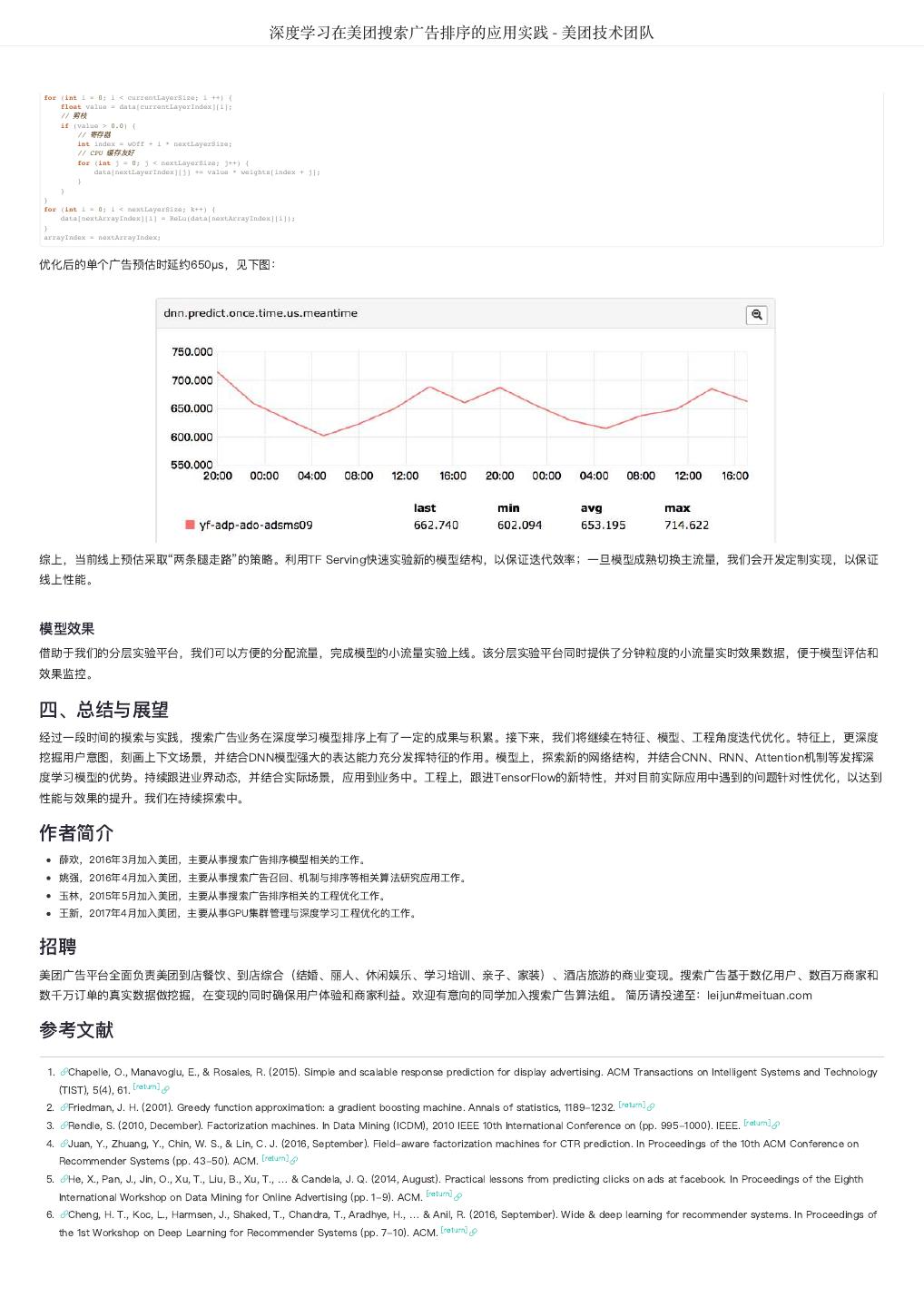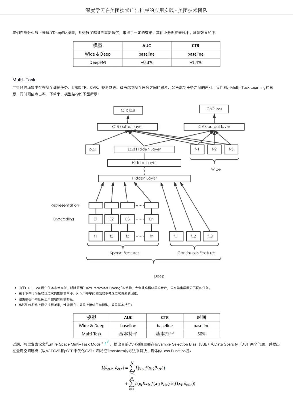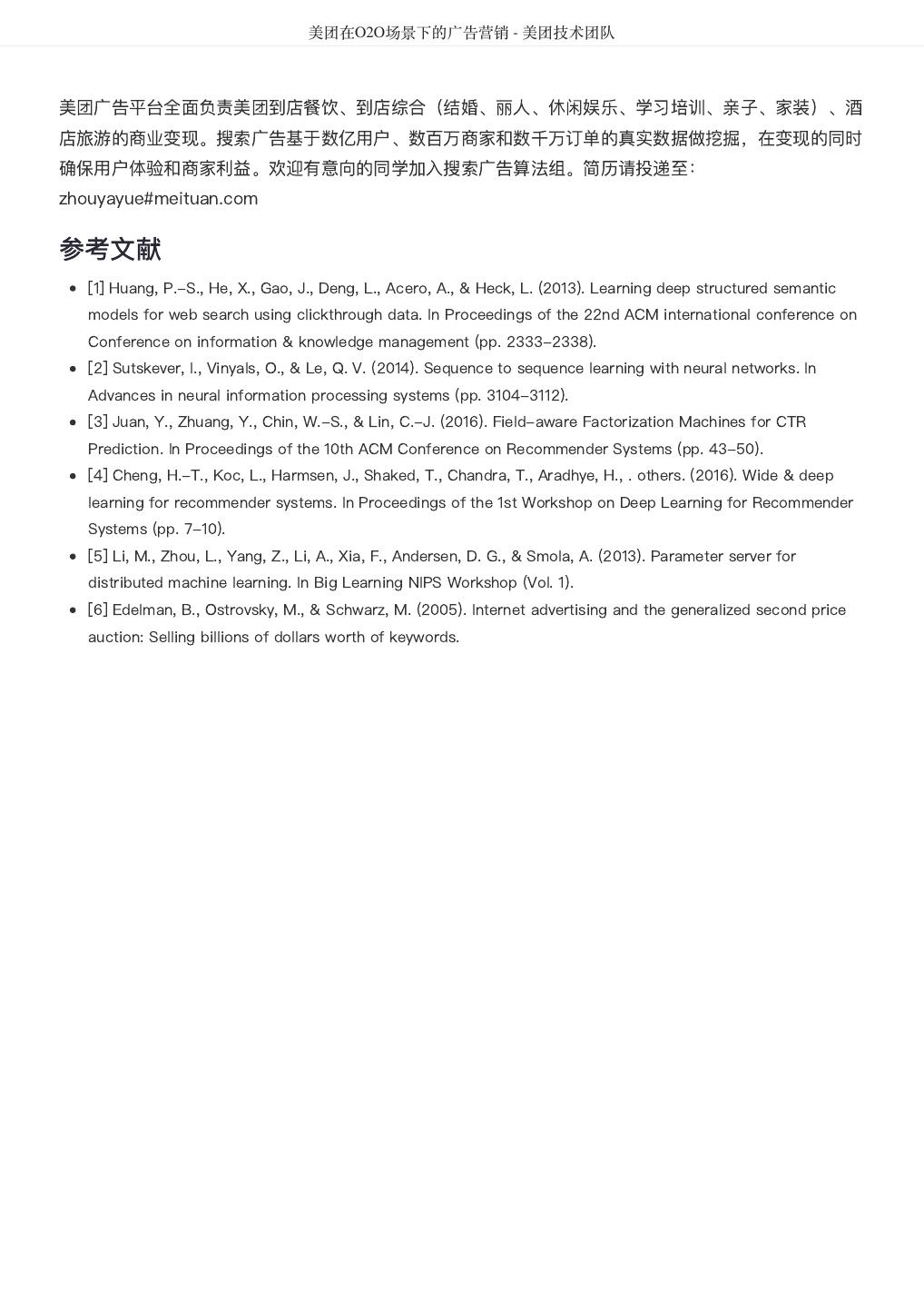 15 . 美团“猜你喜欢”深度学习排序模型实践 - 美团技术团队 [1]: Mu Li, David G. Andersen, Alexander Smola, and Kai Yu. Communication Efficient Distributed Machine Learning with the Parameter Server. NIPS, 2014b. [2]: Rich Caruana. Multitask Learning. Betascript Publishing, 1997. [3]: Xiangnan He and Tat-Seng Chua. Neural Factorization Machines for Sparse Predictive Analytics. Proceedings of the 40th International ACM SIGIR conference on Research and Development in Information Retrieval(2017). [4]: Guorui Zhou, Chengru Song, et al. Deep Interest Network for Click-Through Rate Prediction.arXiv preprint arXiv:1706.06978,2017. [5]: Dzmitry Bahdanau, Kyunghyun Cho, and Yoshua Bengio. Neural Machine Translation by Jointly Learning to Align and Translate. ICLR ’15, May 2015. [6]: H.-T. Cheng, L. Koc, J. Harmsen, T. Shaked, T. Chandra, H. Aradhye, G. Anderson, G. Corrado, W. Chai, M. Ispir, et al. Wide & deep learning for recommender systems. arXiv preprint arXiv:1606.07792, 2016. 作者简介 绍哲,2015年校招入职原美团, 主要从事推荐排序模型相关的工作。 刘锐,先后在百度、阿里巴巴从事推荐业务相关工作,现就职于美团平台推荐技术中心,专注深度学习模型的研发工 作。 招聘 美团平台推荐技术中心负责美团首页“猜你喜欢”、运营区、酒店旅游推荐等公司重要的业务场景,长期 致力于推荐场景的深度优化,在挖掘用户吃喝玩乐需求的同时提供更好的产品体验。美团平台推荐技术中 心高端算法职位持续招聘中! 期待你的加入,与我们一起解决技术与业务问题,快乐工作,共同成长。 简历请投递至:caohao#meituan.com