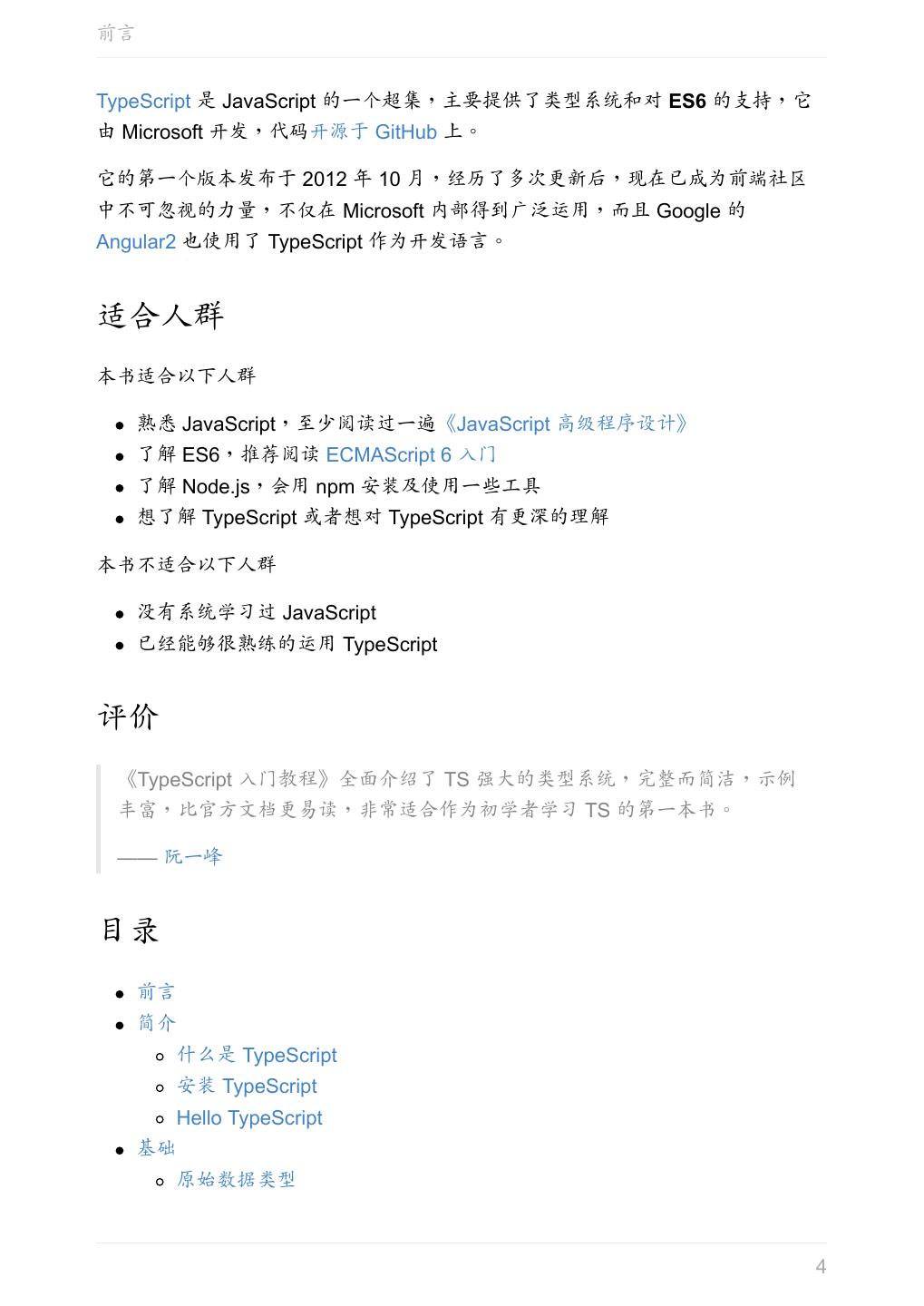 3 .前言 TypeScript 入门教程 从 JavaScript 程序员的角度总结思考,循序渐进的理解 TypeScript。 关于本书 在线阅读(部署在 GitBook 上,可能需要翻墙) 在线阅读(GitHub 版) GitHub 地址 作者:xcatliu 官方 QQ 群:加入 QQ 群 767142358 本书是作者在学习 TypeScript 后整理的学习笔记。 随着对 TypeScript 理解的加深和 TypeScript 社区的发展,本书也会做出相应的更 新,欢迎大家 Star 收藏。 发现文章内容有问题,可以直接在页面下方评论 对项目的建议,可以提交 issue 向作者反馈 欢迎直接提交 pull-request 参与贡献 为什么要写本书 TypeScript 虽然有官方手册及其非官方中文版,但是它每一章都希望能详尽的描述 一个概念,导致前面的章节就会包含很多后面才会学习到的内容,而有些本该一开 始就了解的基础知识却在后面才会涉及。如果是初学者,可能需要阅读多次才能理 解。所以它更适合用来查阅,而不是学习。 与官方手册不同,本书着重于从 JavaScript 程序员的角度总结思考,循序渐进的理 解 TypeScript,希望能给大家一些帮助和启示。 由于一些知识点与官方手册重合度很高,本书会在相应章节推荐直接阅读中文手 册。 关于 TypeScript 3
