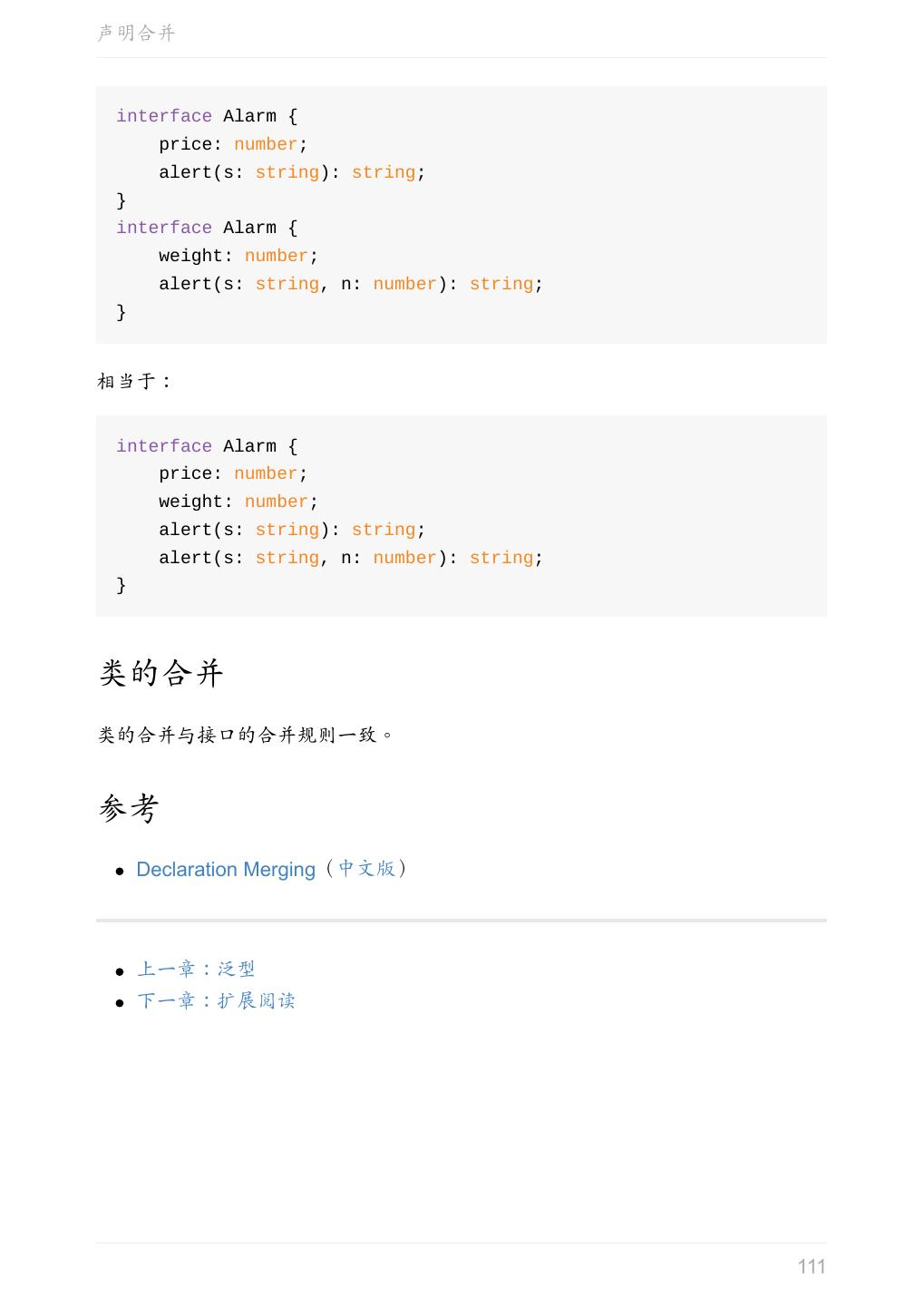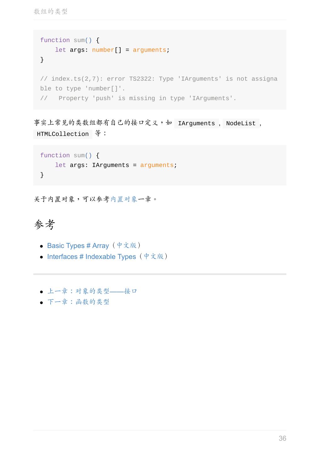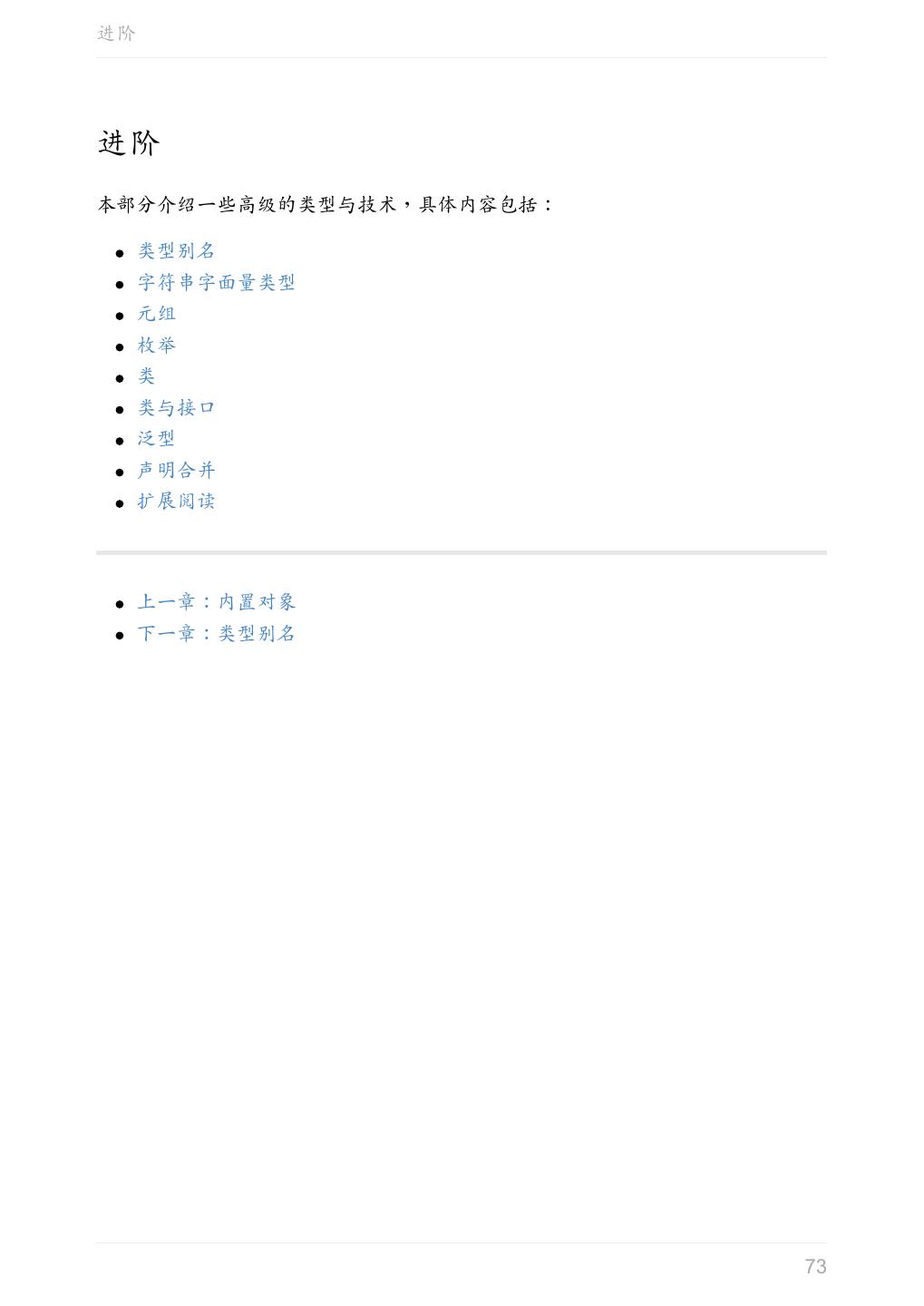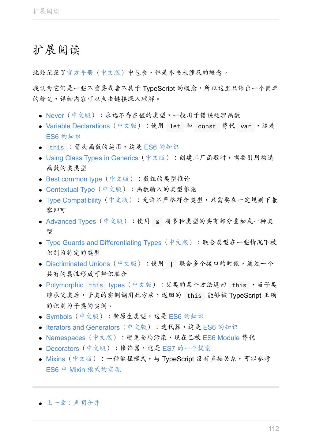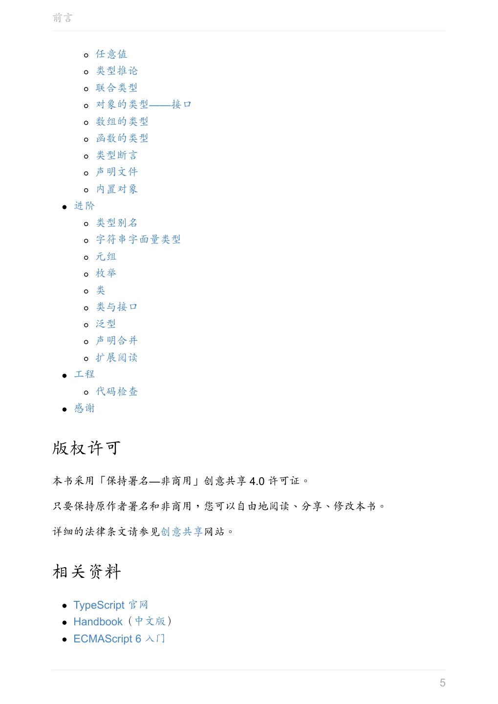 5 .前言 任意值 类型推论 联合类型 对象的类型——接口 数组的类型 函数的类型 类型断言 声明文件 内置对象 进阶 类型别名 字符串字面量类型 元组 枚举 类 类与接口 泛型 声明合并 扩展阅读 工程 代码检查 感谢 版权许可 本书采用「保持署名—非商用」创意共享 4.0 许可证。 只要保持原作者署名和非商用,您可以自由地阅读、分享、修改本书。 详细的法律条文请参见创意共享网站。 相关资料 TypeScript 官网 Handbook(中文版) ECMAScript 6 入门 5
