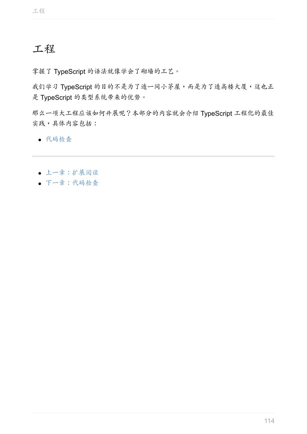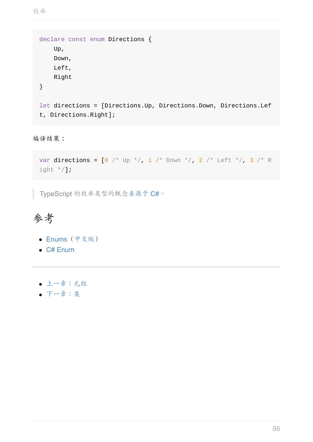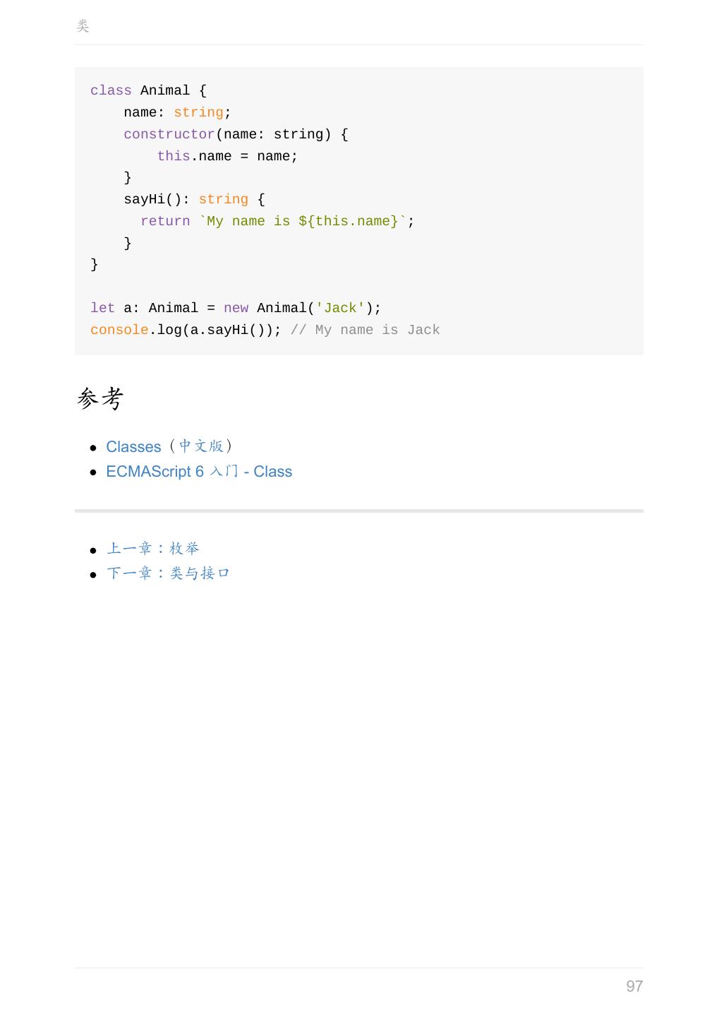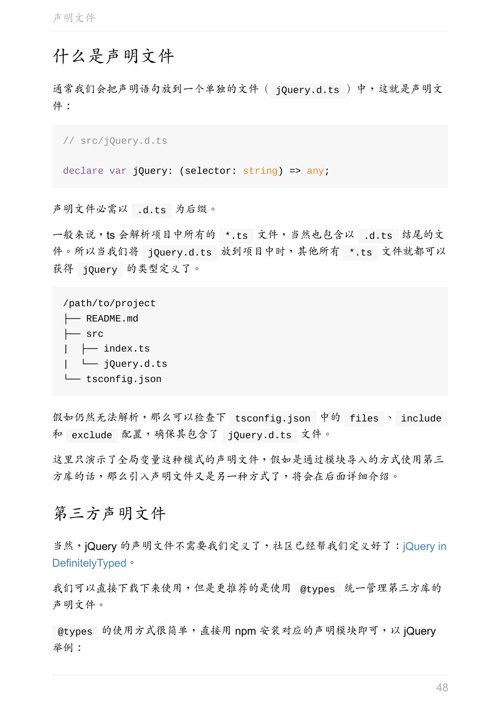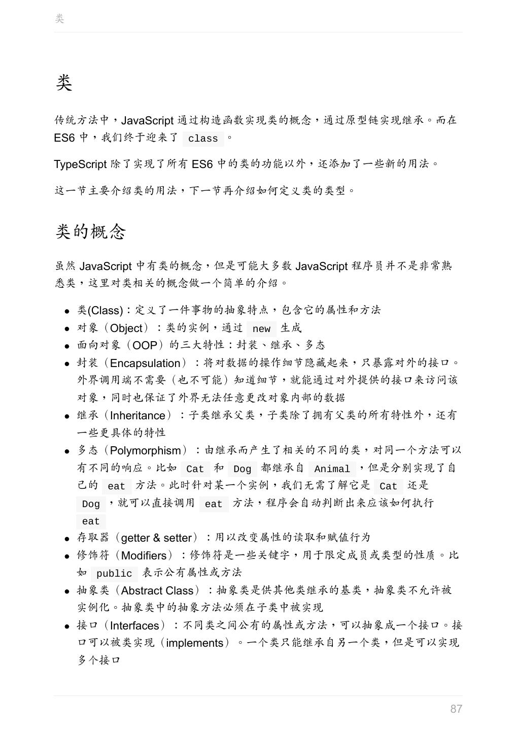 5 .前言 任意值 类型推论 联合类型 对象的类型——接口 数组的类型 函数的类型 类型断言 声明文件 内置对象 进阶 类型别名 字符串字面量类型 元组 枚举 类 类与接口 泛型 声明合并 扩展阅读 工程 代码检查 感谢 版权许可 本书采用「保持署名—非商用」创意共享 4.0 许可证。 只要保持原作者署名和非商用,您可以自由地阅读、分享、修改本书。 详细的法律条文请参见创意共享网站。 相关资料 TypeScript 官网 Handbook(中文版) ECMAScript 6 入门 5