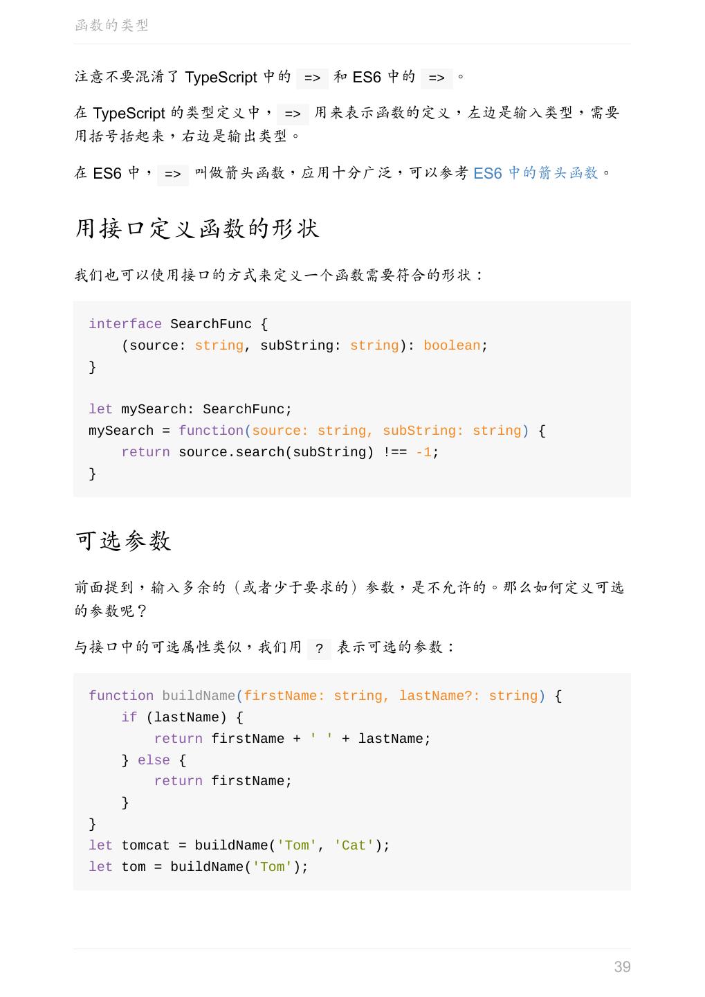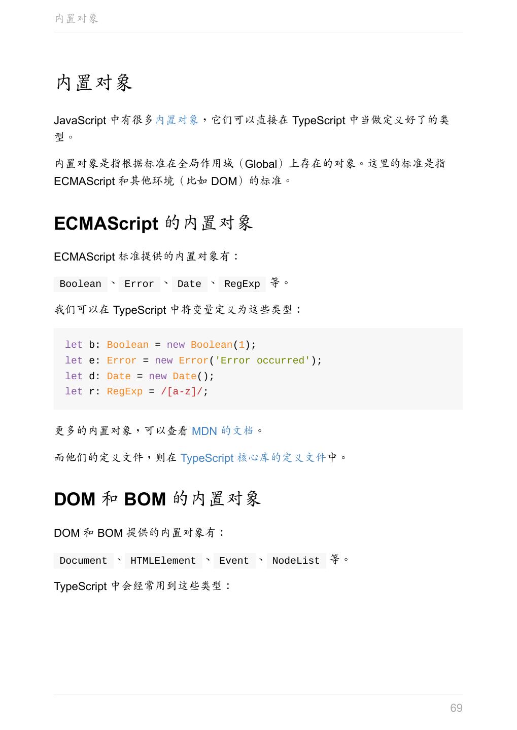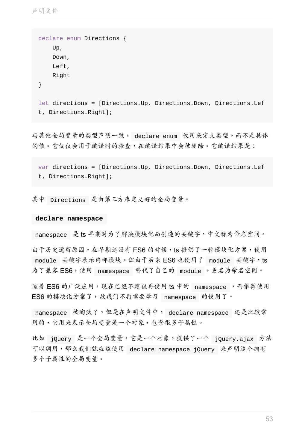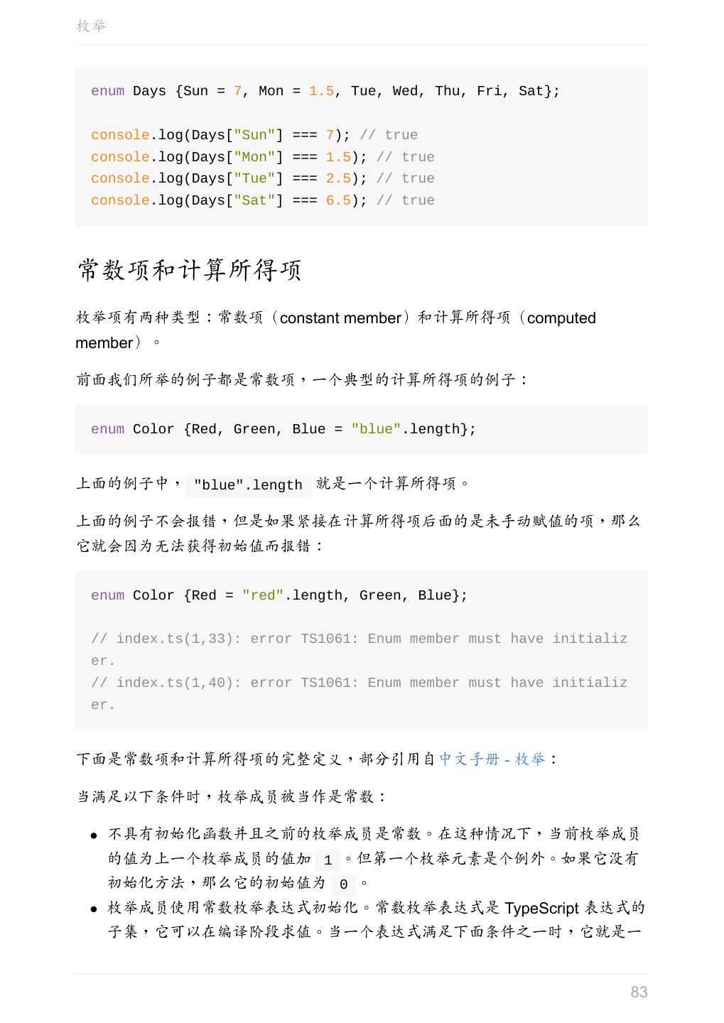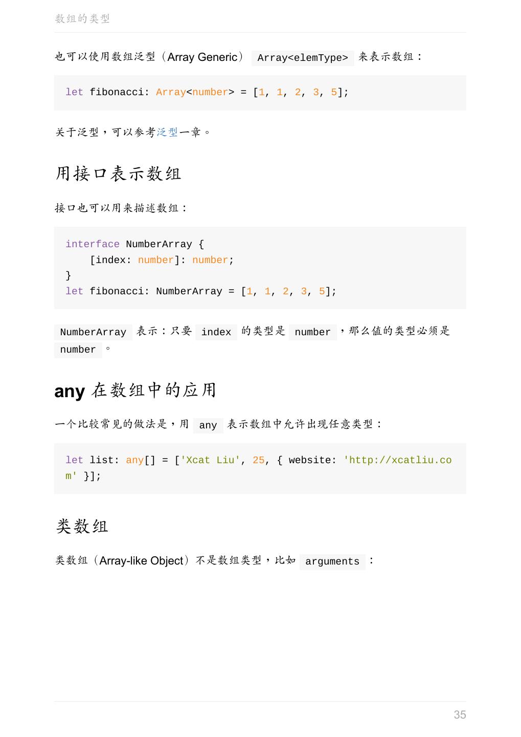 5 .前言 任意值 类型推论 联合类型 对象的类型——接口 数组的类型 函数的类型 类型断言 声明文件 内置对象 进阶 类型别名 字符串字面量类型 元组 枚举 类 类与接口 泛型 声明合并 扩展阅读 工程 代码检查 感谢 版权许可 本书采用「保持署名—非商用」创意共享 4.0 许可证。 只要保持原作者署名和非商用,您可以自由地阅读、分享、修改本书。 详细的法律条文请参见创意共享网站。 相关资料 TypeScript 官网 Handbook(中文版) ECMAScript 6 入门 5