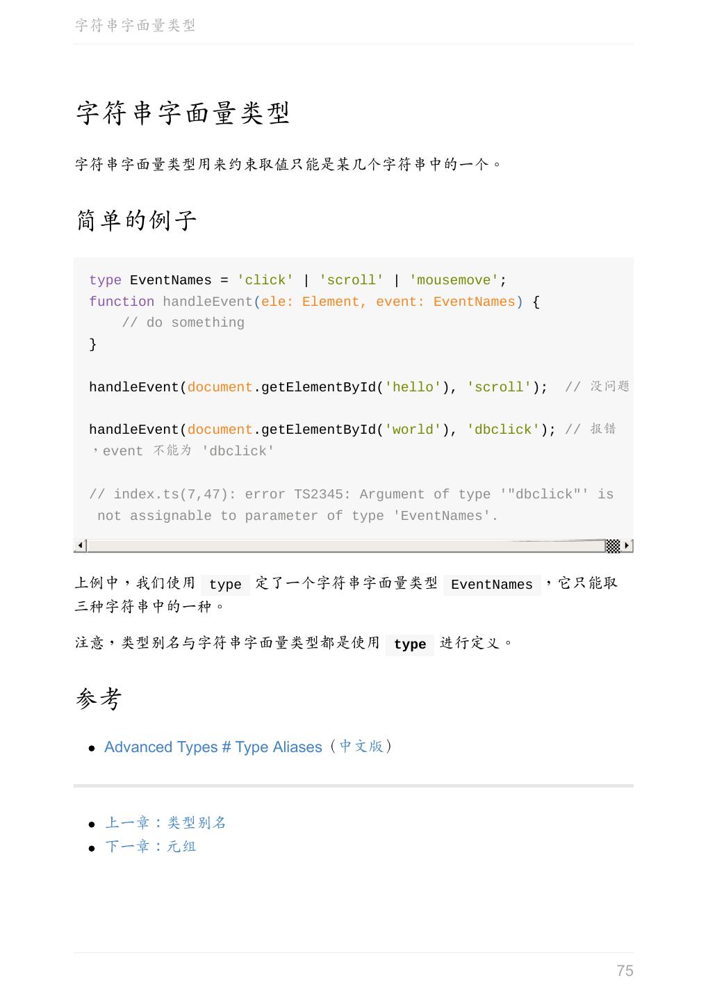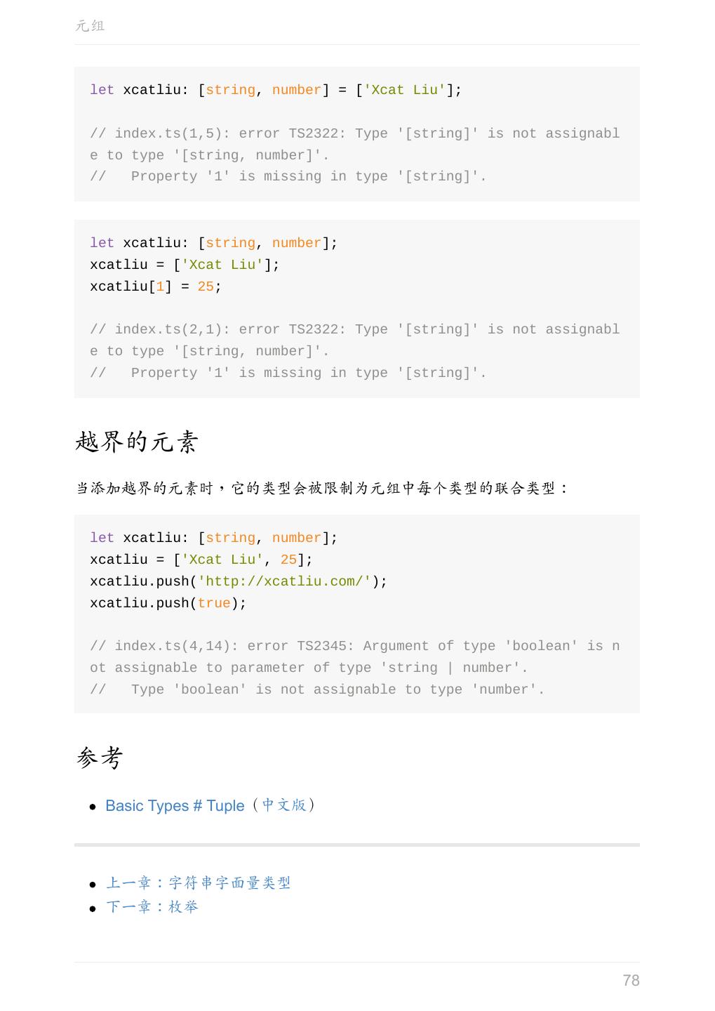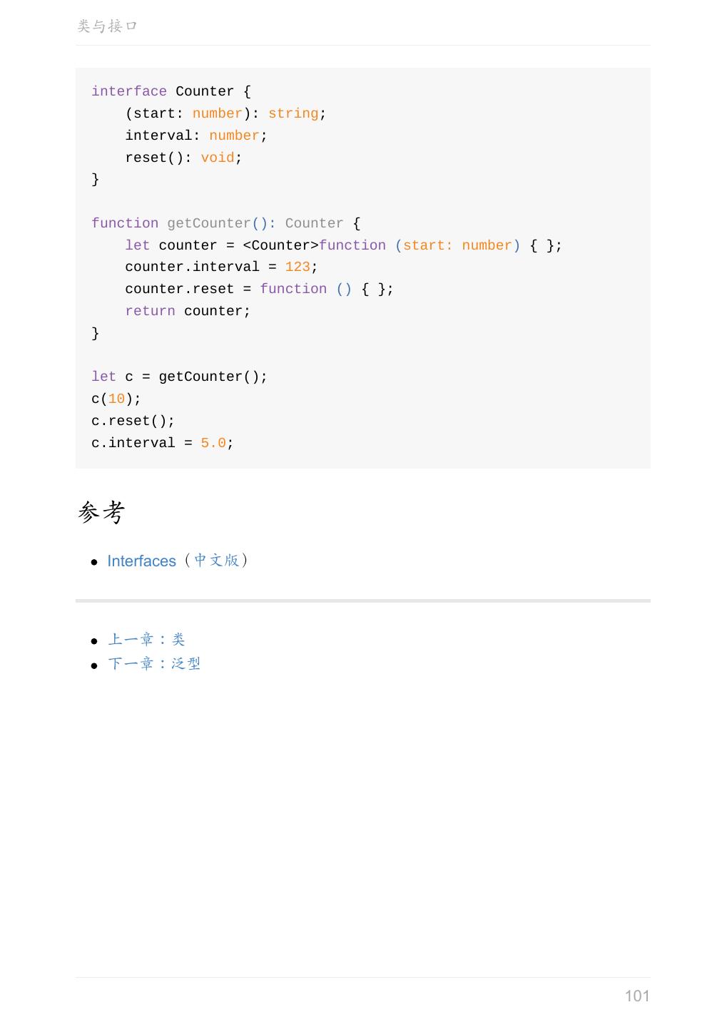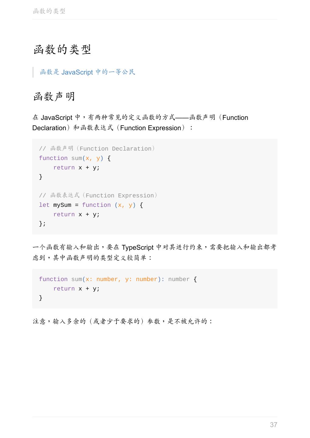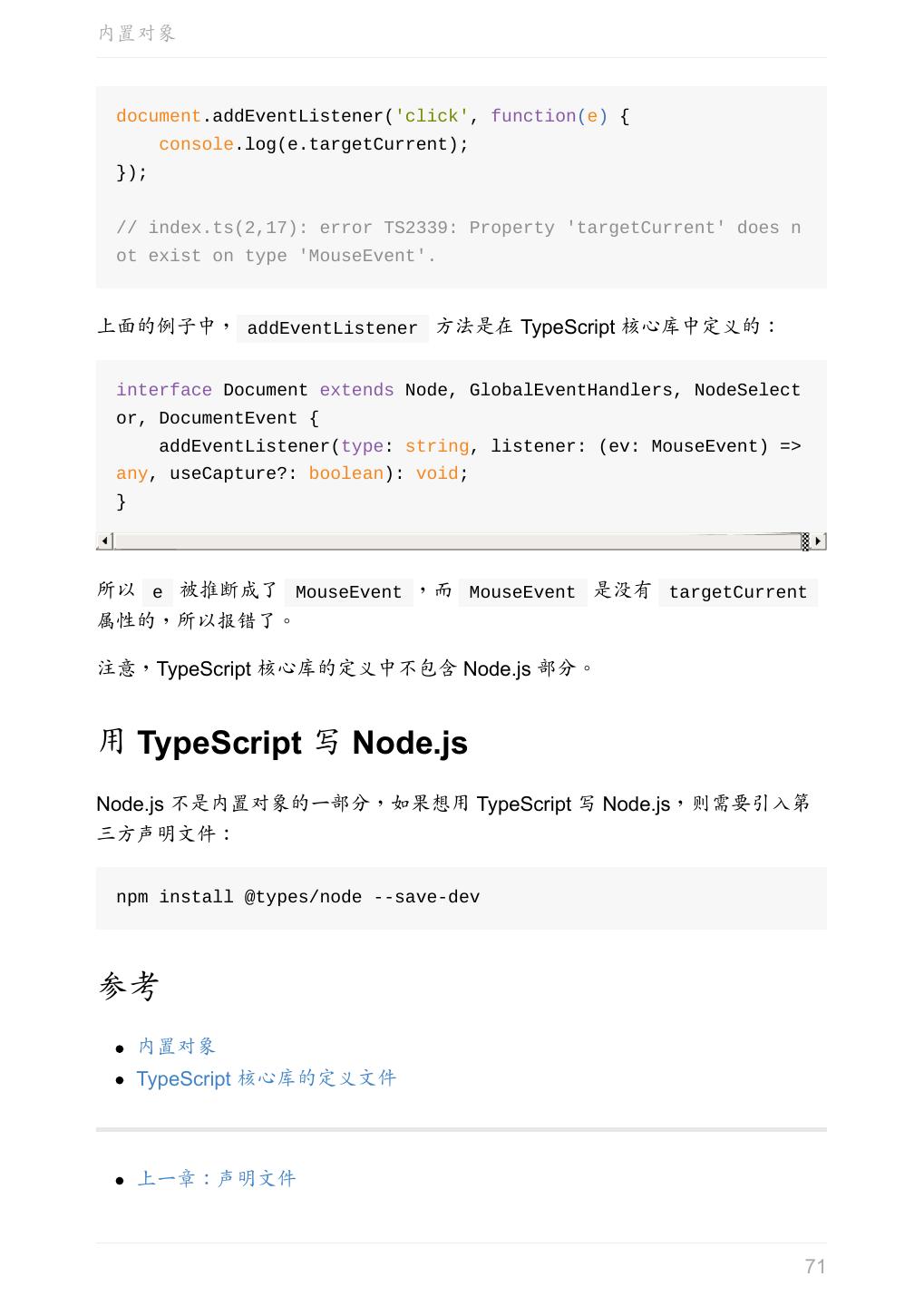 5 .前言 任意值 类型推论 联合类型 对象的类型——接口 数组的类型 函数的类型 类型断言 声明文件 内置对象 进阶 类型别名 字符串字面量类型 元组 枚举 类 类与接口 泛型 声明合并 扩展阅读 工程 代码检查 感谢 版权许可 本书采用「保持署名—非商用」创意共享 4.0 许可证。 只要保持原作者署名和非商用,您可以自由地阅读、分享、修改本书。 详细的法律条文请参见创意共享网站。 相关资料 TypeScript 官网 Handbook(中文版) ECMAScript 6 入门 5