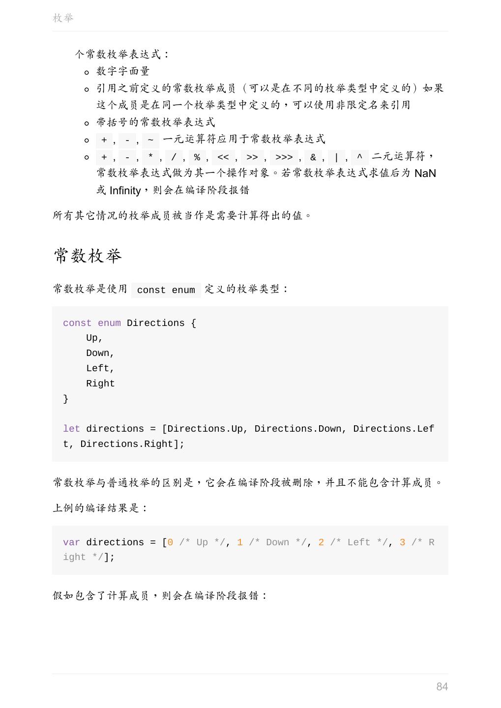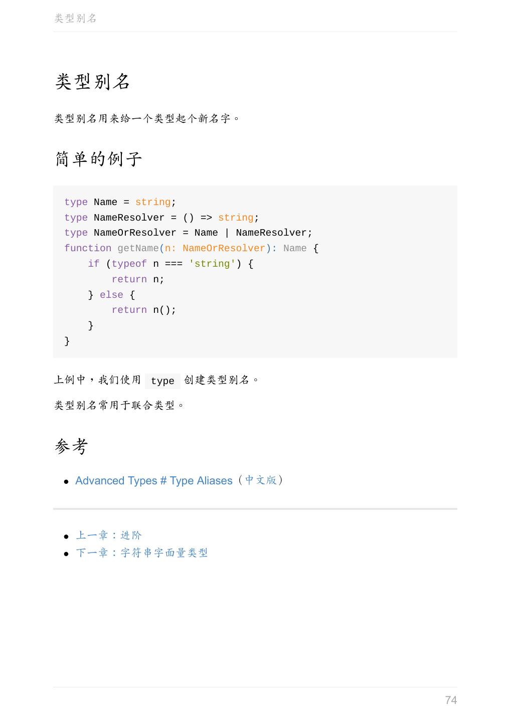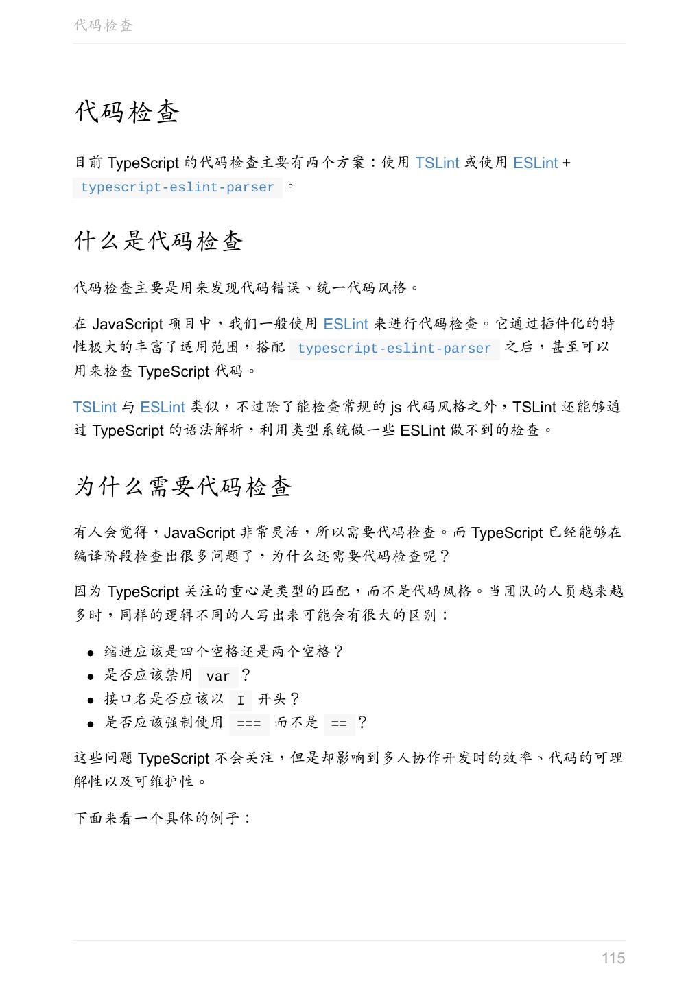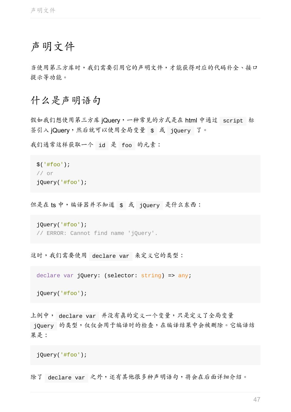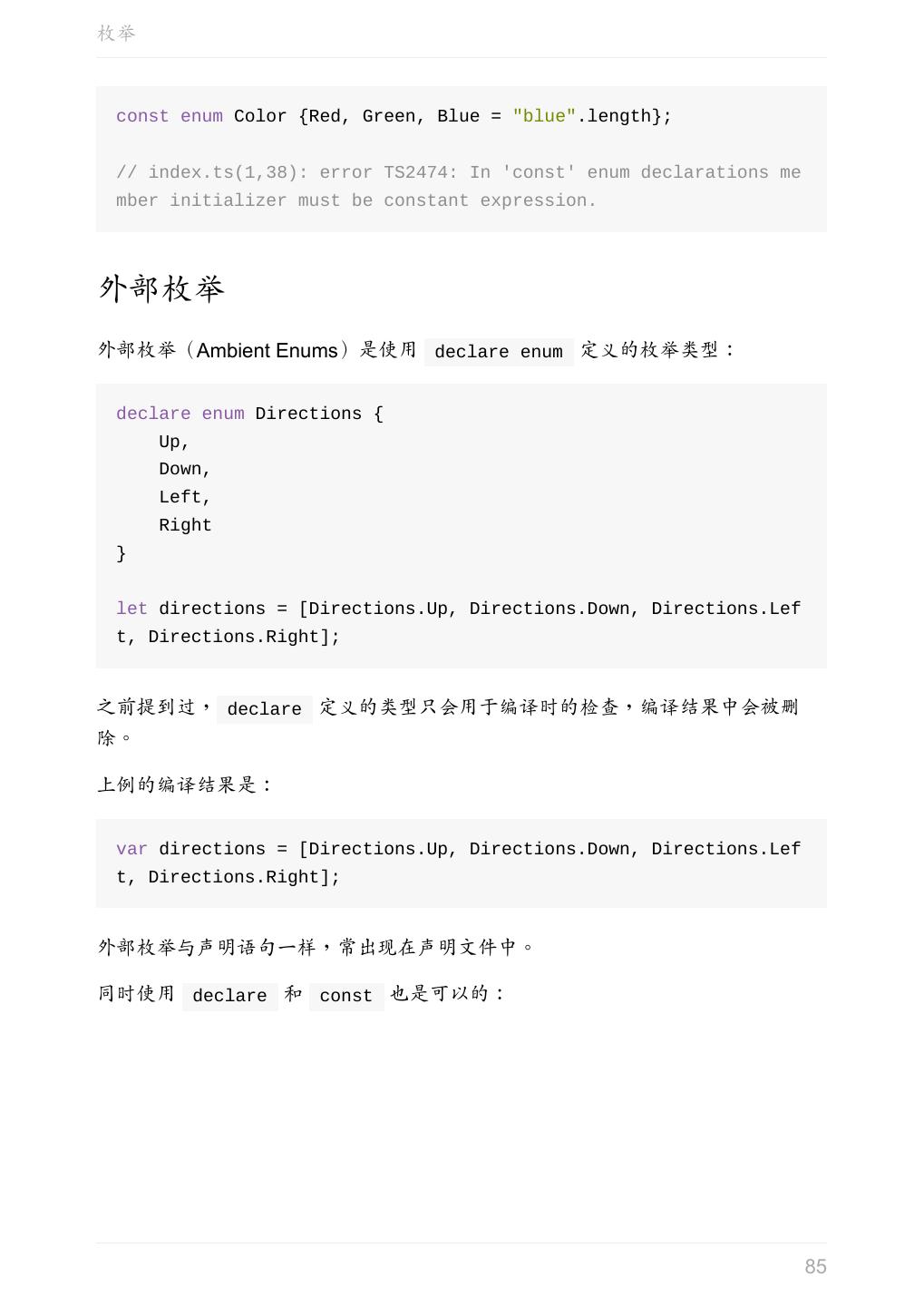 5 .前言 任意值 类型推论 联合类型 对象的类型——接口 数组的类型 函数的类型 类型断言 声明文件 内置对象 进阶 类型别名 字符串字面量类型 元组 枚举 类 类与接口 泛型 声明合并 扩展阅读 工程 代码检查 感谢 版权许可 本书采用「保持署名—非商用」创意共享 4.0 许可证。 只要保持原作者署名和非商用,您可以自由地阅读、分享、修改本书。 详细的法律条文请参见创意共享网站。 相关资料 TypeScript 官网 Handbook(中文版) ECMAScript 6 入门 5