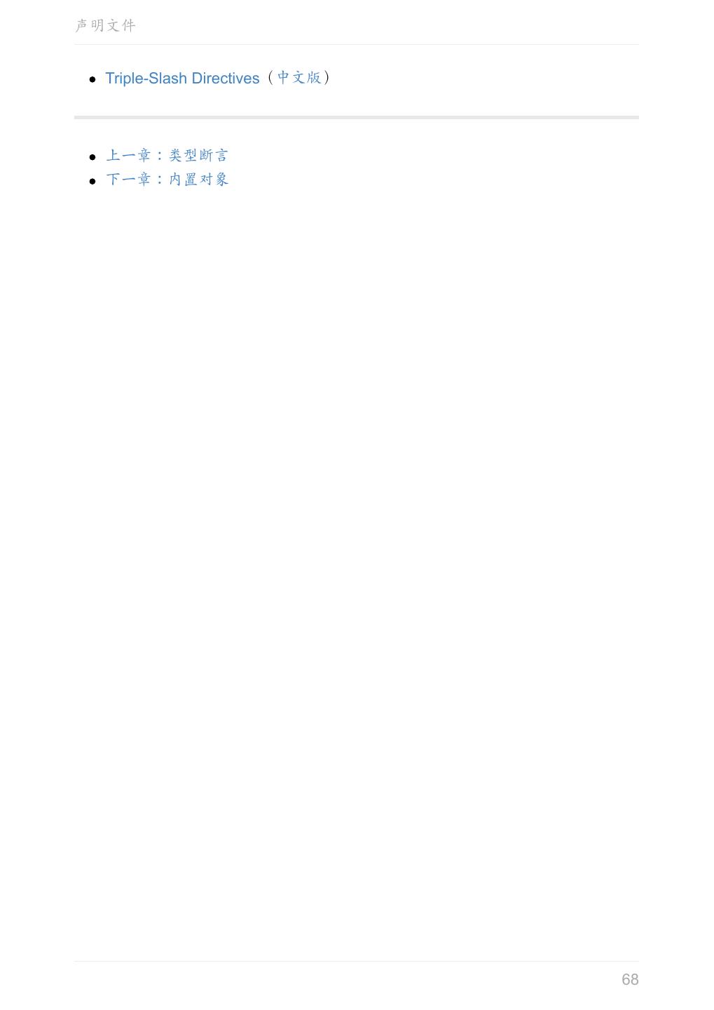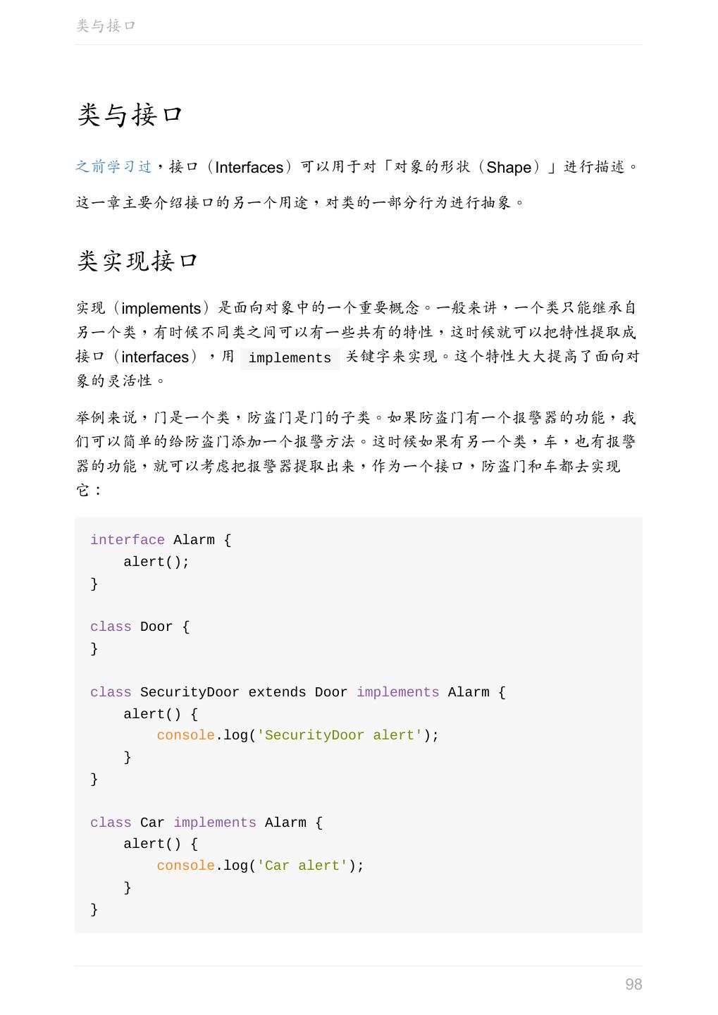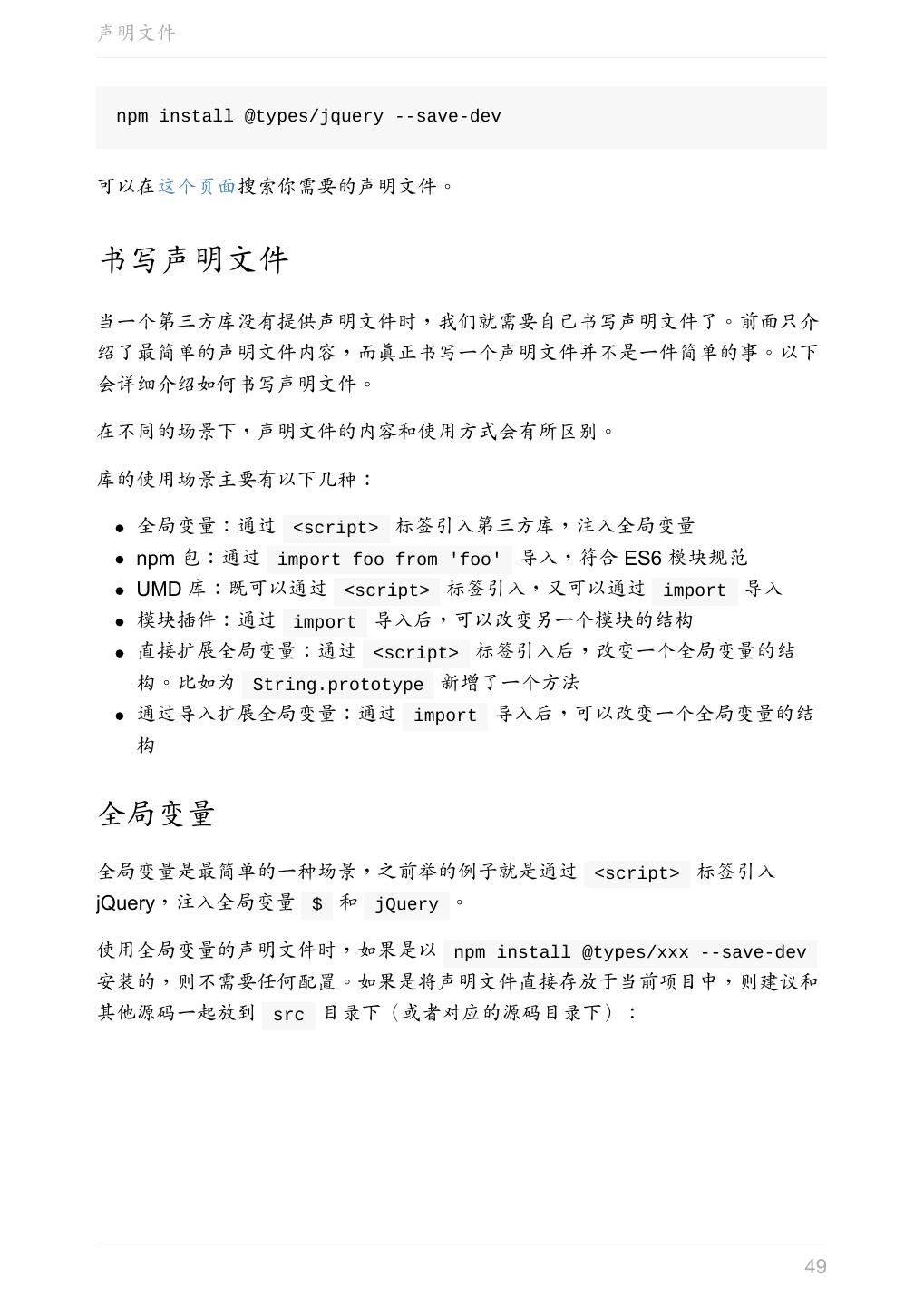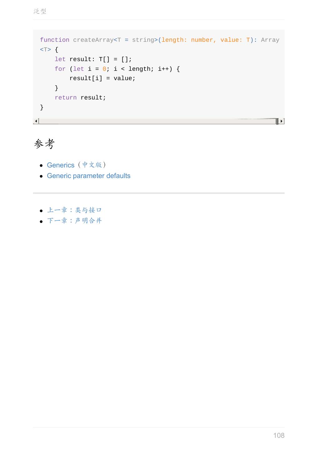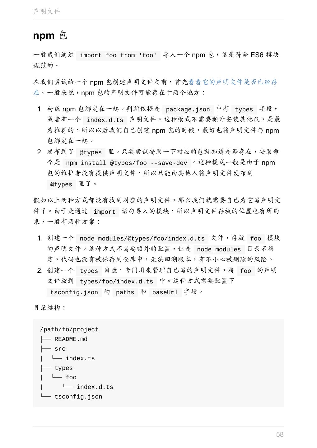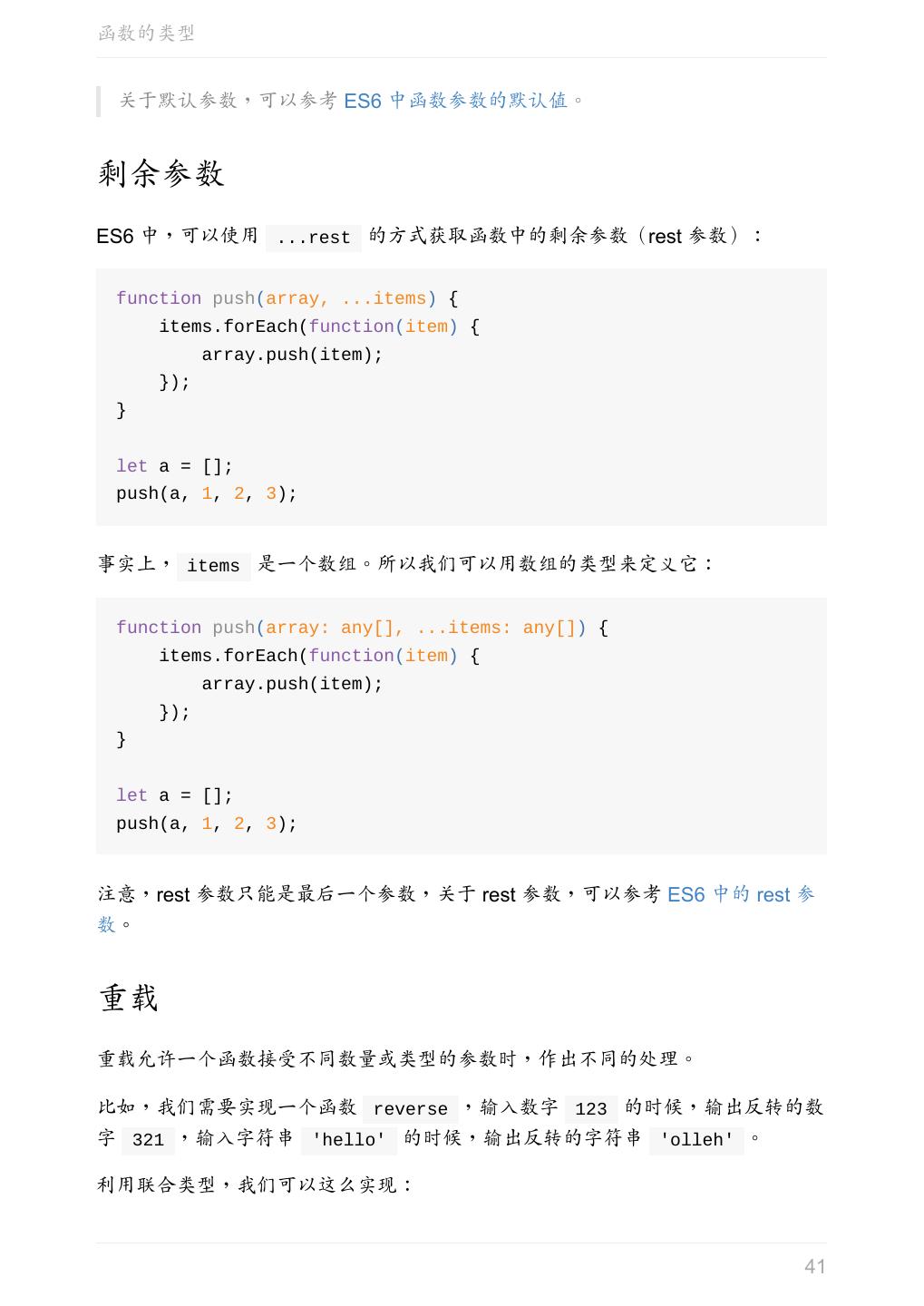 5 .前言 任意值 类型推论 联合类型 对象的类型——接口 数组的类型 函数的类型 类型断言 声明文件 内置对象 进阶 类型别名 字符串字面量类型 元组 枚举 类 类与接口 泛型 声明合并 扩展阅读 工程 代码检查 感谢 版权许可 本书采用「保持署名—非商用」创意共享 4.0 许可证。 只要保持原作者署名和非商用,您可以自由地阅读、分享、修改本书。 详细的法律条文请参见创意共享网站。 相关资料 TypeScript 官网 Handbook(中文版) ECMAScript 6 入门 5