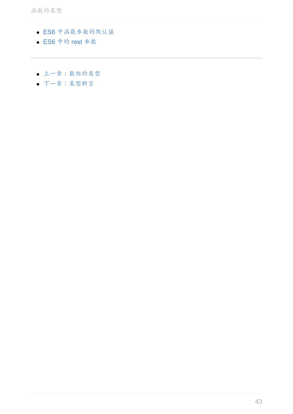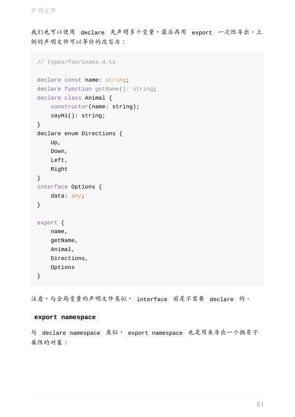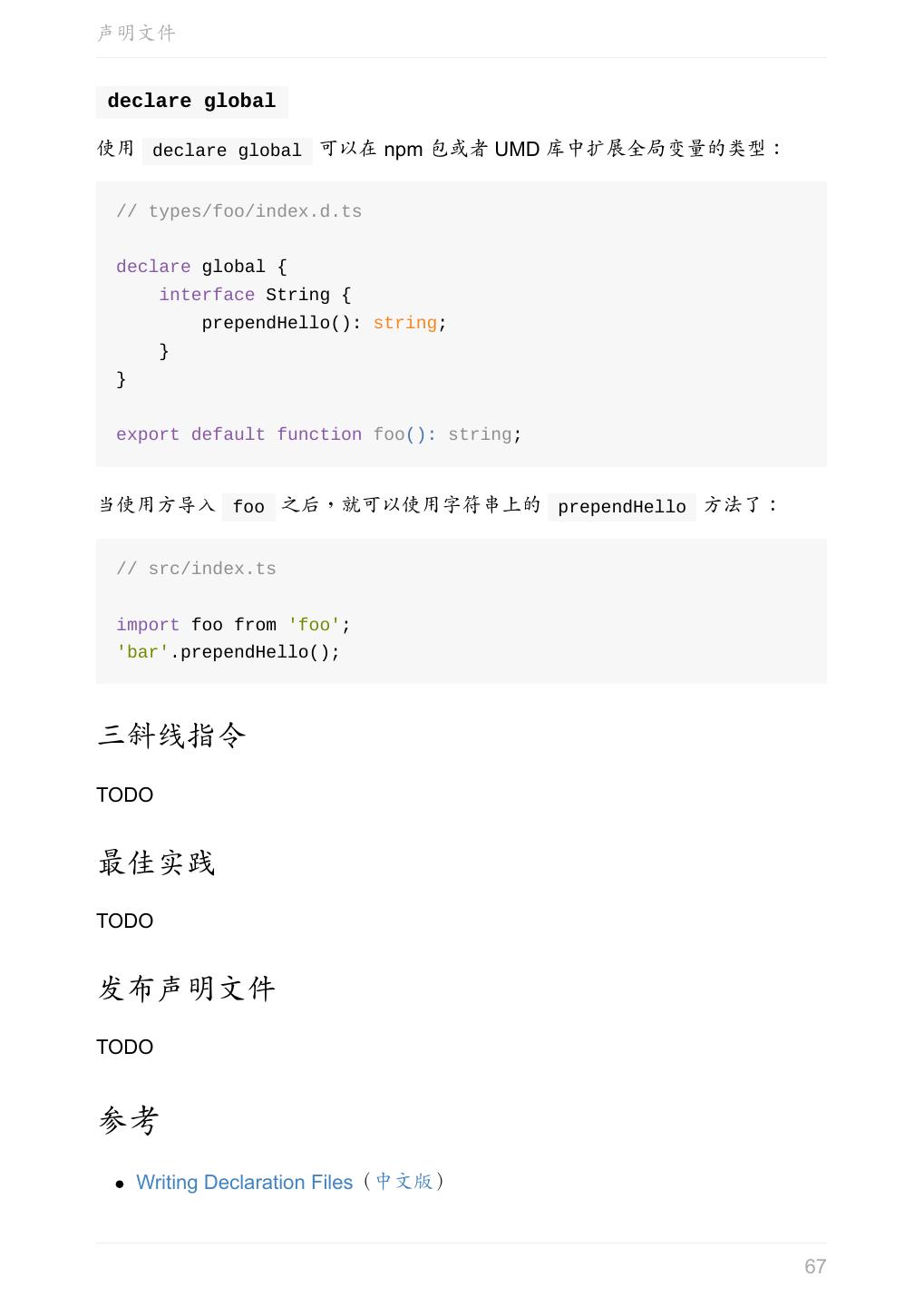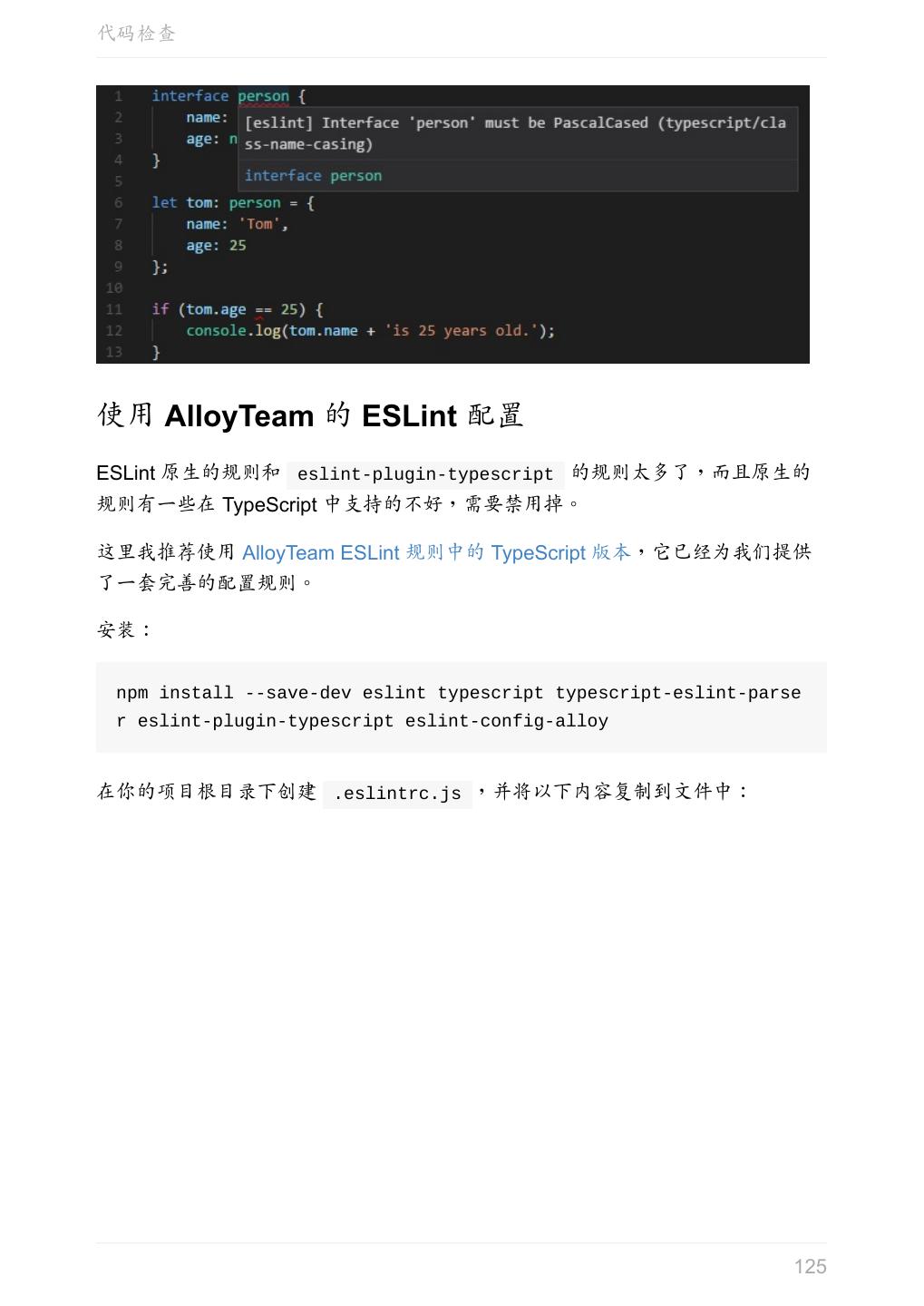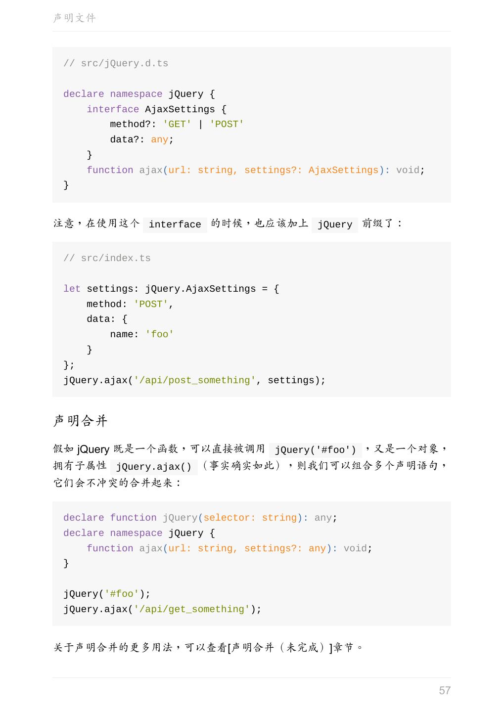 5 .前言 任意值 类型推论 联合类型 对象的类型——接口 数组的类型 函数的类型 类型断言 声明文件 内置对象 进阶 类型别名 字符串字面量类型 元组 枚举 类 类与接口 泛型 声明合并 扩展阅读 工程 代码检查 感谢 版权许可 本书采用「保持署名—非商用」创意共享 4.0 许可证。 只要保持原作者署名和非商用,您可以自由地阅读、分享、修改本书。 详细的法律条文请参见创意共享网站。 相关资料 TypeScript 官网 Handbook(中文版) ECMAScript 6 入门 5