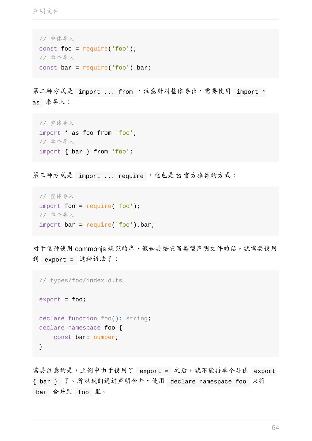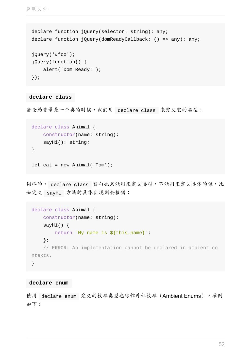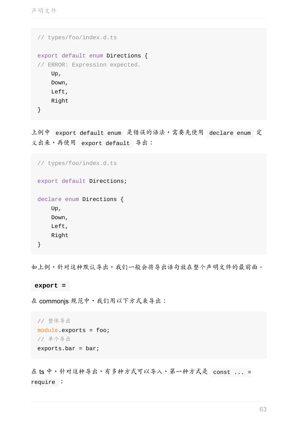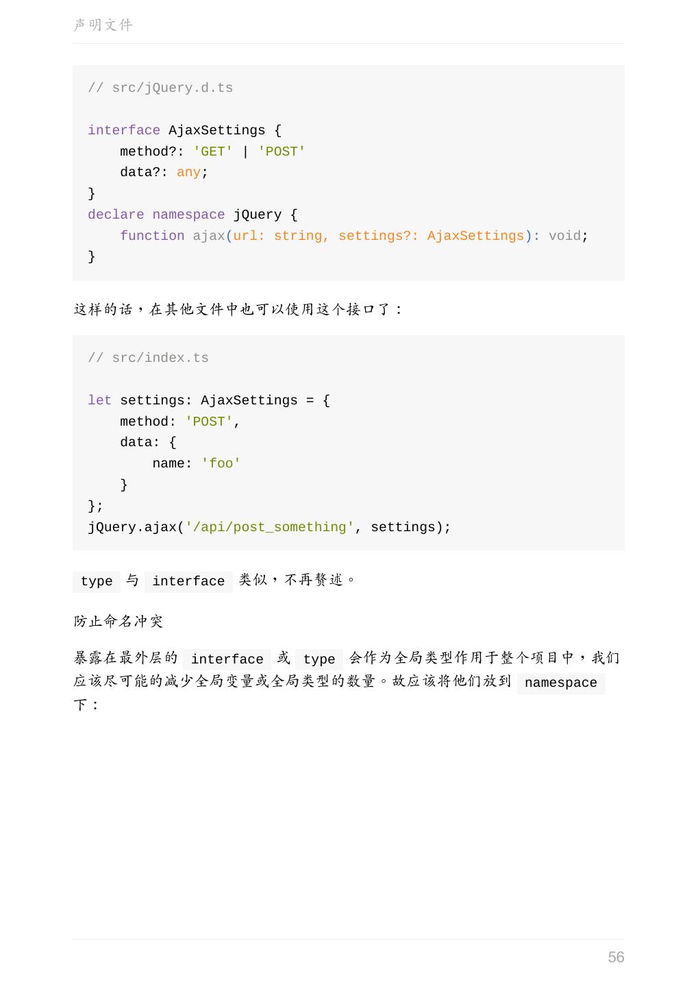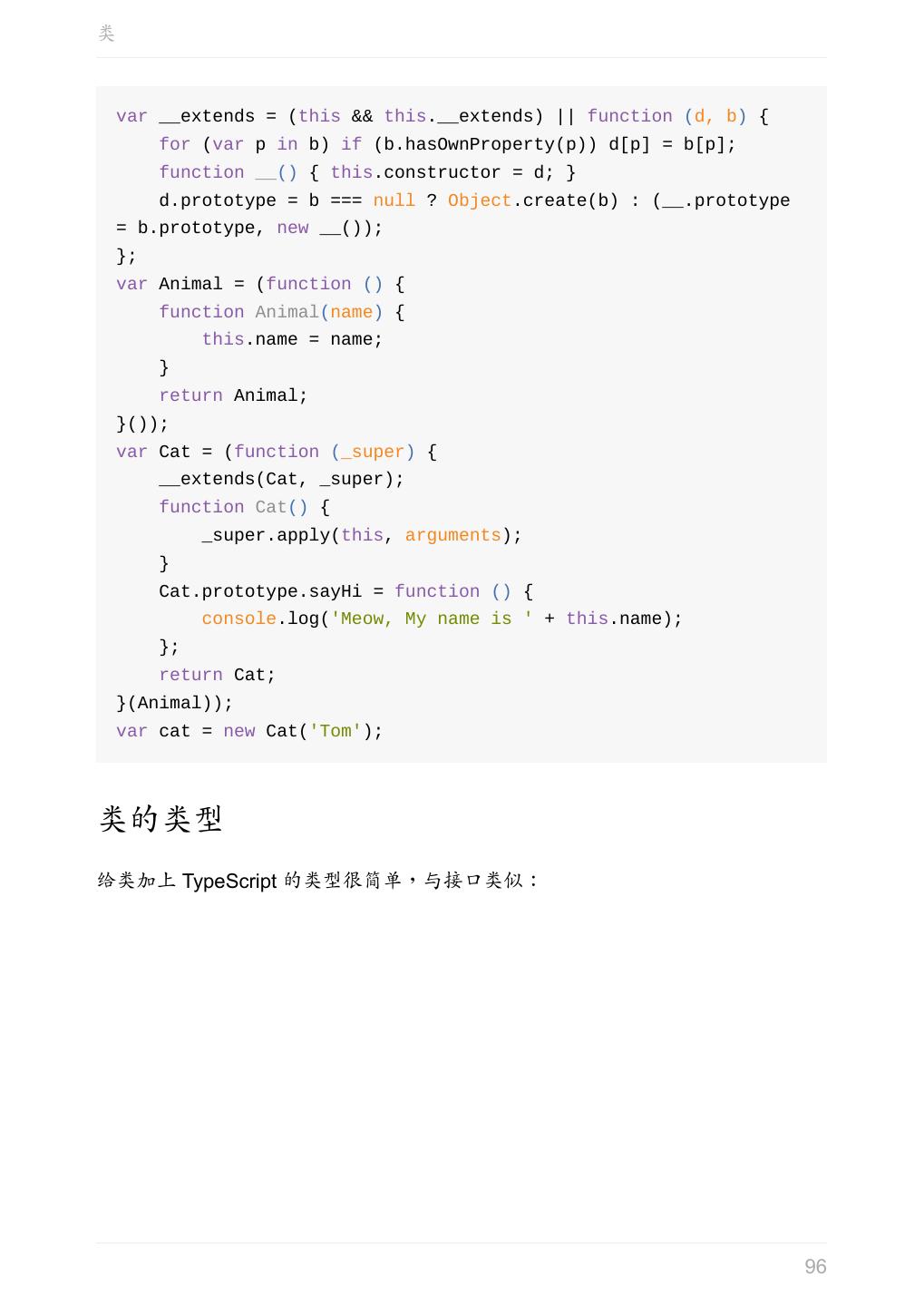 5 .前言 任意值 类型推论 联合类型 对象的类型——接口 数组的类型 函数的类型 类型断言 声明文件 内置对象 进阶 类型别名 字符串字面量类型 元组 枚举 类 类与接口 泛型 声明合并 扩展阅读 工程 代码检查 感谢 版权许可 本书采用「保持署名—非商用」创意共享 4.0 许可证。 只要保持原作者署名和非商用,您可以自由地阅读、分享、修改本书。 详细的法律条文请参见创意共享网站。 相关资料 TypeScript 官网 Handbook(中文版) ECMAScript 6 入门 5