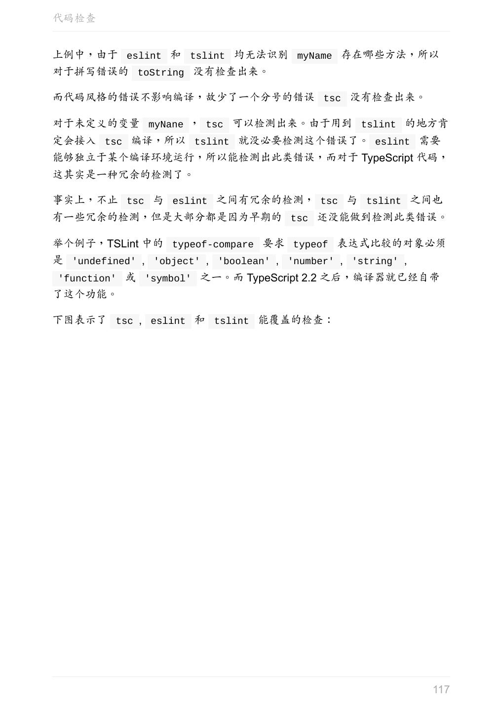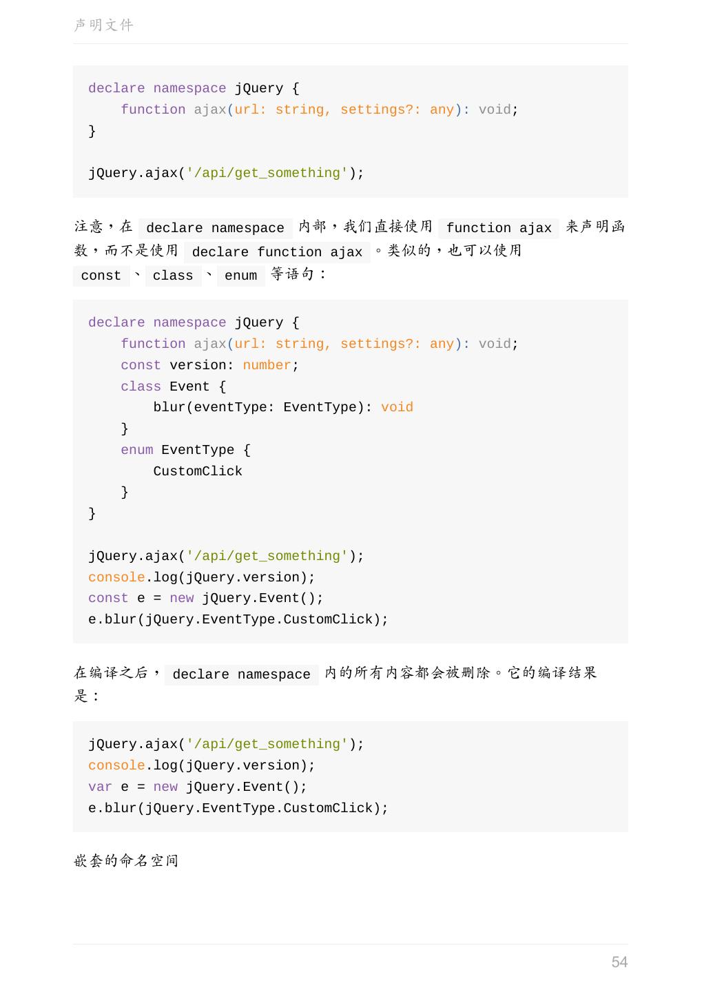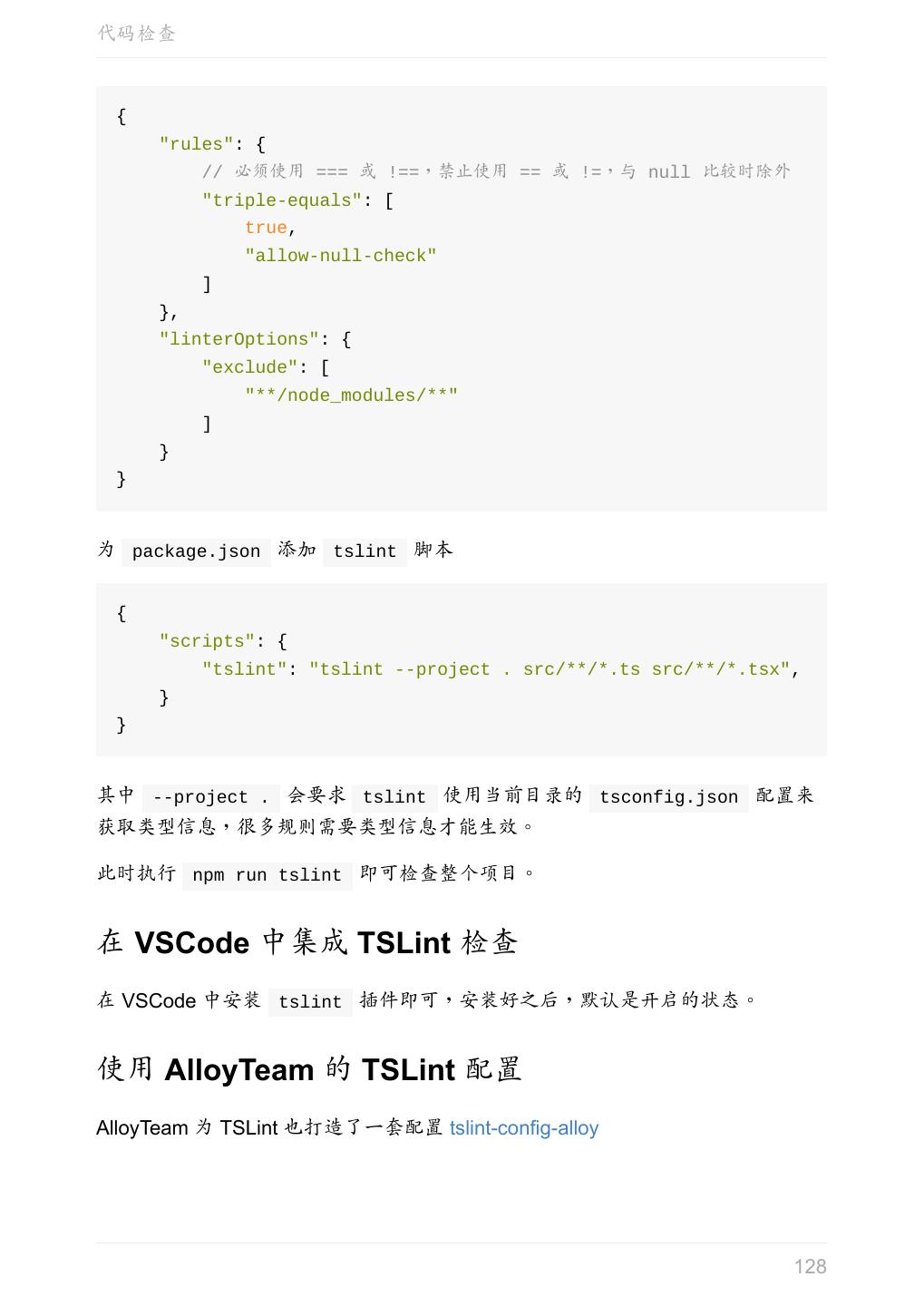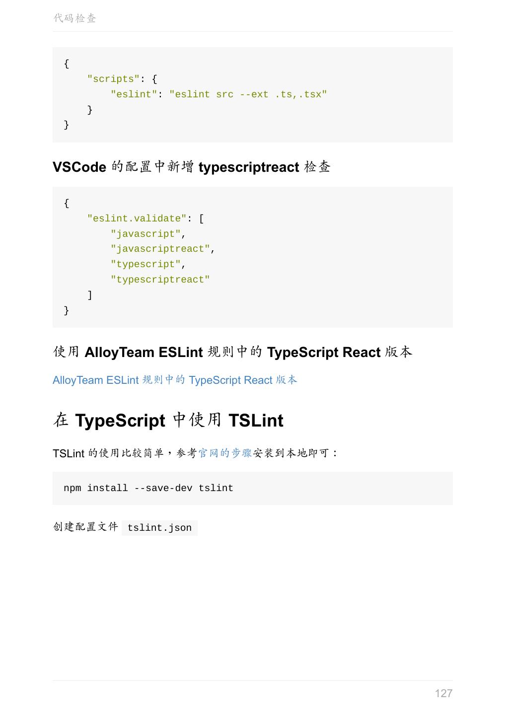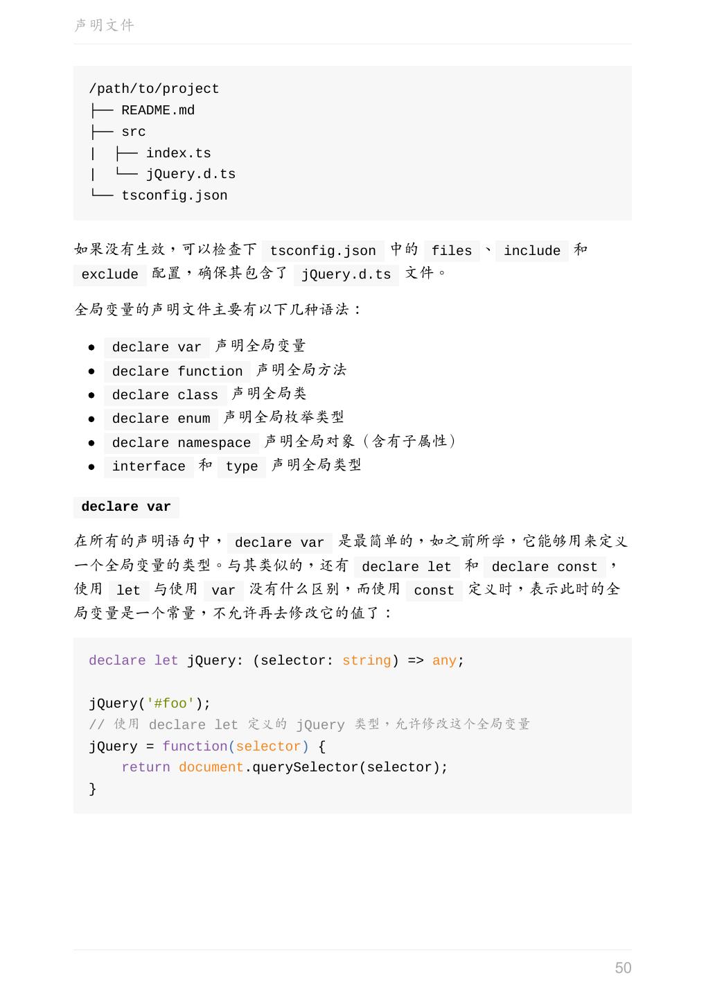 5 .前言 任意值 类型推论 联合类型 对象的类型——接口 数组的类型 函数的类型 类型断言 声明文件 内置对象 进阶 类型别名 字符串字面量类型 元组 枚举 类 类与接口 泛型 声明合并 扩展阅读 工程 代码检查 感谢 版权许可 本书采用「保持署名—非商用」创意共享 4.0 许可证。 只要保持原作者署名和非商用,您可以自由地阅读、分享、修改本书。 详细的法律条文请参见创意共享网站。 相关资料 TypeScript 官网 Handbook(中文版) ECMAScript 6 入门 5