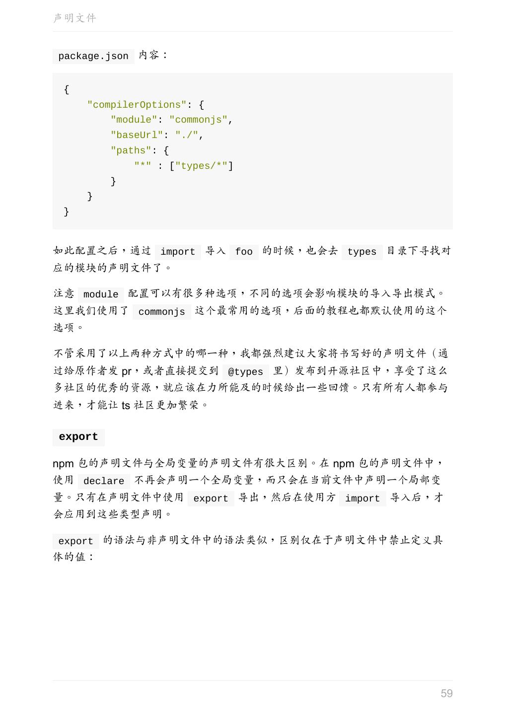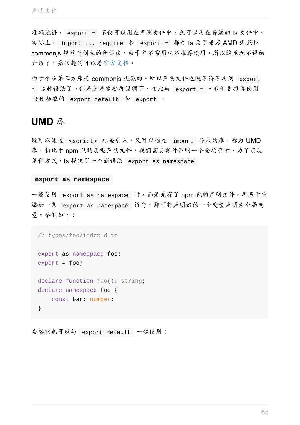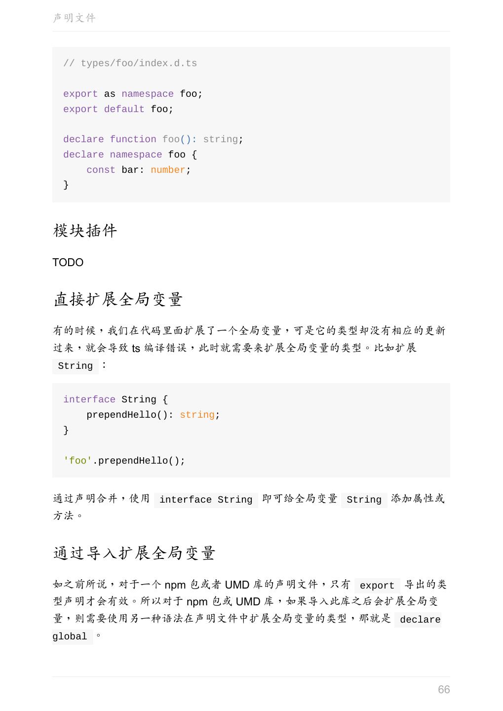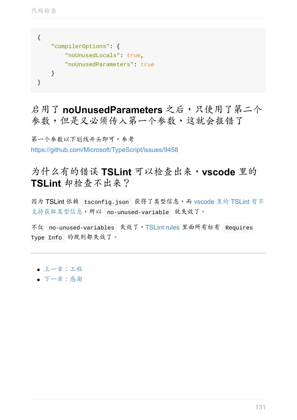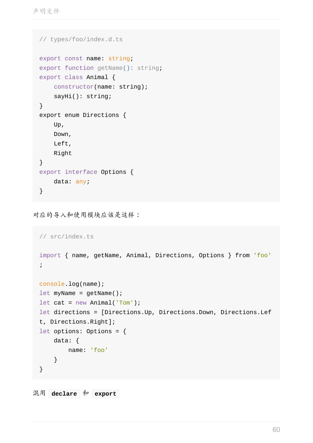 5 .前言 任意值 类型推论 联合类型 对象的类型——接口 数组的类型 函数的类型 类型断言 声明文件 内置对象 进阶 类型别名 字符串字面量类型 元组 枚举 类 类与接口 泛型 声明合并 扩展阅读 工程 代码检查 感谢 版权许可 本书采用「保持署名—非商用」创意共享 4.0 许可证。 只要保持原作者署名和非商用,您可以自由地阅读、分享、修改本书。 详细的法律条文请参见创意共享网站。 相关资料 TypeScript 官网 Handbook(中文版) ECMAScript 6 入门 5