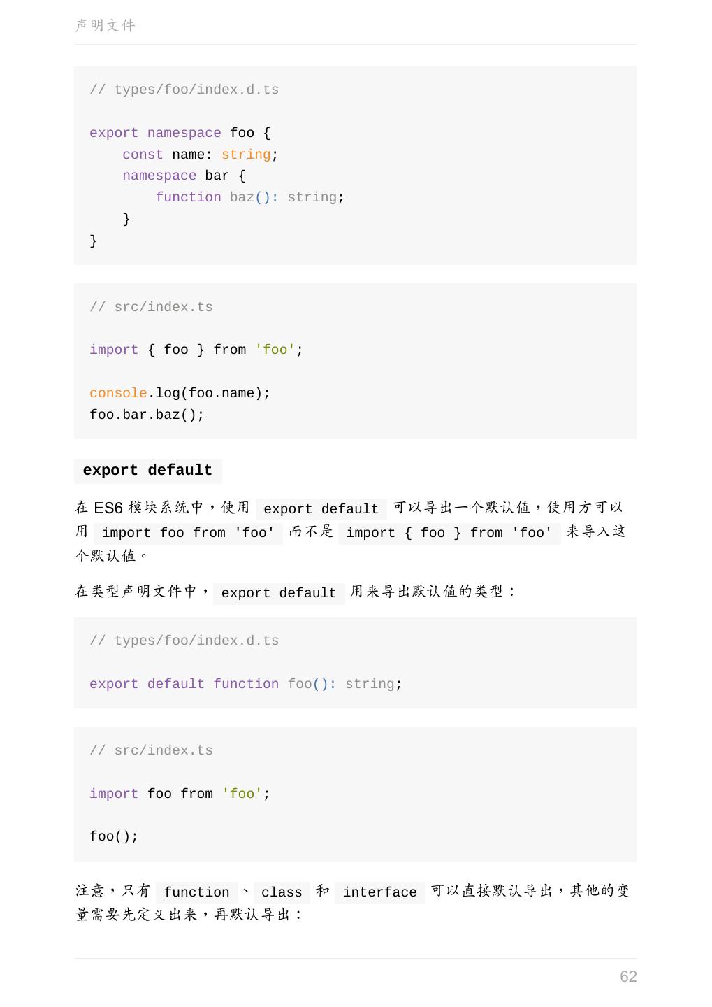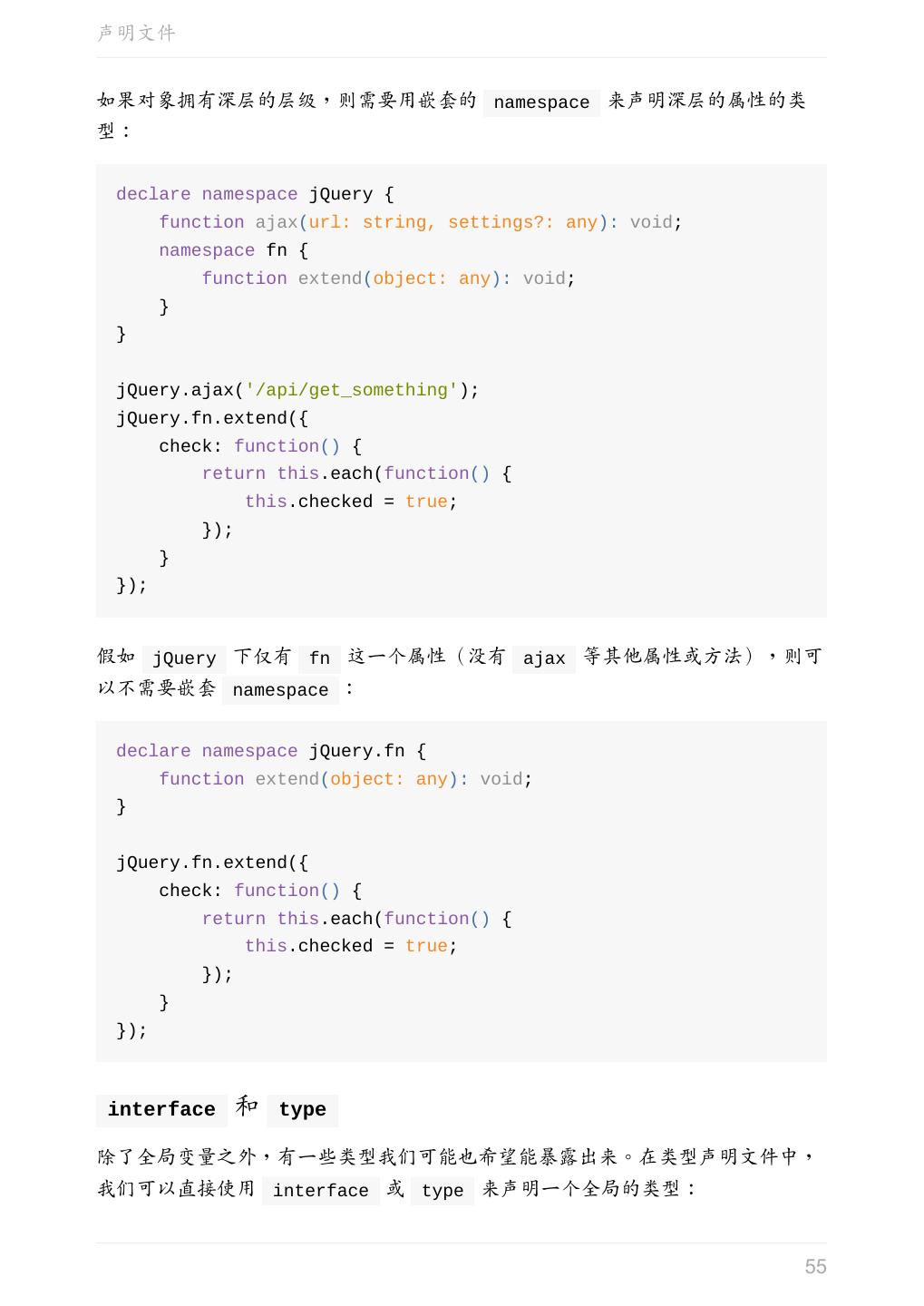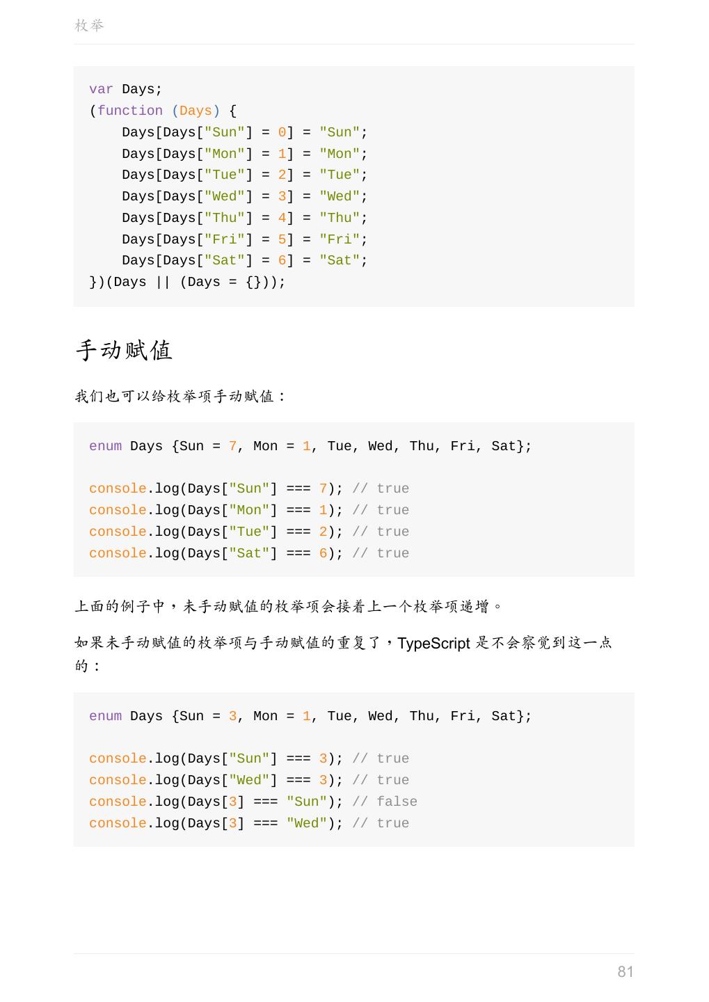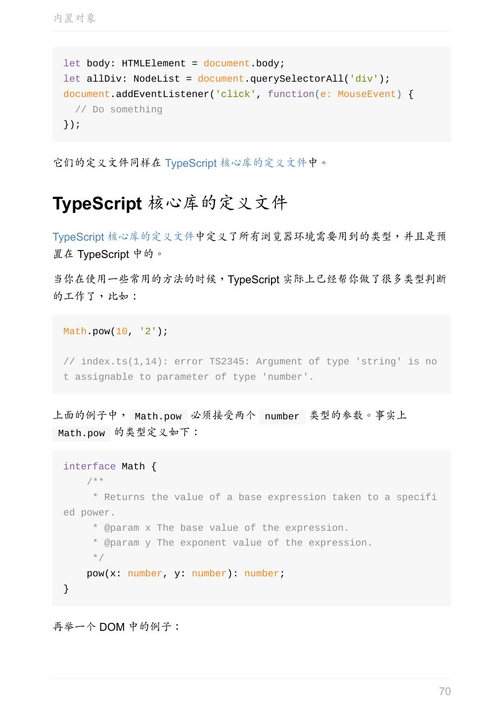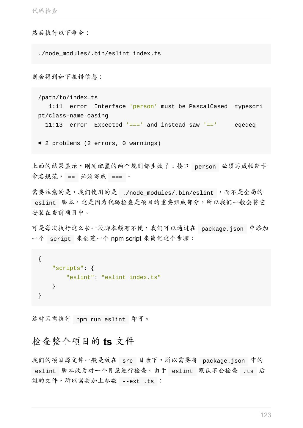 5 .前言 任意值 类型推论 联合类型 对象的类型——接口 数组的类型 函数的类型 类型断言 声明文件 内置对象 进阶 类型别名 字符串字面量类型 元组 枚举 类 类与接口 泛型 声明合并 扩展阅读 工程 代码检查 感谢 版权许可 本书采用「保持署名—非商用」创意共享 4.0 许可证。 只要保持原作者署名和非商用,您可以自由地阅读、分享、修改本书。 详细的法律条文请参见创意共享网站。 相关资料 TypeScript 官网 Handbook(中文版) ECMAScript 6 入门 5