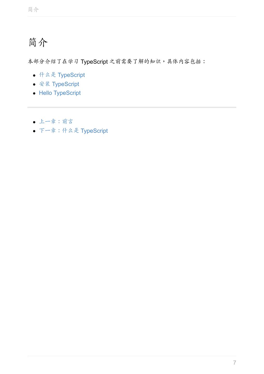 7 .简介 简介 本部分介绍了在学习 TypeScript 之前需要了解的知识,具体内容包括: 什么是 TypeScript 安装 TypeScript Hello TypeScript 上一章:前言 下一章:什么是 TypeScript 7