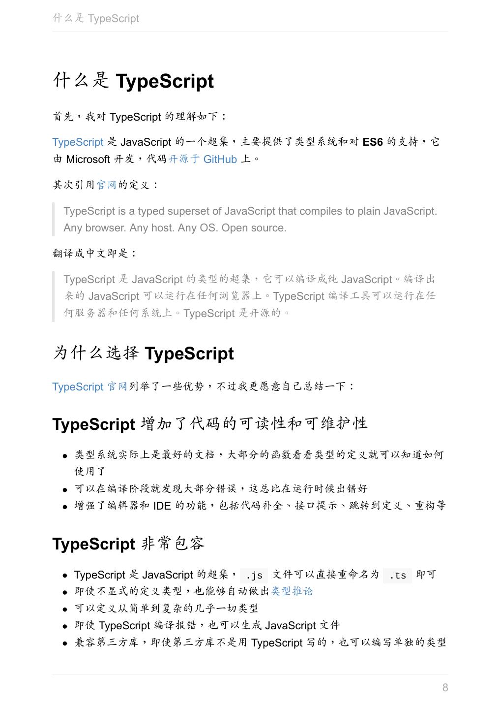 8 .什么是 TypeScript 什么是 TypeScript 首先,我对 TypeScript 的理解如下: TypeScript 是 JavaScript 的一个超集,主要提供了类型系统和对 ES6 的支持,它 由 Microsoft 开发,代码开源于 GitHub 上。 其次引用官网的定义: TypeScript is a typed superset of JavaScript that compiles to plain JavaScript. Any browser. Any host. Any OS. Open source. 翻译成中文即是: TypeScript 是 JavaScript 的类型的超集,它可以编译成纯 JavaScript。编译出 来的 JavaScript 可以运行在任何浏览器上。TypeScript 编译工具可以运行在任 何服务器和任何系统上。TypeScript 是开源的。 为什么选择 TypeScript TypeScript 官网列举了一些优势,不过我更愿意自己总结一下: TypeScript 增加了代码的可读性和可维护性 类型系统实际上是最好的文档,大部分的函数看看类型的定义就可以知道如何 使用了 可以在编译阶段就发现大部分错误,这总比在运行时候出错好 增强了编辑器和 IDE 的功能,包括代码补全、接口提示、跳转到定义、重构等 TypeScript 非常包容 TypeScript 是 JavaScript 的超集, .js 文件可以直接重命名为 .ts 即可 即使不显式的定义类型,也能够自动做出类型推论 可以定义从简单到复杂的几乎一切类型 即使 TypeScript 编译报错,也可以生成 JavaScript 文件 兼容第三方库,即使第三方库不是用 TypeScript 写的,也可以编写单独的类型 8
