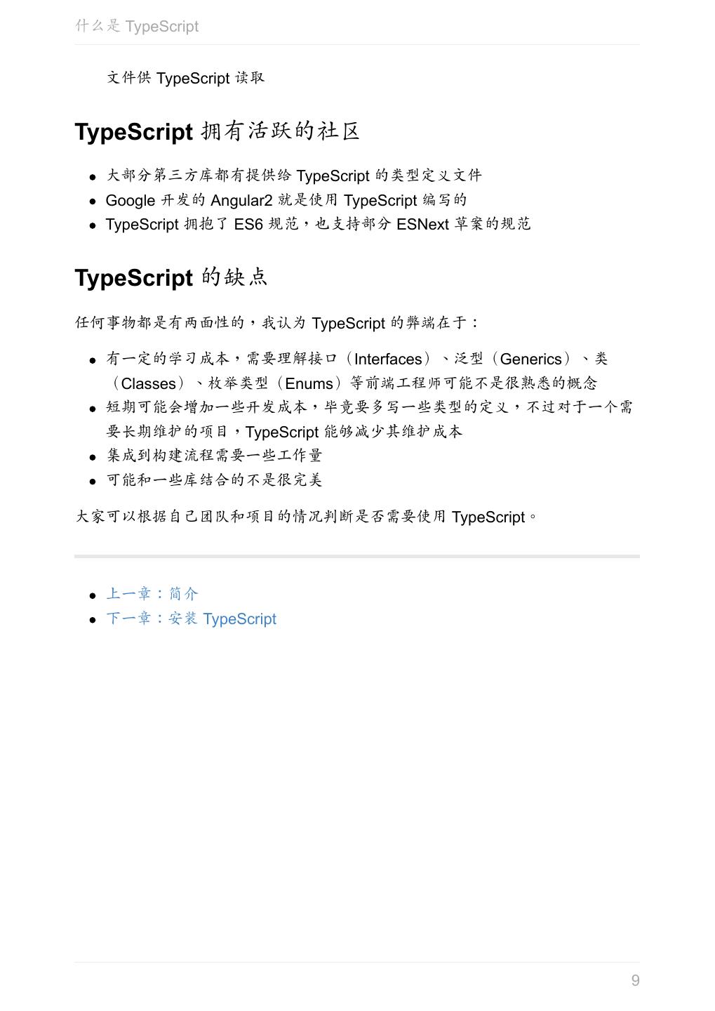 9 .什么是 TypeScript 文件供 TypeScript 读取 TypeScript 拥有活跃的社区 大部分第三方库都有提供给 TypeScript 的类型定义文件 Google 开发的 Angular2 就是使用 TypeScript 编写的 TypeScript 拥抱了 ES6 规范,也支持部分 ESNext 草案的规范 TypeScript 的缺点 任何事物都是有两面性的,我认为 TypeScript 的弊端在于: 有一定的学习成本,需要理解接口(Interfaces)、泛型(Generics)、类 (Classes)、枚举类型(Enums)等前端工程师可能不是很熟悉的概念 短期可能会增加一些开发成本,毕竟要多写一些类型的定义,不过对于一个需 要长期维护的项目,TypeScript 能够减少其维护成本 集成到构建流程需要一些工作量 可能和一些库结合的不是很完美 大家可以根据自己团队和项目的情况判断是否需要使用 TypeScript。 上一章:简介 下一章:安装 TypeScript 9