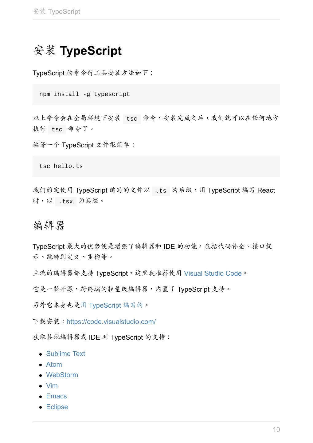 10 .安装 TypeScript 安装 TypeScript TypeScript 的命令行工具安装方法如下: npm install -g typescript 以上命令会在全局环境下安装 tsc 命令,安装完成之后,我们就可以在任何地方 执行 tsc 命令了。 编译一个 TypeScript 文件很简单: tsc hello.ts 我们约定使用 TypeScript 编写的文件以 .ts 为后缀,用 TypeScript 编写 React 时,以 .tsx 为后缀。 编辑器 TypeScript 最大的优势便是增强了编辑器和 IDE 的功能,包括代码补全、接口提 示、跳转到定义、重构等。 主流的编辑器都支持 TypeScript,这里我推荐使用 Visual Studio Code。 它是一款开源,跨终端的轻量级编辑器,内置了 TypeScript 支持。 另外它本身也是用 TypeScript 编写的。 下载安装:https://code.visualstudio.com/ 获取其他编辑器或 IDE 对 TypeScript 的支持: Sublime Text Atom WebStorm Vim Emacs Eclipse 10