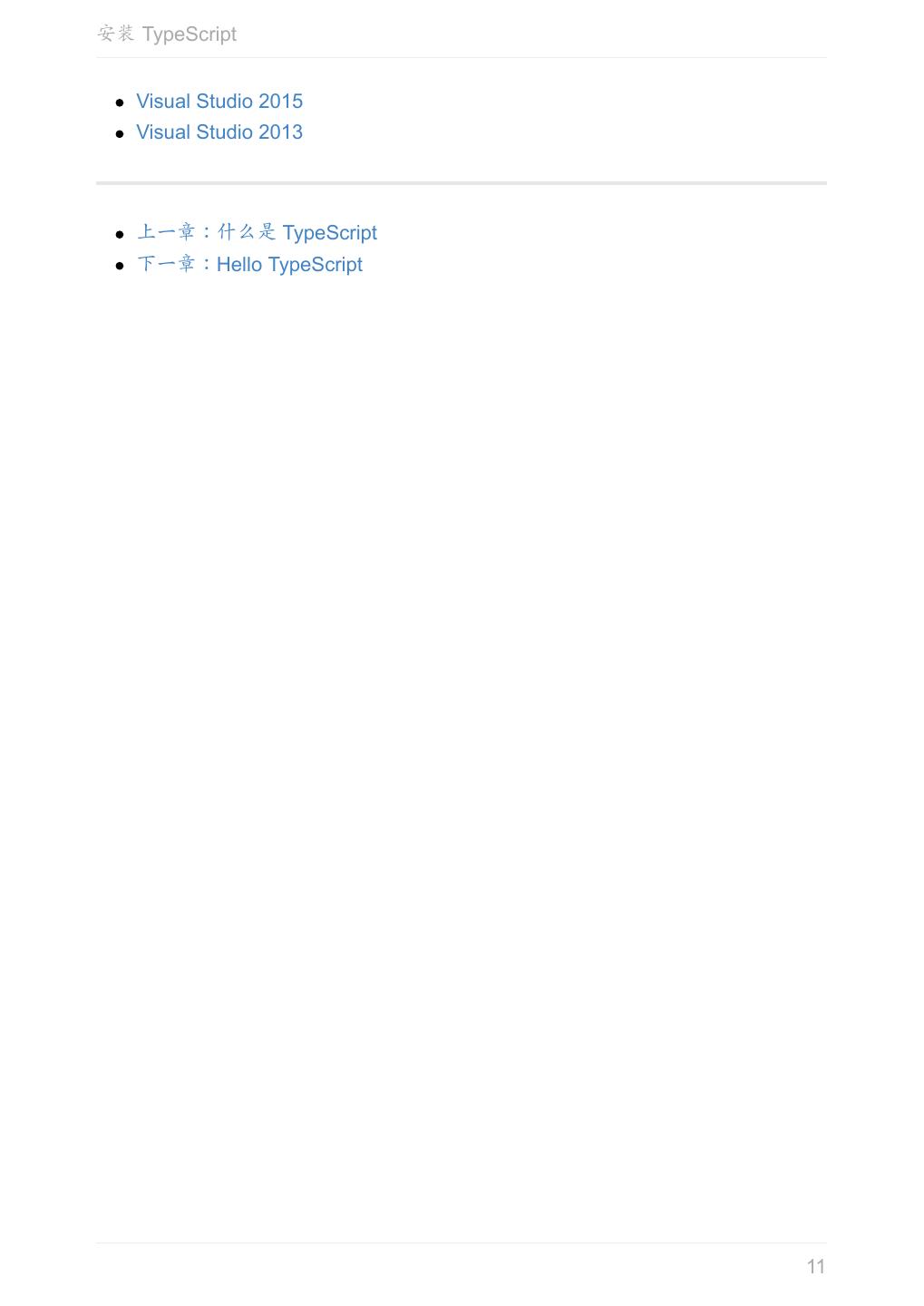 11 .安装 TypeScript Visual Studio 2015 Visual Studio 2013 上一章:什么是 TypeScript 下一章:Hello TypeScript 11
