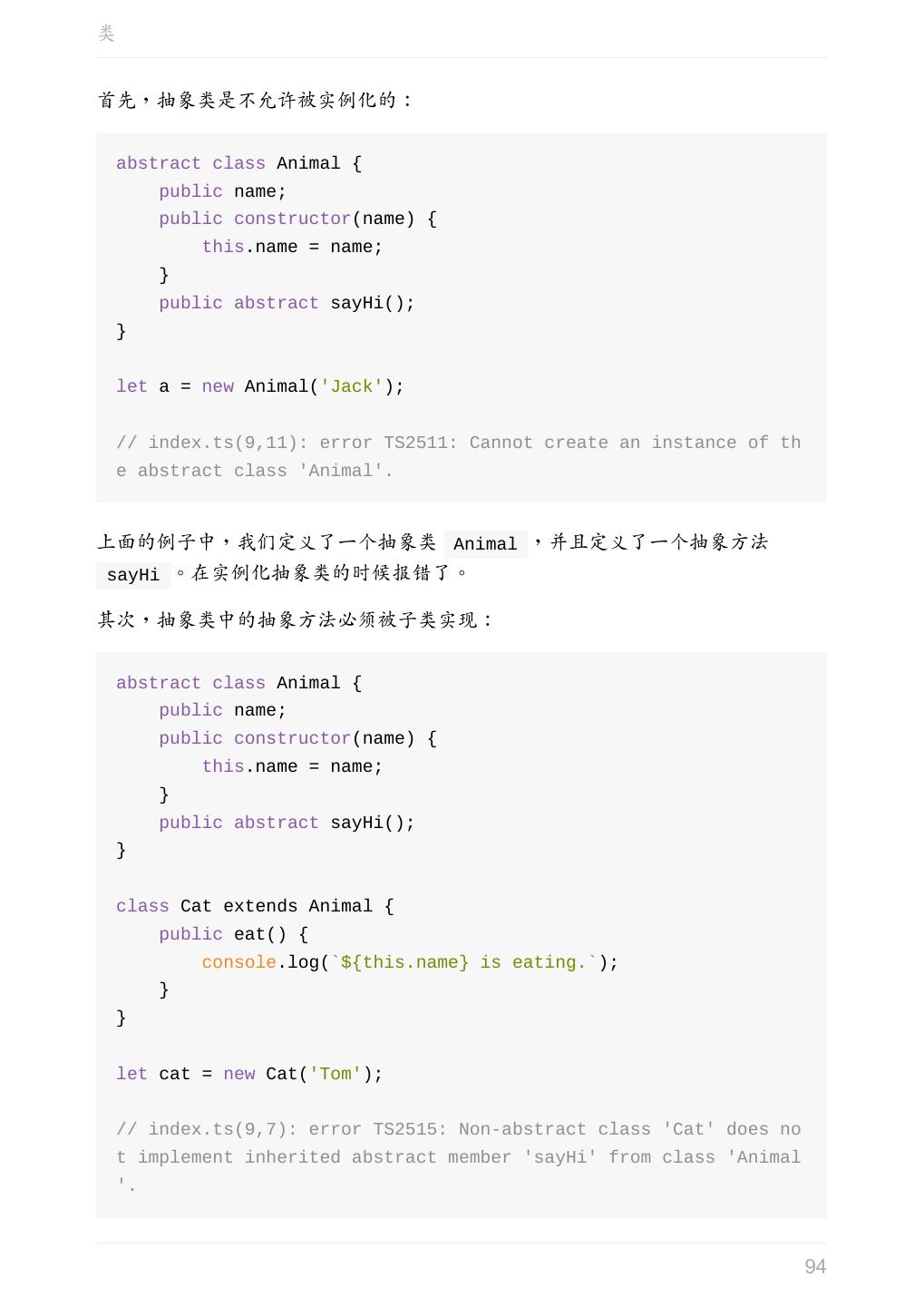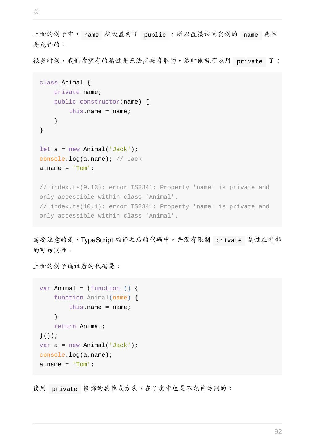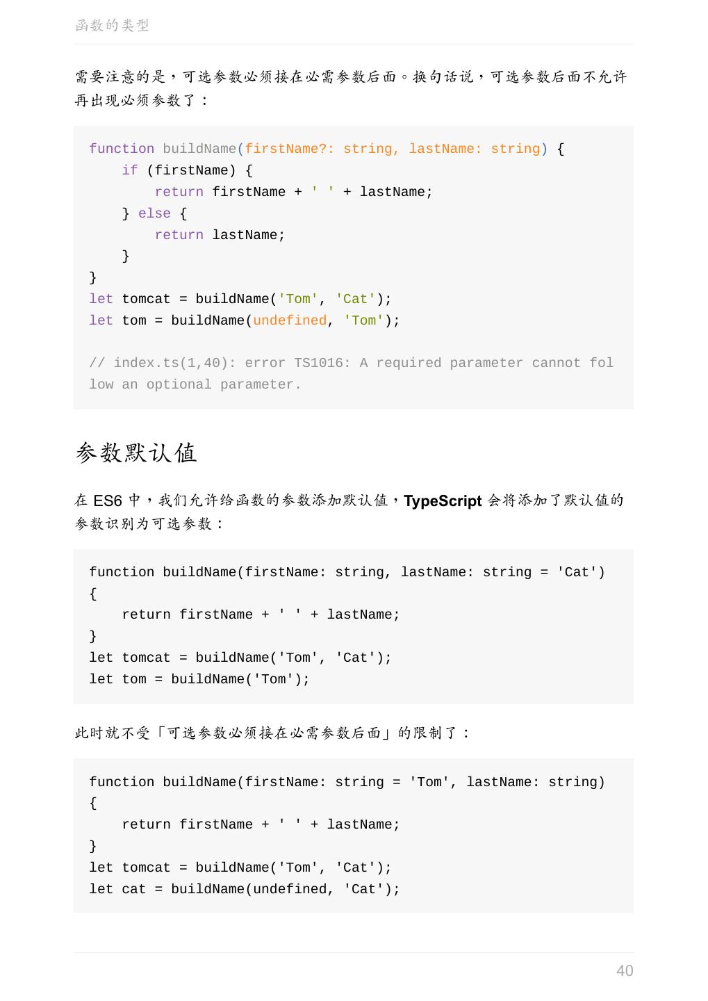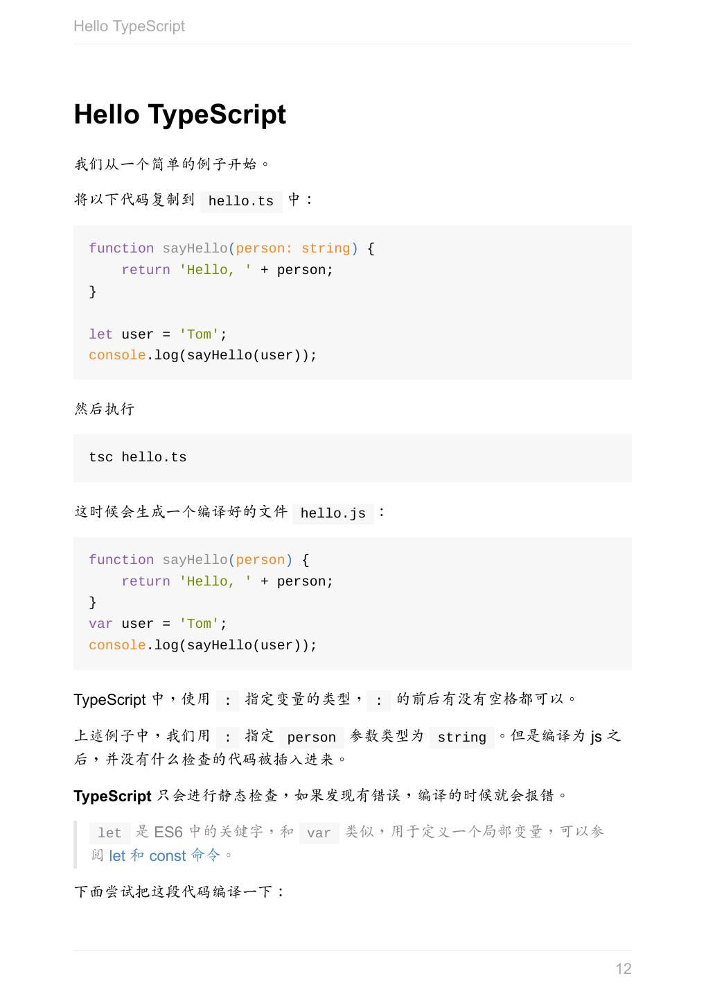 12 .Hello TypeScript Hello TypeScript 我们从一个简单的例子开始。 将以下代码复制到 hello.ts 中: function sayHello(person: string) { return 'Hello, ' + person; } let user = 'Tom'; console.log(sayHello(user)); 然后执行 tsc hello.ts 这时候会生成一个编译好的文件 hello.js : function sayHello(person) { return 'Hello, ' + person; } var user = 'Tom'; console.log(sayHello(user)); TypeScript 中,使用 : 指定变量的类型, : 的前后有没有空格都可以。 上述例子中,我们用 : 指定 person 参数类型为 string 。但是编译为 js 之 后,并没有什么检查的代码被插入进来。 TypeScript 只会进行静态检查,如果发现有错误,编译的时候就会报错。 let 是 ES6 中的关键字,和 var 类似,用于定义一个局部变量,可以参 阅 let 和 const 命令。 下面尝试把这段代码编译一下: 12
