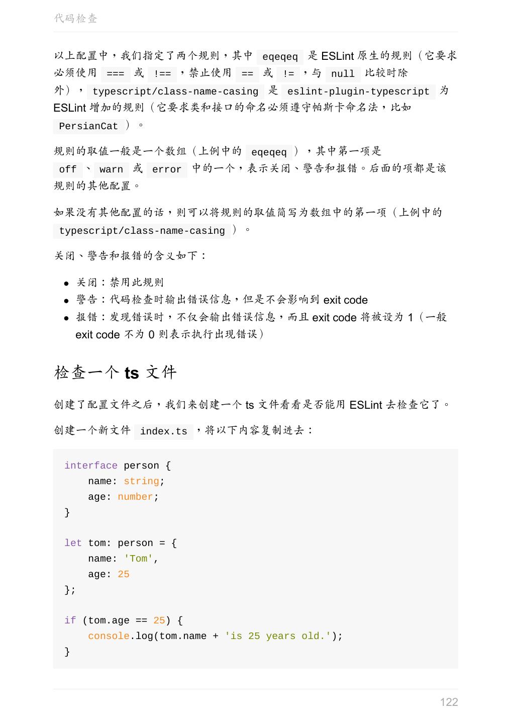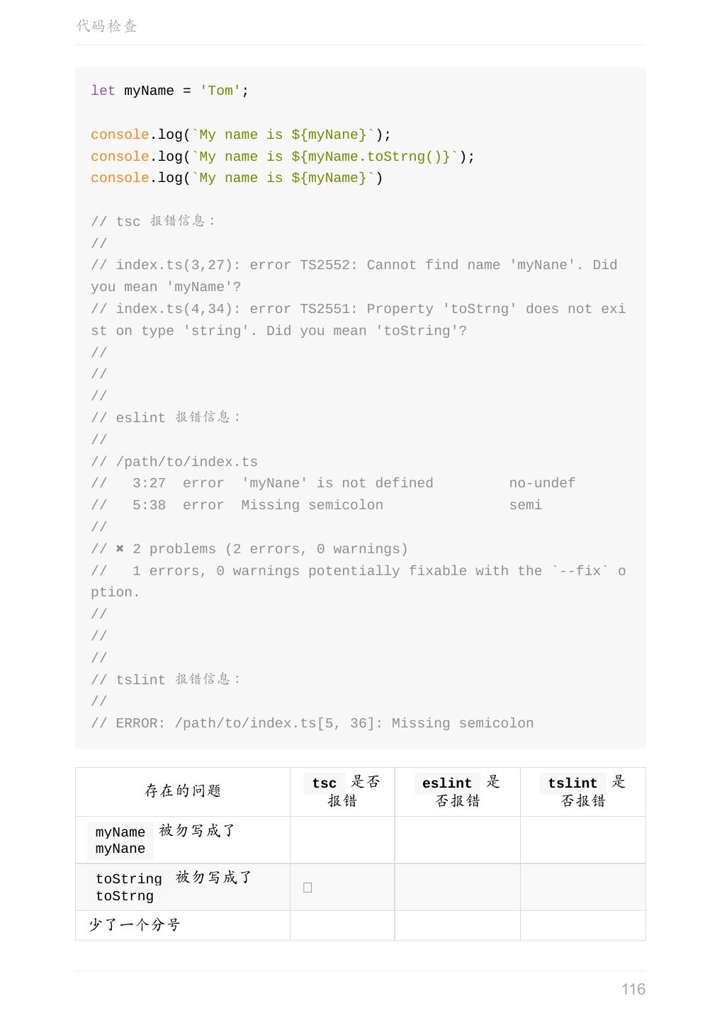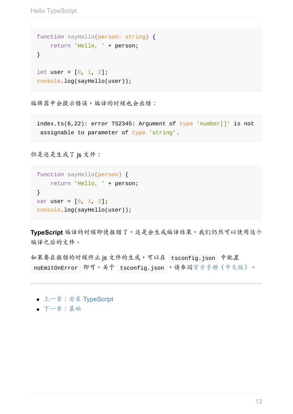 13 .Hello TypeScript function sayHello(person: string) { return 'Hello, ' + person; } let user = [0, 1, 2]; console.log(sayHello(user)); 编辑器中会提示错误,编译的时候也会出错: index.ts(6,22): error TS2345: Argument of type 'number[]' is not assignable to parameter of type 'string'. 但是还是生成了 js 文件: function sayHello(person) { return 'Hello, ' + person; } var user = [0, 1, 2]; console.log(sayHello(user)); TypeScript 编译的时候即使报错了,还是会生成编译结果,我们仍然可以使用这个 编译之后的文件。 如果要在报错的时候终止 js 文件的生成,可以在 tsconfig.json 中配置 noEmitOnError 即可。关于 tsconfig.json ,请参阅官方手册(中文版)。 上一章:安装 TypeScript 下一章:基础 13
