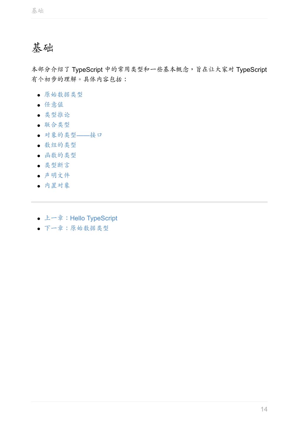 14 .基础 基础 本部分介绍了 TypeScript 中的常用类型和一些基本概念,旨在让大家对 TypeScript 有个初步的理解。具体内容包括: 原始数据类型 任意值 类型推论 联合类型 对象的类型——接口 数组的类型 函数的类型 类型断言 声明文件 内置对象 上一章:Hello TypeScript 下一章:原始数据类型 14