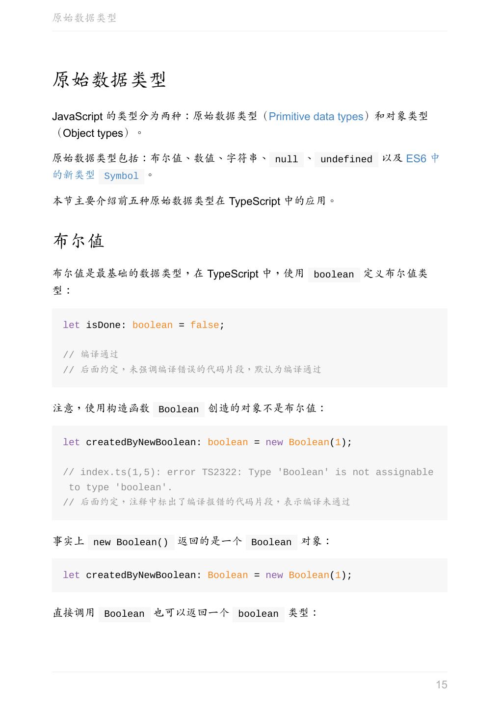 15 .原始数据类型 原始数据类型 JavaScript 的类型分为两种:原始数据类型(Primitive data types)和对象类型 (Object types)。 原始数据类型包括:布尔值、数值、字符串、 null 、 undefined 以及 ES6 中 的新类型 Symbol 。 本节主要介绍前五种原始数据类型在 TypeScript 中的应用。 布尔值 布尔值是最基础的数据类型,在 TypeScript 中,使用 boolean 定义布尔值类 型: let isDone: boolean = false; // 编译通过 // 后面约定,未强调编译错误的代码片段,默认为编译通过 注意,使用构造函数 Boolean 创造的对象不是布尔值: let createdByNewBoolean: boolean = new Boolean(1); // index.ts(1,5): error TS2322: Type 'Boolean' is not assignable to type 'boolean'. // 后面约定,注释中标出了编译报错的代码片段,表示编译未通过 事实上 new Boolean() 返回的是一个 Boolean 对象: let createdByNewBoolean: Boolean = new Boolean(1); 直接调用 Boolean 也可以返回一个 boolean 类型: 15