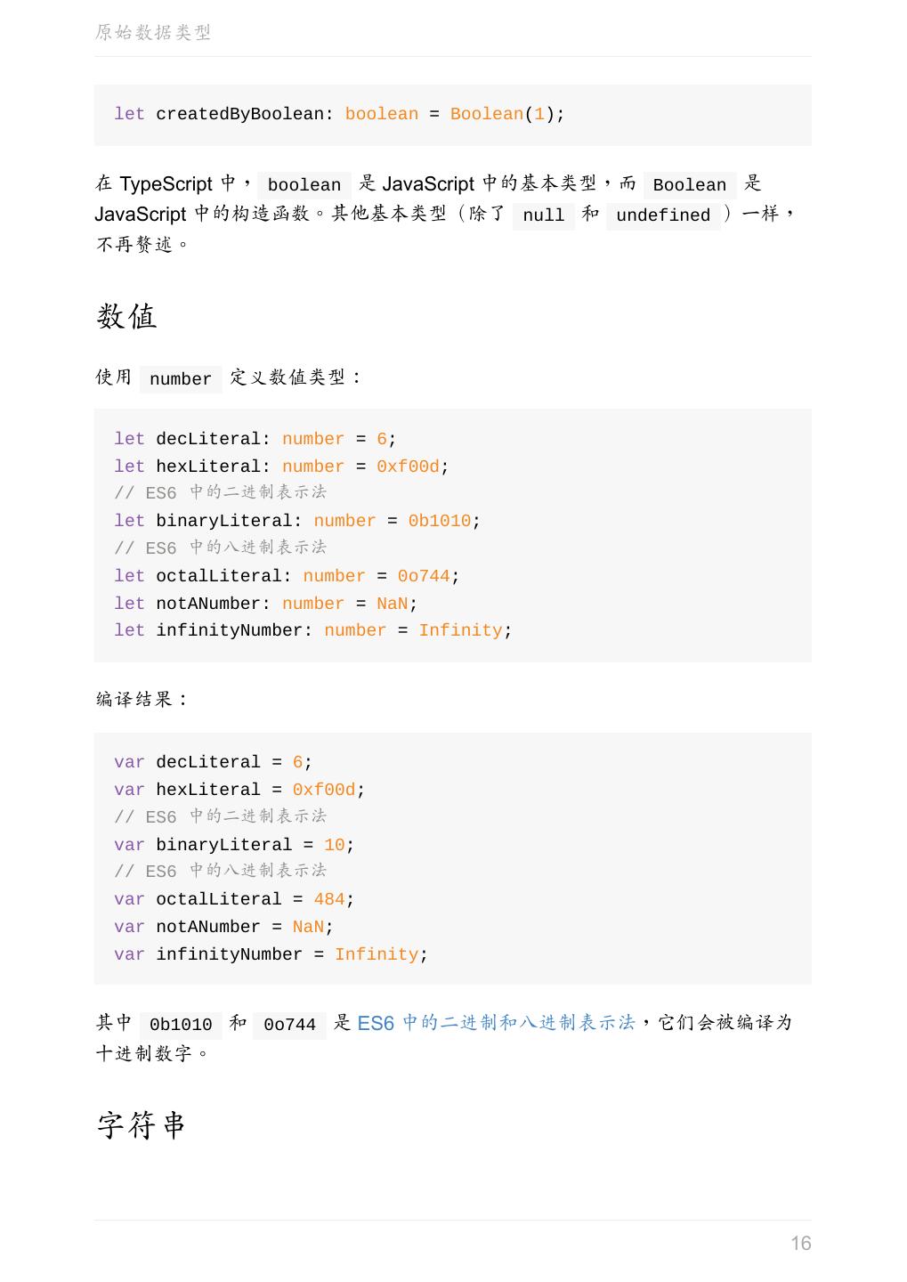 16 .原始数据类型 let createdByBoolean: boolean = Boolean(1); 在 TypeScript 中, boolean 是 JavaScript 中的基本类型,而 Boolean 是 JavaScript 中的构造函数。其他基本类型(除了 null 和 undefined )一样, 不再赘述。 数值 使用 number 定义数值类型: let decLiteral: number = 6; let hexLiteral: number = 0xf00d; // ES6 中的二进制表示法 let binaryLiteral: number = 0b1010; // ES6 中的八进制表示法 let octalLiteral: number = 0o744; let notANumber: number = NaN; let infinityNumber: number = Infinity; 编译结果: var decLiteral = 6; var hexLiteral = 0xf00d; // ES6 中的二进制表示法 var binaryLiteral = 10; // ES6 中的八进制表示法 var octalLiteral = 484; var notANumber = NaN; var infinityNumber = Infinity; 其中 0b1010 和 0o744 是 ES6 中的二进制和八进制表示法,它们会被编译为 十进制数字。 字符串 16