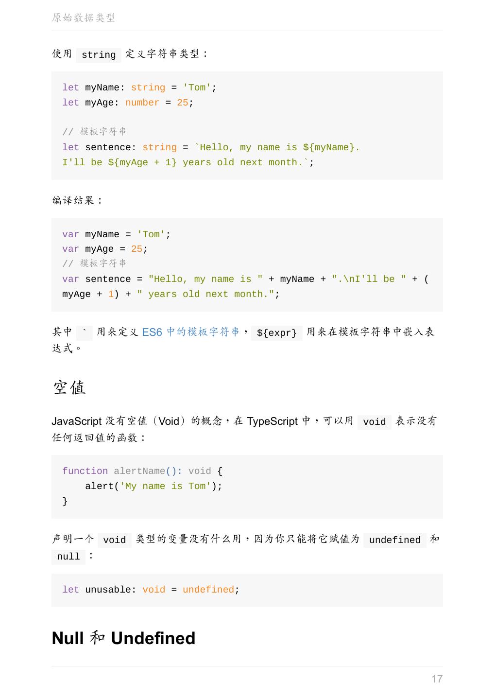 17 .原始数据类型 使用 string 定义字符串类型: let myName: string = 'Tom'; let myAge: number = 25; // 模板字符串 let sentence: string = `Hello, my name is ${myName}. I'll be ${myAge + 1} years old next month.`; 编译结果: var myName = 'Tom'; var myAge = 25; // 模板字符串 var sentence = "Hello, my name is " + myName + ".\nI'll be " + ( myAge + 1) + " years old next month."; 其中 ` 用来定义 ES6 中的模板字符串, ${expr} 用来在模板字符串中嵌入表 达式。 空值 JavaScript 没有空值(Void)的概念,在 TypeScript 中,可以用 void 表示没有 任何返回值的函数: function alertName(): void { alert('My name is Tom'); } 声明一个 void 类型的变量没有什么用,因为你只能将它赋值为 undefined 和 null : let unusable: void = undefined; Null 和 Undefined 17