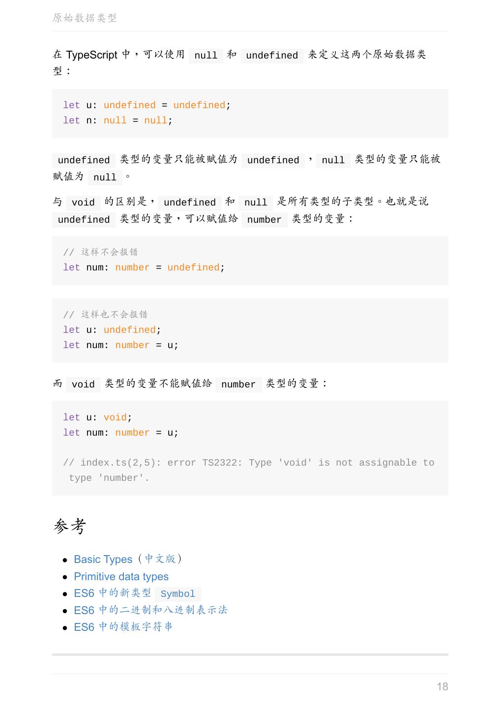 18 .原始数据类型 在 TypeScript 中,可以使用 null 和 undefined 来定义这两个原始数据类 型: let u: undefined = undefined; let n: null = null; undefined 类型的变量只能被赋值为 undefined , null 类型的变量只能被 赋值为 null 。 与 void 的区别是, undefined 和 null 是所有类型的子类型。也就是说 undefined 类型的变量,可以赋值给 number 类型的变量: // 这样不会报错 let num: number = undefined; // 这样也不会报错 let u: undefined; let num: number = u; 而 void 类型的变量不能赋值给 number 类型的变量: let u: void; let num: number = u; // index.ts(2,5): error TS2322: Type 'void' is not assignable to type 'number'. 参考 Basic Types(中文版) Primitive data types ES6 中的新类型 Symbol ES6 中的二进制和八进制表示法 ES6 中的模板字符串 18