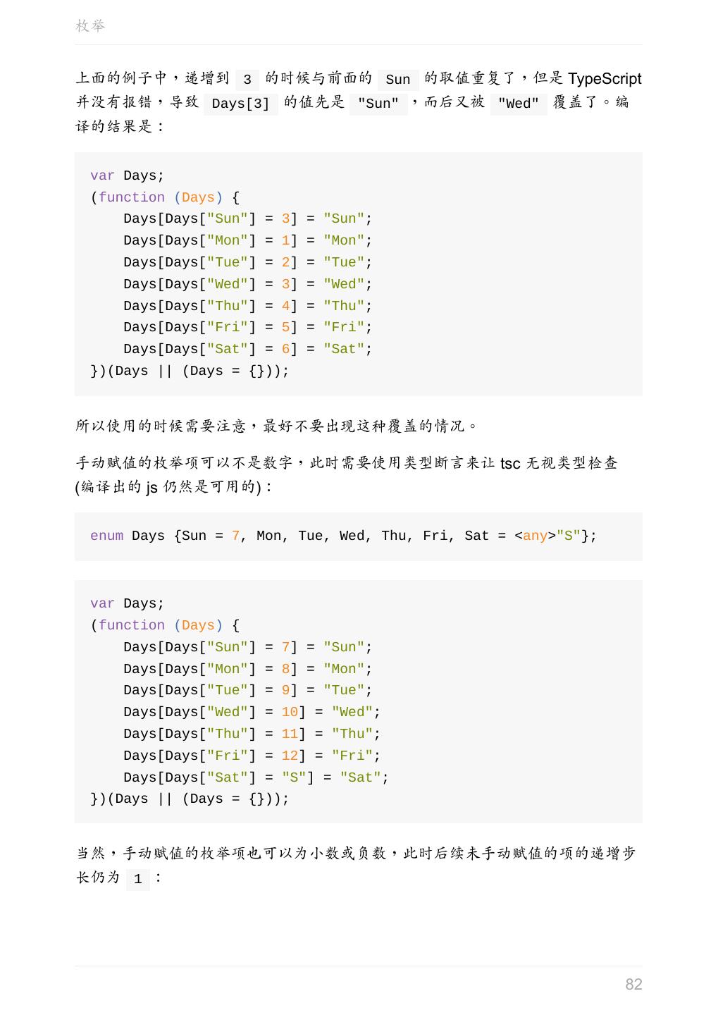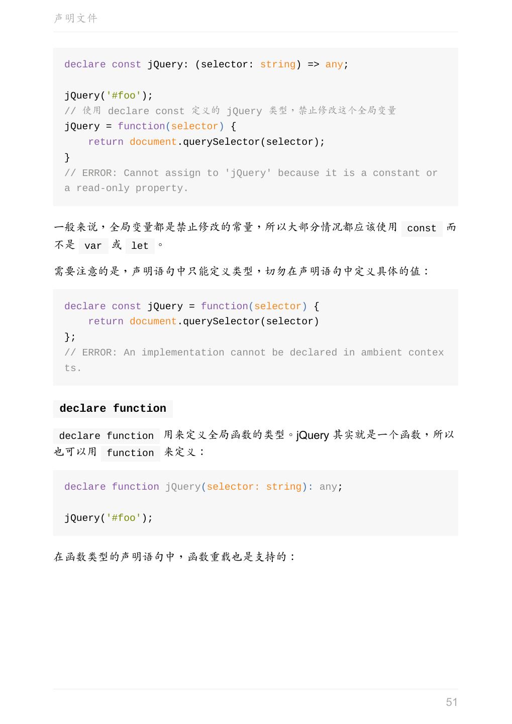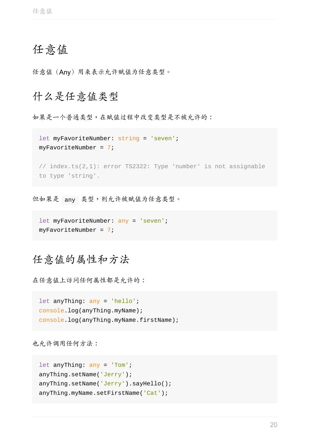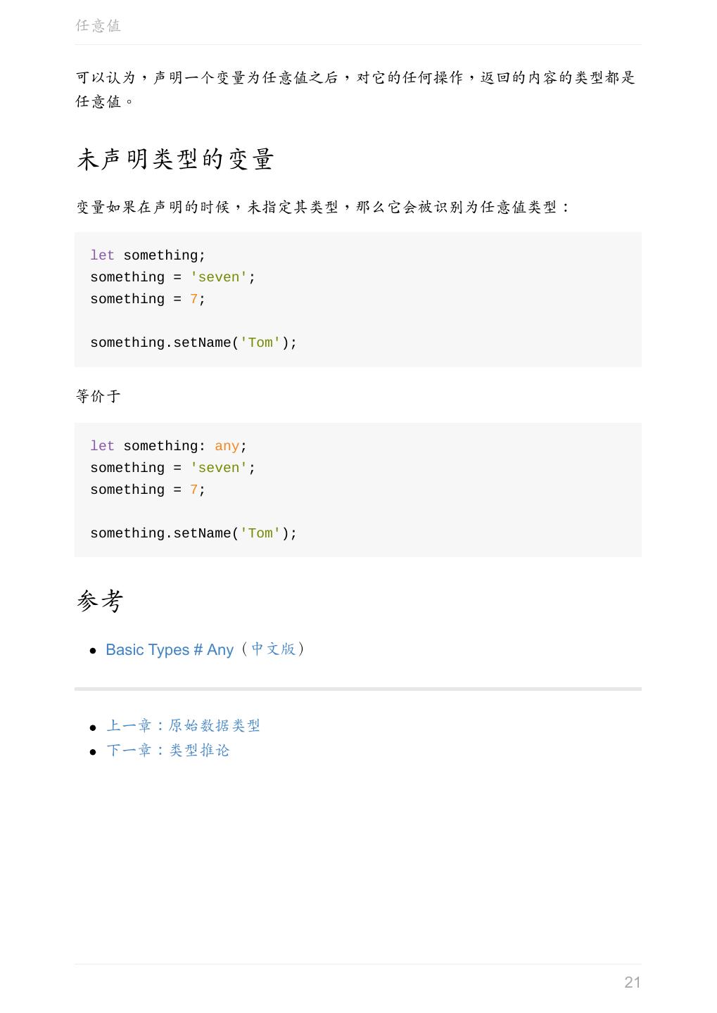 21 .任意值 可以认为,声明一个变量为任意值之后,对它的任何操作,返回的内容的类型都是 任意值。 未声明类型的变量 变量如果在声明的时候,未指定其类型,那么它会被识别为任意值类型: let something; something = 'seven'; something = 7; something.setName('Tom'); 等价于 let something: any; something = 'seven'; something = 7; something.setName('Tom'); 参考 Basic Types # Any(中文版) 上一章:原始数据类型 下一章:类型推论 21