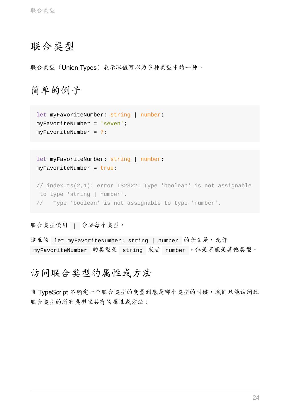 24 .联合类型 联合类型 联合类型(Union Types)表示取值可以为多种类型中的一种。 简单的例子 let myFavoriteNumber: string | number; myFavoriteNumber = 'seven'; myFavoriteNumber = 7; let myFavoriteNumber: string | number; myFavoriteNumber = true; // index.ts(2,1): error TS2322: Type 'boolean' is not assignable to type 'string | number'. // Type 'boolean' is not assignable to type 'number'. 联合类型使用 | 分隔每个类型。 这里的 let myFavoriteNumber: string | number 的含义是,允许 myFavoriteNumber 的类型是 string 或者 number ,但是不能是其他类型。 访问联合类型的属性或方法 当 TypeScript 不确定一个联合类型的变量到底是哪个类型的时候,我们只能访问此 联合类型的所有类型里共有的属性或方法: 24