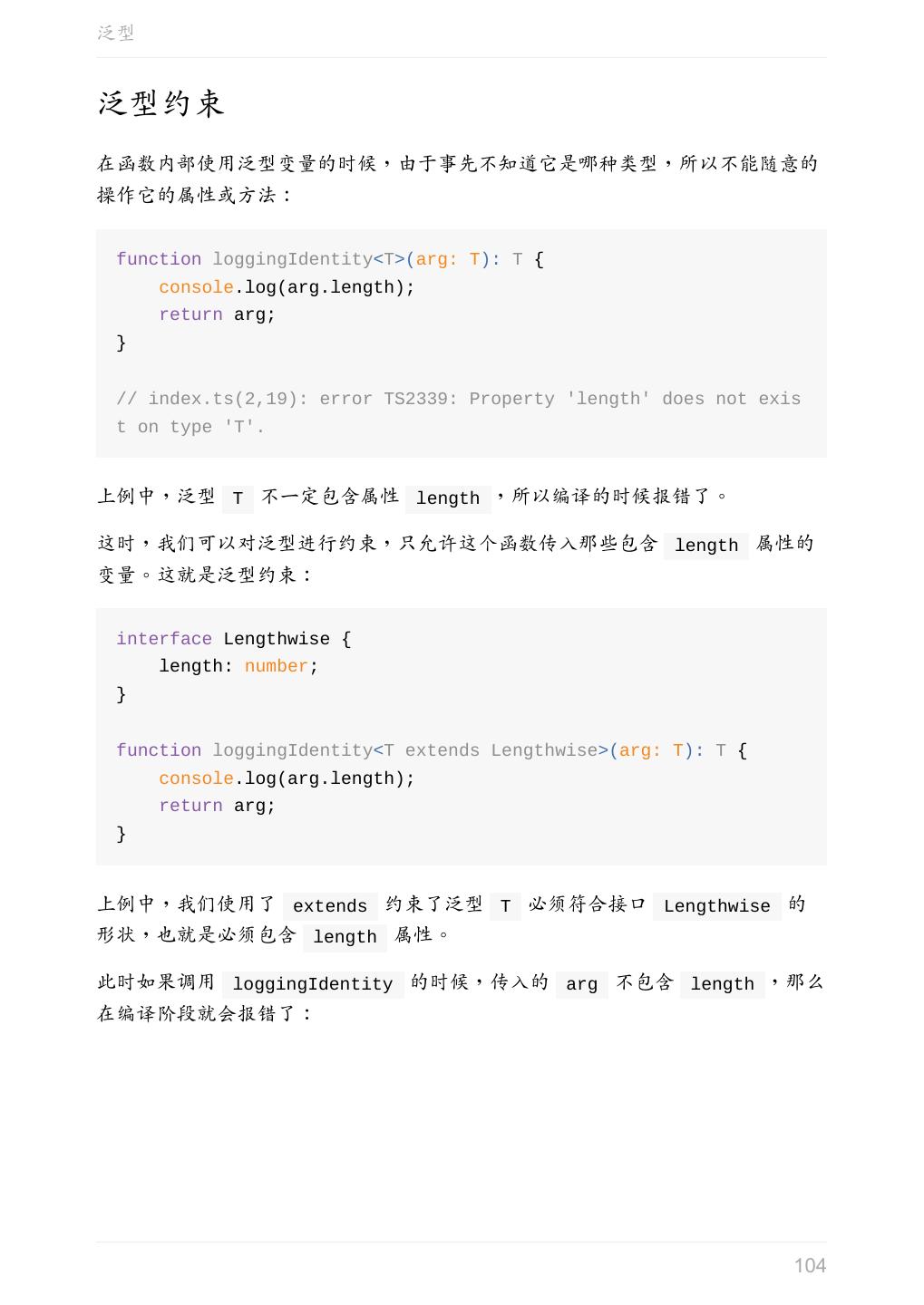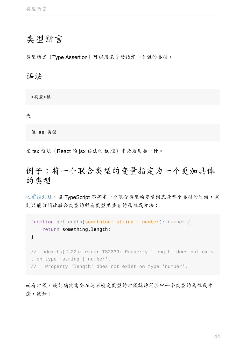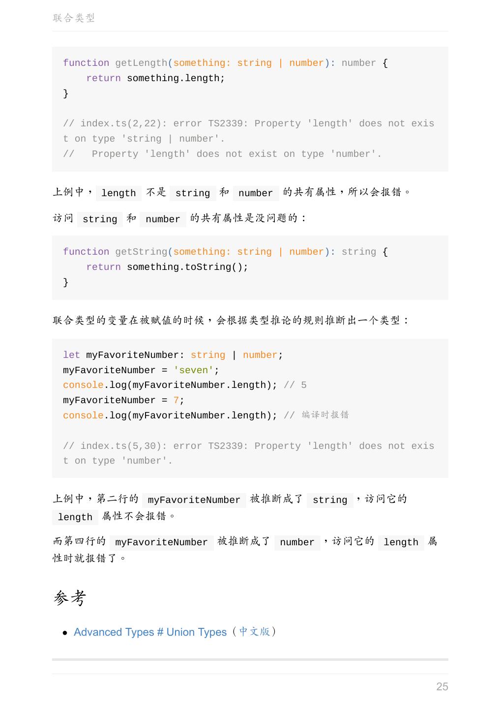 25 .联合类型 function getLength(something: string | number): number { return something.length; } // index.ts(2,22): error TS2339: Property 'length' does not exis t on type 'string | number'. // Property 'length' does not exist on type 'number'. 上例中, length 不是 string 和 number 的共有属性,所以会报错。 访问 string 和 number 的共有属性是没问题的: function getString(something: string | number): string { return something.toString(); } 联合类型的变量在被赋值的时候,会根据类型推论的规则推断出一个类型: let myFavoriteNumber: string | number; myFavoriteNumber = 'seven'; console.log(myFavoriteNumber.length); // 5 myFavoriteNumber = 7; console.log(myFavoriteNumber.length); // 编译时报错 // index.ts(5,30): error TS2339: Property 'length' does not exis t on type 'number'. 上例中,第二行的 myFavoriteNumber 被推断成了 string ,访问它的 length 属性不会报错。 而第四行的 myFavoriteNumber 被推断成了 number ,访问它的 length 属 性时就报错了。 参考 Advanced Types # Union Types(中文版) 25