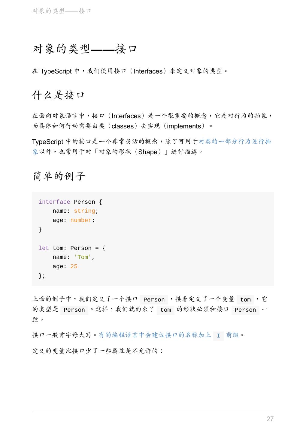27 .对象的类型——接口 对象的类型——接口 在 TypeScript 中,我们使用接口(Interfaces)来定义对象的类型。 什么是接口 在面向对象语言中,接口(Interfaces)是一个很重要的概念,它是对行为的抽象, 而具体如何行动需要由类(classes)去实现(implements)。 TypeScript 中的接口是一个非常灵活的概念,除了可用于对类的一部分行为进行抽 象以外,也常用于对「对象的形状(Shape)」进行描述。 简单的例子 interface Person { name: string; age: number; } let tom: Person = { name: 'Tom', age: 25 }; 上面的例子中,我们定义了一个接口 Person ,接着定义了一个变量 tom ,它 的类型是 Person 。这样,我们就约束了 tom 的形状必须和接口 Person 一 致。 接口一般首字母大写。有的编程语言中会建议接口的名称加上 I 前缀。 定义的变量比接口少了一些属性是不允许的: 27