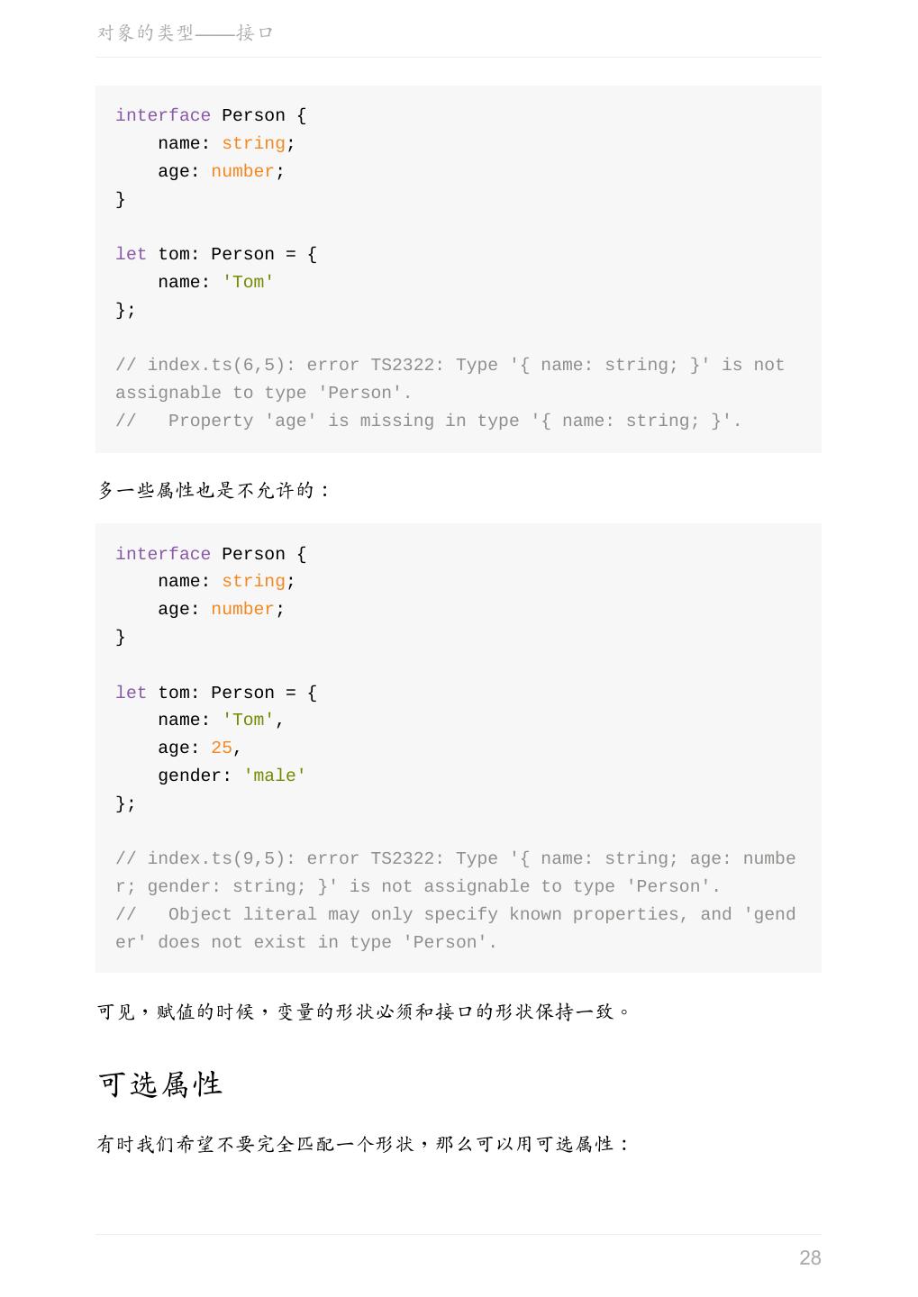 28 .对象的类型——接口 interface Person { name: string; age: number; } let tom: Person = { name: 'Tom' }; // index.ts(6,5): error TS2322: Type '{ name: string; }' is not assignable to type 'Person'. // Property 'age' is missing in type '{ name: string; }'. 多一些属性也是不允许的: interface Person { name: string; age: number; } let tom: Person = { name: 'Tom', age: 25, gender: 'male' }; // index.ts(9,5): error TS2322: Type '{ name: string; age: numbe r; gender: string; }' is not assignable to type 'Person'. // Object literal may only specify known properties, and 'gend er' does not exist in type 'Person'. 可见,赋值的时候,变量的形状必须和接口的形状保持一致。 可选属性 有时我们希望不要完全匹配一个形状,那么可以用可选属性: 28
