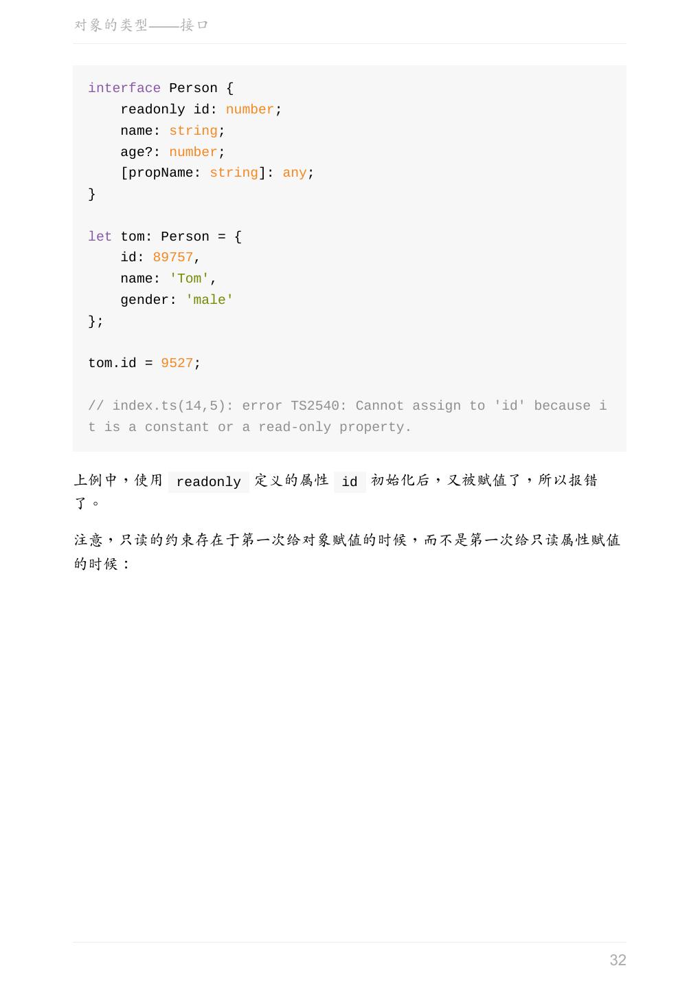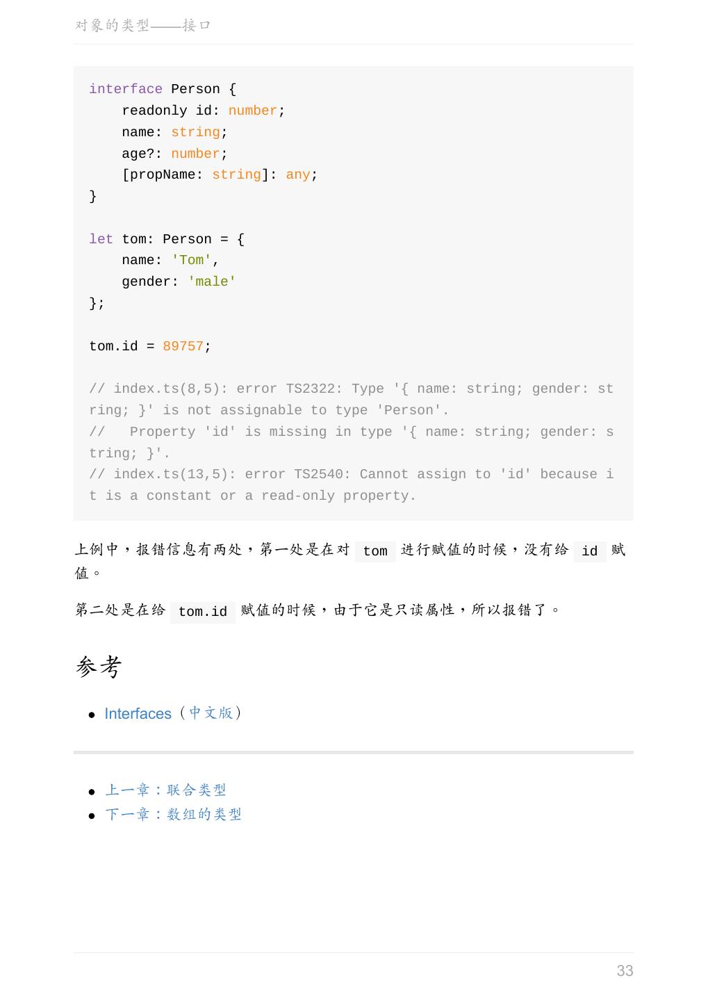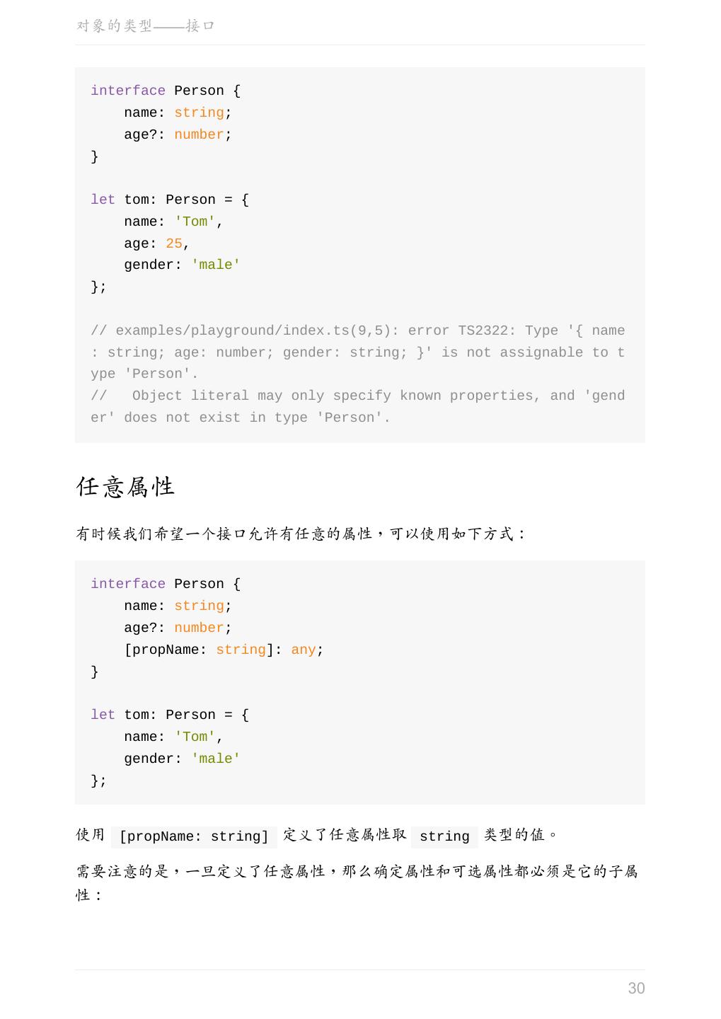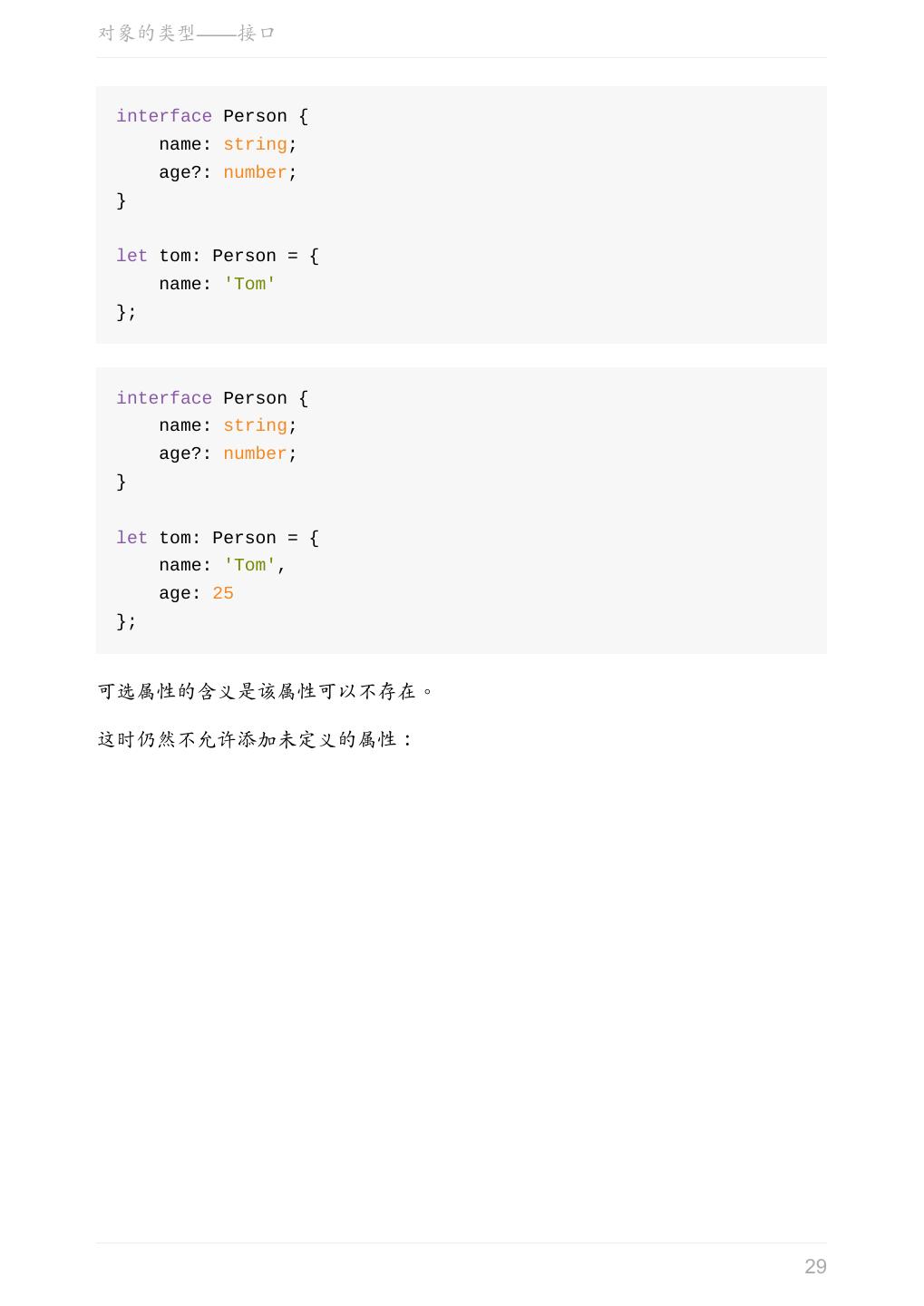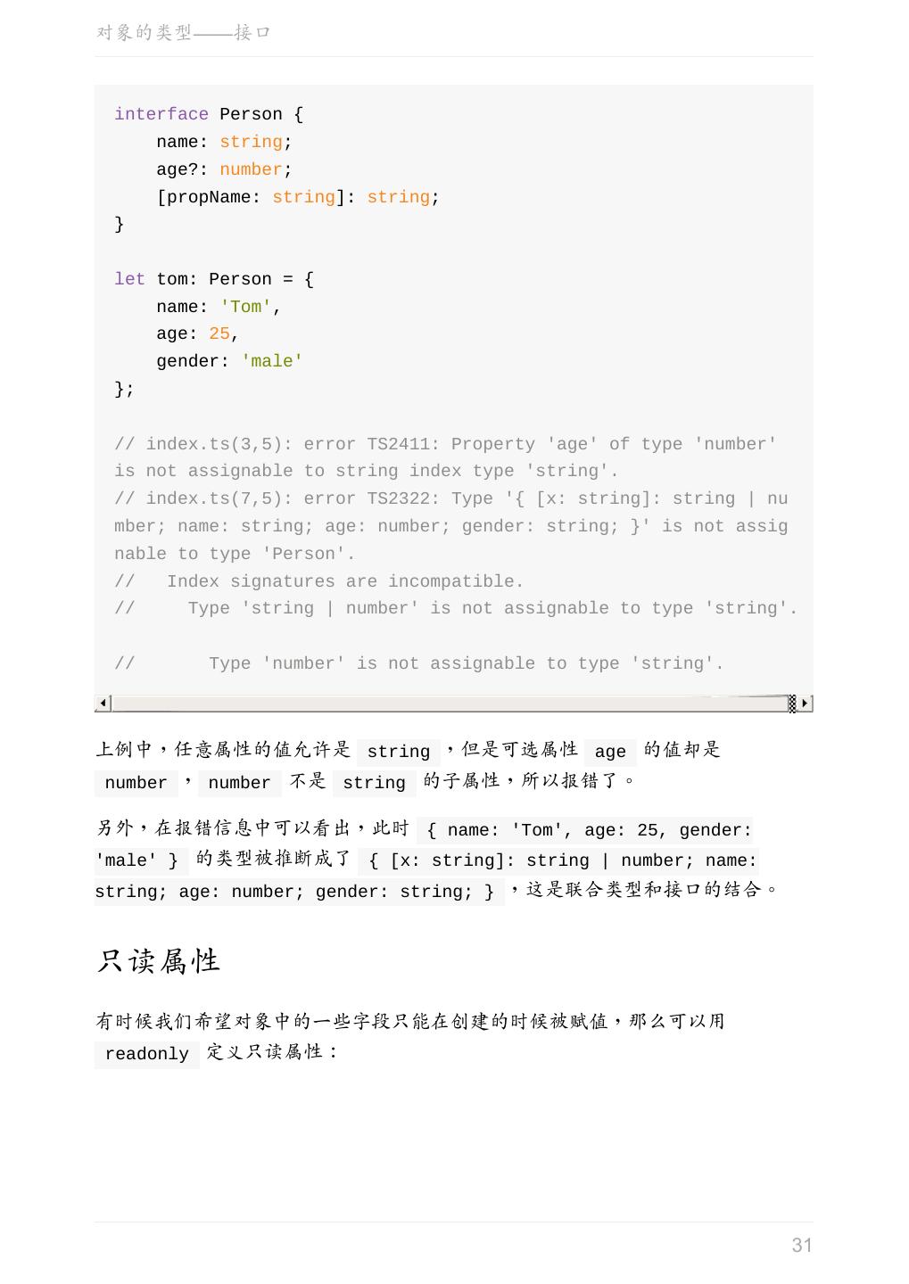 29 .对象的类型——接口 interface Person { name: string; age?: number; } let tom: Person = { name: 'Tom' }; interface Person { name: string; age?: number; } let tom: Person = { name: 'Tom', age: 25 }; 可选属性的含义是该属性可以不存在。 这时仍然不允许添加未定义的属性: 29
