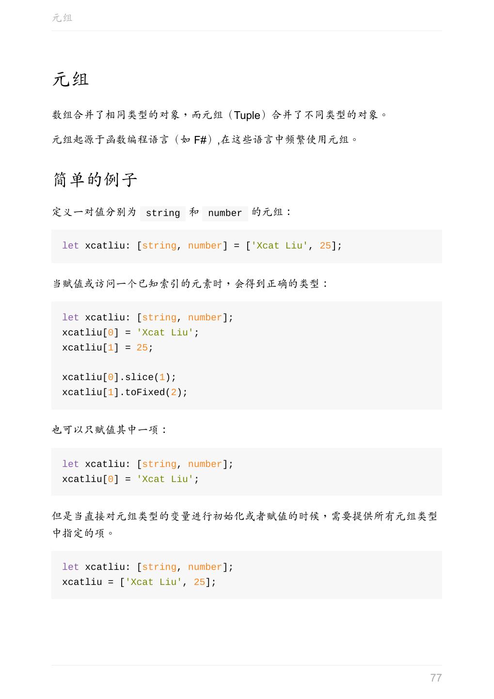 4 .前言 TypeScript 是 JavaScript 的一个超集,主要提供了类型系统和对 ES6 的支持,它 由 Microsoft 开发,代码开源于 GitHub 上。 它的第一个版本发布于 2012 年 10 月,经历了多次更新后,现在已成为前端社区 中不可忽视的力量,不仅在 Microsoft 内部得到广泛运用,而且 Google 的 Angular2 也使用了 TypeScript 作为开发语言。 适合人群 本书适合以下人群 熟悉 JavaScript,至少阅读过一遍《JavaScript 高级程序设计》 了解 ES6,推荐阅读 ECMAScript 6 入门 了解 Node.js,会用 npm 安装及使用一些工具 想了解 TypeScript 或者想对 TypeScript 有更深的理解 本书不适合以下人群 没有系统学习过 JavaScript 已经能够很熟练的运用 TypeScript 评价 《TypeScript 入门教程》全面介绍了 TS 强大的类型系统,完整而简洁,示例 丰富,比官方文档更易读,非常适合作为初学者学习 TS 的第一本书。 —— 阮一峰 目录 前言 简介 什么是 TypeScript 安装 TypeScript Hello TypeScript 基础 原始数据类型 4