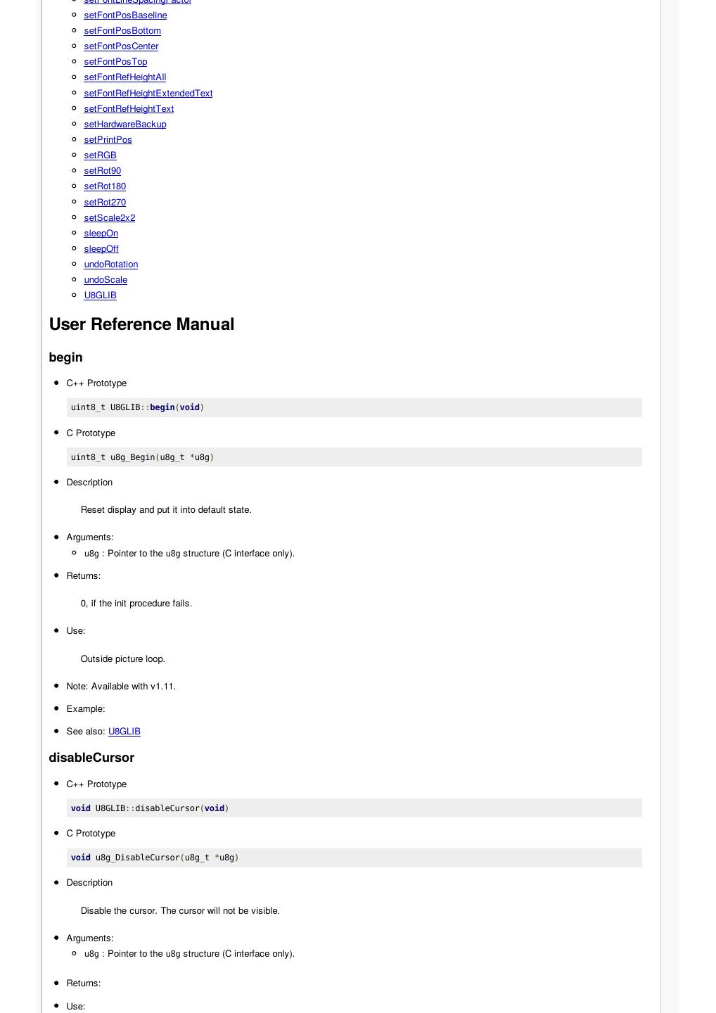 2 . setFontLineSpacingFactor setFontPosBaseline setFontPosBottom setFontPosCenter setFontPosTop setFontRefHeightAll setFontRefHeightExtendedText setFontRefHeightText setHardwareBackup setPrintPos setRGB setRot90 setRot180 setRot270 setScale2x2 sleepOn sleepOff undoRotation undoScale U8GLIB User Reference Manual begin C++ Prototype uint8_t U8GLIB::begin(void) C Prototype uint8_t u8g_Begin(u8g_t *u8g) Description Reset display and put it into default state. Arguments: u8g : Pointer to the u8g structure (C interface only). Returns: 0, if the init procedure fails. Use: Outside picture loop. Note: Available with v1.11. Example: See also: U8GLIB disableCursor C++ Prototype void U8GLIB::disableCursor(void) C Prototype void u8g_DisableCursor(u8g_t *u8g) Description Disable the cursor. The cursor will not be visible. Arguments: u8g : Pointer to the u8g structure (C interface only). Returns: Use: