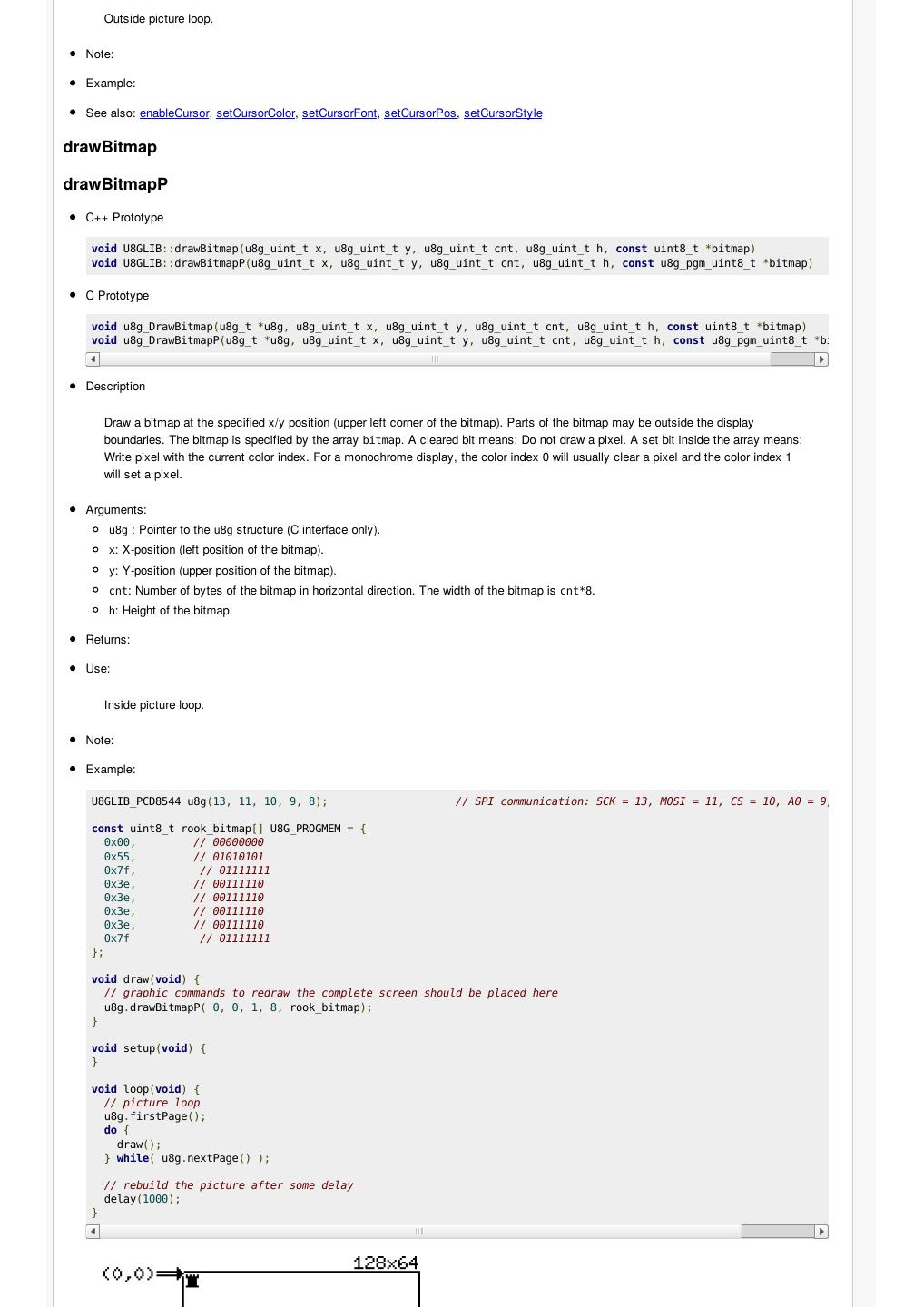 3 . Outside picture loop. Note: Example: See also: enableCursor, setCursorColor, setCursorFont, setCursorPos, setCursorStyle drawBitmap drawBitmapP C++ Prototype void U8GLIB::drawBitmap(u8g_uint_t x, u8g_uint_t y, u8g_uint_t cnt, u8g_uint_t h, const uint8_t *bitmap) void U8GLIB::drawBitmapP(u8g_uint_t x, u8g_uint_t y, u8g_uint_t cnt, u8g_uint_t h, const u8g_pgm_uint8_t *bitmap) C Prototype void u8g_DrawBitmap(u8g_t *u8g, u8g_uint_t x, u8g_uint_t y, u8g_uint_t cnt, u8g_uint_t h, const uint8_t *bitmap) void u8g_DrawBitmapP(u8g_t *u8g, u8g_uint_t x, u8g_uint_t y, u8g_uint_t cnt, u8g_uint_t h, const u8g_pgm_uint8_t *bitmap) Description Draw a bitmap at the specified x/y position (upper left corner of the bitmap). Parts of the bitmap may be outside the display boundaries. The bitmap is specified by the array bitmap. A cleared bit means: Do not draw a pixel. A set bit inside the array means: Write pixel with the current color index. For a monochrome display, the color index 0 will usually clear a pixel and the color index 1 will set a pixel. Arguments: u8g : Pointer to the u8g structure (C interface only). x: X-position (left position of the bitmap). y: Y-position (upper position of the bitmap). cnt: Number of bytes of the bitmap in horizontal direction. The width of the bitmap is cnt*8. h: Height of the bitmap. Returns: Use: Inside picture loop. Note: Example: U8GLIB_PCD8544 u8g(13, 11, 10, 9, 8); // SPI communication: SCK = 13, MOSI = 11, CS = 10, A0 = 9, Reset = 8 const uint8_t rook_bitmap[] U8G_PROGMEM = { 0x00, // 00000000 0x55, // 01010101 0x7f, // 01111111 0x3e, // 00111110 0x3e, // 00111110 0x3e, // 00111110 0x3e, // 00111110 0x7f // 01111111 }; void draw(void) { // graphic commands to redraw the complete screen should be placed here u8g.drawBitmapP( 0, 0, 1, 8, rook_bitmap); } void setup(void) { } void loop(void) { // picture loop u8g.firstPage(); do { draw(); } while( u8g.nextPage() ); // rebuild the picture after some delay delay(1000); }
