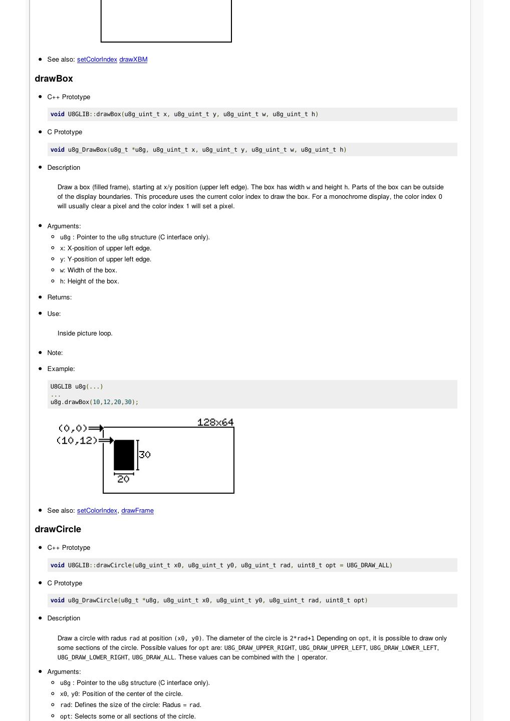 4 . See also: setColorIndex drawXBM drawBox C++ Prototype void U8GLIB::drawBox(u8g_uint_t x, u8g_uint_t y, u8g_uint_t w, u8g_uint_t h) C Prototype void u8g_DrawBox(u8g_t *u8g, u8g_uint_t x, u8g_uint_t y, u8g_uint_t w, u8g_uint_t h) Description Draw a box (filled frame), starting at x/y position (upper left edge). The box has width w and height h. Parts of the box can be outside of the display boundaries. This procedure uses the current color index to draw the box. For a monochrome display, the color index 0 will usually clear a pixel and the color index 1 will set a pixel. Arguments: u8g : Pointer to the u8g structure (C interface only). x: X-position of upper left edge. y: Y-position of upper left edge. w: Width of the box. h: Height of the box. Returns: Use: Inside picture loop. Note: Example: U8GLIB u8g(...) ... u8g.drawBox(10,12,20,30); See also: setColorIndex, drawFrame drawCircle C++ Prototype void U8GLIB::drawCircle(u8g_uint_t x0, u8g_uint_t y0, u8g_uint_t rad, uint8_t opt = U8G_DRAW_ALL) C Prototype void u8g_DrawCircle(u8g_t *u8g, u8g_uint_t x0, u8g_uint_t y0, u8g_uint_t rad, uint8_t opt) Description Draw a circle with radus rad at position (x0, y0). The diameter of the circle is 2*rad+1 Depending on opt, it is possible to draw only some sections of the circle. Possible values for opt are: U8G_DRAW_UPPER_RIGHT, U8G_DRAW_UPPER_LEFT, U8G_DRAW_LOWER_LEFT, U8G_DRAW_LOWER_RIGHT, U8G_DRAW_ALL. These values can be combined with the | operator. Arguments: u8g : Pointer to the u8g structure (C interface only). x0, y0: Position of the center of the circle. rad: Defines the size of the circle: Radus = rad. opt: Selects some or all sections of the circle.