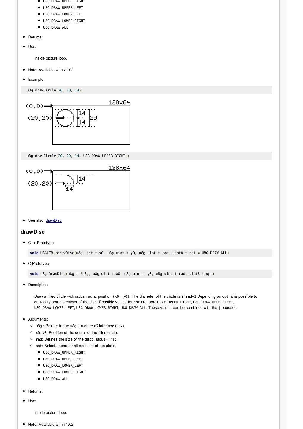 5 . U8G_DRAW_UPPER_RIGHT U8G_DRAW_UPPER_LEFT U8G_DRAW_LOWER_LEFT U8G_DRAW_LOWER_RIGHT U8G_DRAW_ALL Returns: Use: Inside picture loop. Note: Available with v1.02 Example: u8g.drawCircle(20, 20, 14); u8g.drawCircle(20, 20, 14, U8G_DRAW_UPPER_RIGHT); See also: drawDisc drawDisc C++ Prototype void U8GLIB::drawDisc(u8g_uint_t x0, u8g_uint_t y0, u8g_uint_t rad, uint8_t opt = U8G_DRAW_ALL) C Prototype void u8g_DrawDisc(u8g_t *u8g, u8g_uint_t x0, u8g_uint_t y0, u8g_uint_t rad, uint8_t opt) Description Draw a filled circle with radus rad at position (x0, y0). The diameter of the circle is 2*rad+1 Depending on opt, it is possible to draw only some sections of the disc. Possible values for opt are: U8G_DRAW_UPPER_RIGHT, U8G_DRAW_UPPER_LEFT, U8G_DRAW_LOWER_LEFT, U8G_DRAW_LOWER_RIGHT, U8G_DRAW_ALL. These values can be combined with the | operator. Arguments: u8g : Pointer to the u8g structure (C interface only). x0, y0: Position of the center of the filled circle. rad: Defines the size of the disc: Radus = rad. opt: Selects some or all sections of the circle. U8G_DRAW_UPPER_RIGHT U8G_DRAW_UPPER_LEFT U8G_DRAW_LOWER_LEFT U8G_DRAW_LOWER_RIGHT U8G_DRAW_ALL Returns: Use: Inside picture loop. Note: Available with v1.02