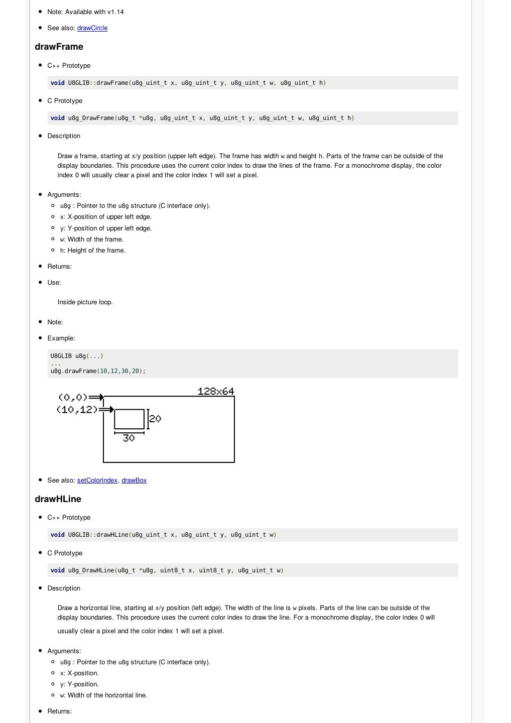 7 . Note: Available with v1.14 See also: drawCircle drawFrame C++ Prototype void U8GLIB::drawFrame(u8g_uint_t x, u8g_uint_t y, u8g_uint_t w, u8g_uint_t h) C Prototype void u8g_DrawFrame(u8g_t *u8g, u8g_uint_t x, u8g_uint_t y, u8g_uint_t w, u8g_uint_t h) Description Draw a frame, starting at x/y position (upper left edge). The frame has width w and height h. Parts of the frame can be outside of the display boundaries. This procedure uses the current color index to draw the lines of the frame. For a monochrome display, the color index 0 will usually clear a pixel and the color index 1 will set a pixel. Arguments: u8g : Pointer to the u8g structure (C interface only). x: X-position of upper left edge. y: Y-position of upper left edge. w: Width of the frame. h: Height of the frame. Returns: Use: Inside picture loop. Note: Example: U8GLIB u8g(...) ... u8g.drawFrame(10,12,30,20); See also: setColorIndex, drawBox drawHLine C++ Prototype void U8GLIB::drawHLine(u8g_uint_t x, u8g_uint_t y, u8g_uint_t w) C Prototype void u8g_DrawHLine(u8g_t *u8g, uint8_t x, uint8_t y, u8g_uint_t w) Description Draw a horizontal line, starting at x/y position (left edge). The width of the line is w pixels. Parts of the line can be outside of the display boundaries. This procedure uses the current color index to draw the line. For a monochrome display, the color index 0 will usually clear a pixel and the color index 1 will set a pixel. Arguments: u8g : Pointer to the u8g structure (C interface only). x: X-position. y: Y-position. w: Width of the horizontal line. Returns: