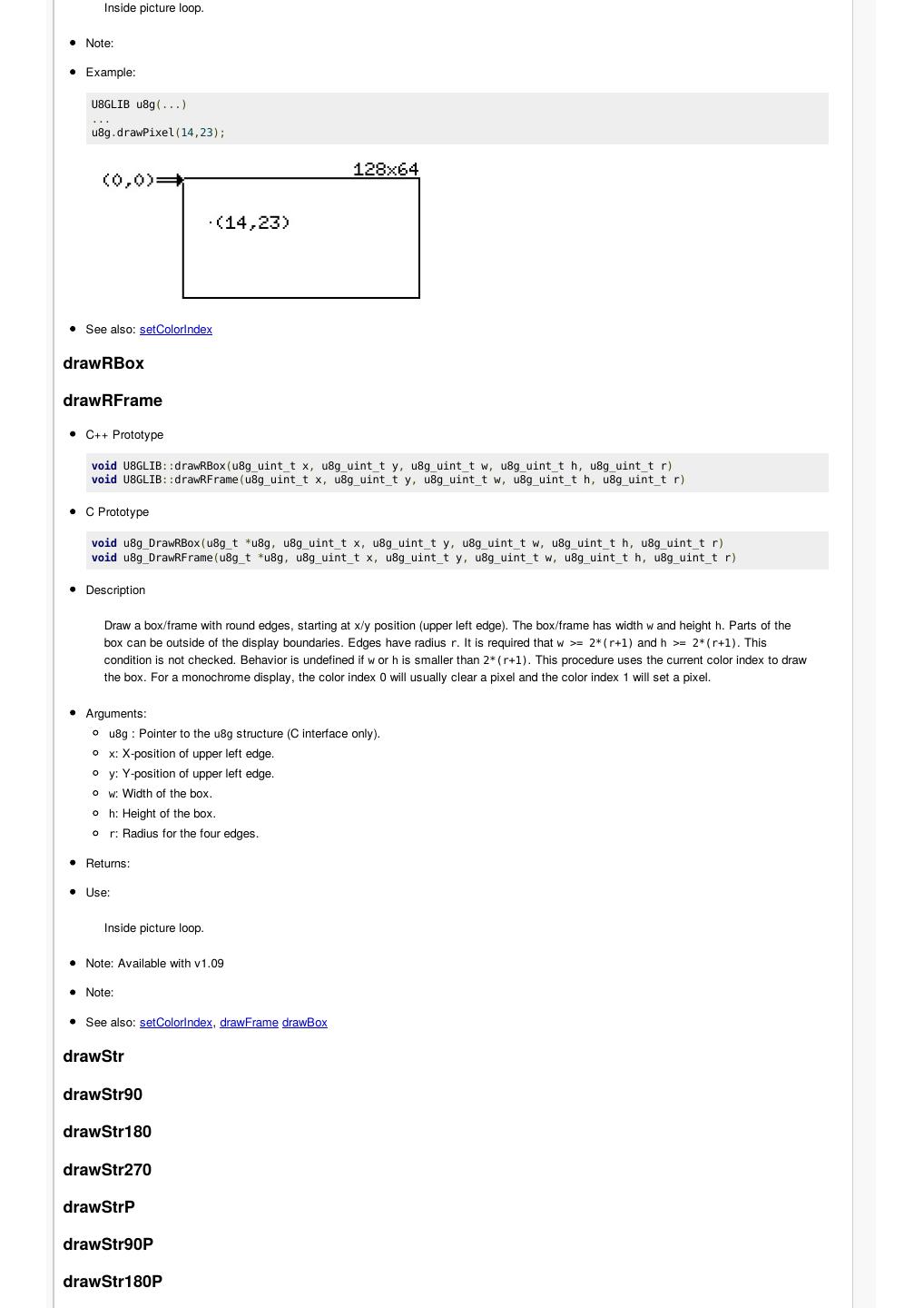 9 . Inside picture loop. Note: Example: U8GLIB u8g(...) ... u8g.drawPixel(14,23); See also: setColorIndex drawRBox drawRFrame C++ Prototype void U8GLIB::drawRBox(u8g_uint_t x, u8g_uint_t y, u8g_uint_t w, u8g_uint_t h, u8g_uint_t r) void U8GLIB::drawRFrame(u8g_uint_t x, u8g_uint_t y, u8g_uint_t w, u8g_uint_t h, u8g_uint_t r) C Prototype void u8g_DrawRBox(u8g_t *u8g, u8g_uint_t x, u8g_uint_t y, u8g_uint_t w, u8g_uint_t h, u8g_uint_t r) void u8g_DrawRFrame(u8g_t *u8g, u8g_uint_t x, u8g_uint_t y, u8g_uint_t w, u8g_uint_t h, u8g_uint_t r) Description Draw a box/frame with round edges, starting at x/y position (upper left edge). The box/frame has width w and height h. Parts of the box can be outside of the display boundaries. Edges have radius r. It is required that w >= 2*(r+1) and h >= 2*(r+1). This condition is not checked. Behavior is undefined if w or h is smaller than 2*(r+1). This procedure uses the current color index to draw the box. For a monochrome display, the color index 0 will usually clear a pixel and the color index 1 will set a pixel. Arguments: u8g : Pointer to the u8g structure (C interface only). x: X-position of upper left edge. y: Y-position of upper left edge. w: Width of the box. h: Height of the box. r: Radius for the four edges. Returns: Use: Inside picture loop. Note: Available with v1.09 Note: See also: setColorIndex, drawFrame drawBox drawStr drawStr90 drawStr180 drawStr270 drawStrP drawStr90P drawStr180P