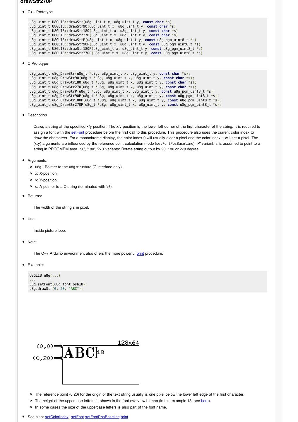 10 .drawStr270P C++ Prototype u8g_uint_t U8GLIB::drawStr(u8g_uint_t x, u8g_uint_t y, const char *s) u8g_uint_t U8GLIB::drawStr90(u8g_uint_t x, u8g_uint_t y, const char *s) u8g_uint_t U8GLIB::drawStr180(u8g_uint_t x, u8g_uint_t y, const char *s) u8g_uint_t U8GLIB::drawStr270(u8g_uint_t x, u8g_uint_t y, const char *s) u8g_uint_t U8GLIB::drawStrP(u8g_uint_t x, u8g_uint_t y, const u8g_pgm_uint8_t *s) u8g_uint_t U8GLIB::drawStr90P(u8g_uint_t x, u8g_uint_t y, const u8g_pgm_uint8_t *s) u8g_uint_t U8GLIB::drawStr180P(u8g_uint_t x, u8g_uint_t y, const u8g_pgm_uint8_t *s) u8g_uint_t U8GLIB::drawStr270P(u8g_uint_t x, u8g_uint_t y, const u8g_pgm_uint8_t *s) C Prototype u8g_uint_t u8g_DrawStr(u8g_t *u8g, u8g_uint_t x, u8g_uint_t y, const char *s); u8g_uint_t u8g_DrawStr90(u8g_t *u8g, u8g_uint_t x, u8g_uint_t y, const char *s); u8g_uint_t u8g_DrawStr180(u8g_t *u8g, u8g_uint_t x, u8g_uint_t y, const char *s); u8g_uint_t u8g_DrawStr270(u8g_t *u8g, u8g_uint_t x, u8g_uint_t y, const char *s); u8g_uint_t u8g_DrawStrP(u8g_t *u8g, u8g_uint_t x, u8g_uint_t y, const u8g_pgm_uint8_t *s); u8g_uint_t u8g_DrawStr90P(u8g_t *u8g, u8g_uint_t x, u8g_uint_t y, const u8g_pgm_uint8_t *s); u8g_uint_t u8g_DrawStr180P(u8g_t *u8g, u8g_uint_t x, u8g_uint_t y, const u8g_pgm_uint8_t *s); u8g_uint_t u8g_DrawStr270P(u8g_t *u8g, u8g_uint_t x, u8g_uint_t y, const u8g_pgm_uint8_t *s); Description Draws a string at the specified x/y position. The x/y position is the lower left corner of the first character of the string. It is required to assign a font with the setFont procedure before the first call to this procedure. This procedure also uses the current color index to draw the characters. For a monochrome display, the color index 0 will usually clear a pixel and the color index 1 will set a pixel. The (x,y) arguments are influenced by the reference point calculation mode (setFontPosBaseline). 'P' variant: s is assumed to point to a string in PROGMEM area. '90', '180', '270' variants: Rotate string output by 90, 180 or 270 degree. Arguments: u8g : Pointer to the u8g structure (C interface only). x: X-position. y: Y-position. s: A pointer to a C-string (terminated with \0). Returns: The width of the string s in pixel. Use: Inside picture loop. Note: The C++ Arduino environment also offers the more powerful print procedure. Example: U8GLIB u8g(...) ... u8g.setFont(u8g_font_osb18); u8g.drawStr(0, 20, "ABC"); The reference point (0,20) for the origin of the text string usually is one pixel below the lower left edge of the first character. The height of the uppercase letters is shown in the font overview bitmap (in this example 18, see here). In some cases the size of the uppercase letters is also part of the font name. See also: setColorIndex, setFont setFontPosBaseline print