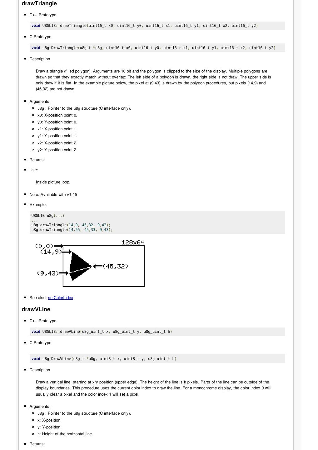 11 .drawTriangle C++ Prototype void U8GLIB::drawTriangle(uint16_t x0, uint16_t y0, uint16_t x1, uint16_t y1, uint16_t x2, uint16_t y2) C Prototype void u8g_DrawTriangle(u8g_t *u8g, uint16_t x0, uint16_t y0, uint16_t x1, uint16_t y1, uint16_t x2, uint16_t y2) Description Draw a triangle (filled polygon). Arguments are 16 bit and the polygon is clipped to the size of the display. Multiple polygons are drawn so that they exactly match without overlap: The left side of a polygon is drawn, the right side is not draw. The upper side is only draw if it is flat. In the example picture below, the pixel at (9,43) is drawn by the polygon procedures, but pixels (14,9) and (45,32) are not drawn. Arguments: u8g : Pointer to the u8g structure (C interface only). x0: X-position point 0. y0: Y-position point 0. x1: X-position point 1. y1: Y-position point 1. x2: X-position point 2. y2: Y-position point 2. Returns: Use: Inside picture loop. Note: Available with v1.15 Example: U8GLIB u8g(...) ... u8g.drawTriangle(14,9, 45,32, 9,42); u8g.drawTriangle(14,55, 45,33, 9,43); See also: setColorIndex drawVLine C++ Prototype void U8GLIB::drawVLine(u8g_uint_t x, u8g_uint_t y, u8g_uint_t h) C Prototype void u8g_DrawVLine(u8g_t *u8g, uint8_t x, uint8_t y, u8g_uint_t h) Description Draw a vertical line, starting at x/y position (upper edge). The height of the line is h pixels. Parts of the line can be outside of the display boundaries. This procedure uses the current color index to draw the line. For a monochrome display, the color index 0 will usually clear a pixel and the color index 1 will set a pixel. Arguments: u8g : Pointer to the u8g structure (C interface only). x: X-position. y: Y-position. h: Height of the horizontal line. Returns: