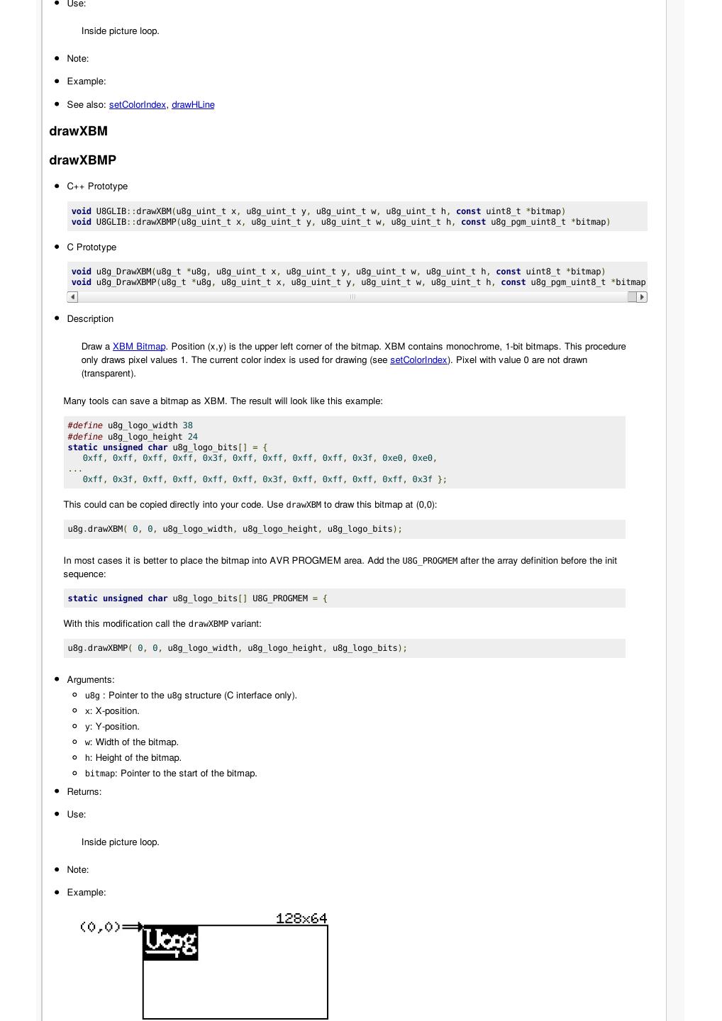12 . Use: Inside picture loop. Note: Example: See also: setColorIndex, drawHLine drawXBM drawXBMP C++ Prototype void U8GLIB::drawXBM(u8g_uint_t x, u8g_uint_t y, u8g_uint_t w, u8g_uint_t h, const uint8_t *bitmap) void U8GLIB::drawXBMP(u8g_uint_t x, u8g_uint_t y, u8g_uint_t w, u8g_uint_t h, const u8g_pgm_uint8_t *bitmap) C Prototype void u8g_DrawXBM(u8g_t *u8g, u8g_uint_t x, u8g_uint_t y, u8g_uint_t w, u8g_uint_t h, const uint8_t *bitmap) void u8g_DrawXBMP(u8g_t *u8g, u8g_uint_t x, u8g_uint_t y, u8g_uint_t w, u8g_uint_t h, const u8g_pgm_uint8_t *bitmap) Description Draw a XBM Bitmap. Position (x,y) is the upper left corner of the bitmap. XBM contains monochrome, 1-bit bitmaps. This procedure only draws pixel values 1. The current color index is used for drawing (see setColorIndex). Pixel with value 0 are not drawn (transparent). Many tools can save a bitmap as XBM. The result will look like this example: #define u8g_logo_width 38 #define u8g_logo_height 24 static unsigned char u8g_logo_bits[] = { 0xff, 0xff, 0xff, 0xff, 0x3f, 0xff, 0xff, 0xff, 0xff, 0x3f, 0xe0, 0xe0, ... 0xff, 0x3f, 0xff, 0xff, 0xff, 0xff, 0x3f, 0xff, 0xff, 0xff, 0xff, 0x3f }; This could can be copied directly into your code. Use drawXBM to draw this bitmap at (0,0): u8g.drawXBM( 0, 0, u8g_logo_width, u8g_logo_height, u8g_logo_bits); In most cases it is better to place the bitmap into AVR PROGMEM area. Add the U8G_PROGMEM after the array definition before the init sequence: static unsigned char u8g_logo_bits[] U8G_PROGMEM = { With this modification call the drawXBMP variant: u8g.drawXBMP( 0, 0, u8g_logo_width, u8g_logo_height, u8g_logo_bits); Arguments: u8g : Pointer to the u8g structure (C interface only). x: X-position. y: Y-position. w: Width of the bitmap. h: Height of the bitmap. bitmap: Pointer to the start of the bitmap. Returns: Use: Inside picture loop. Note: Example: