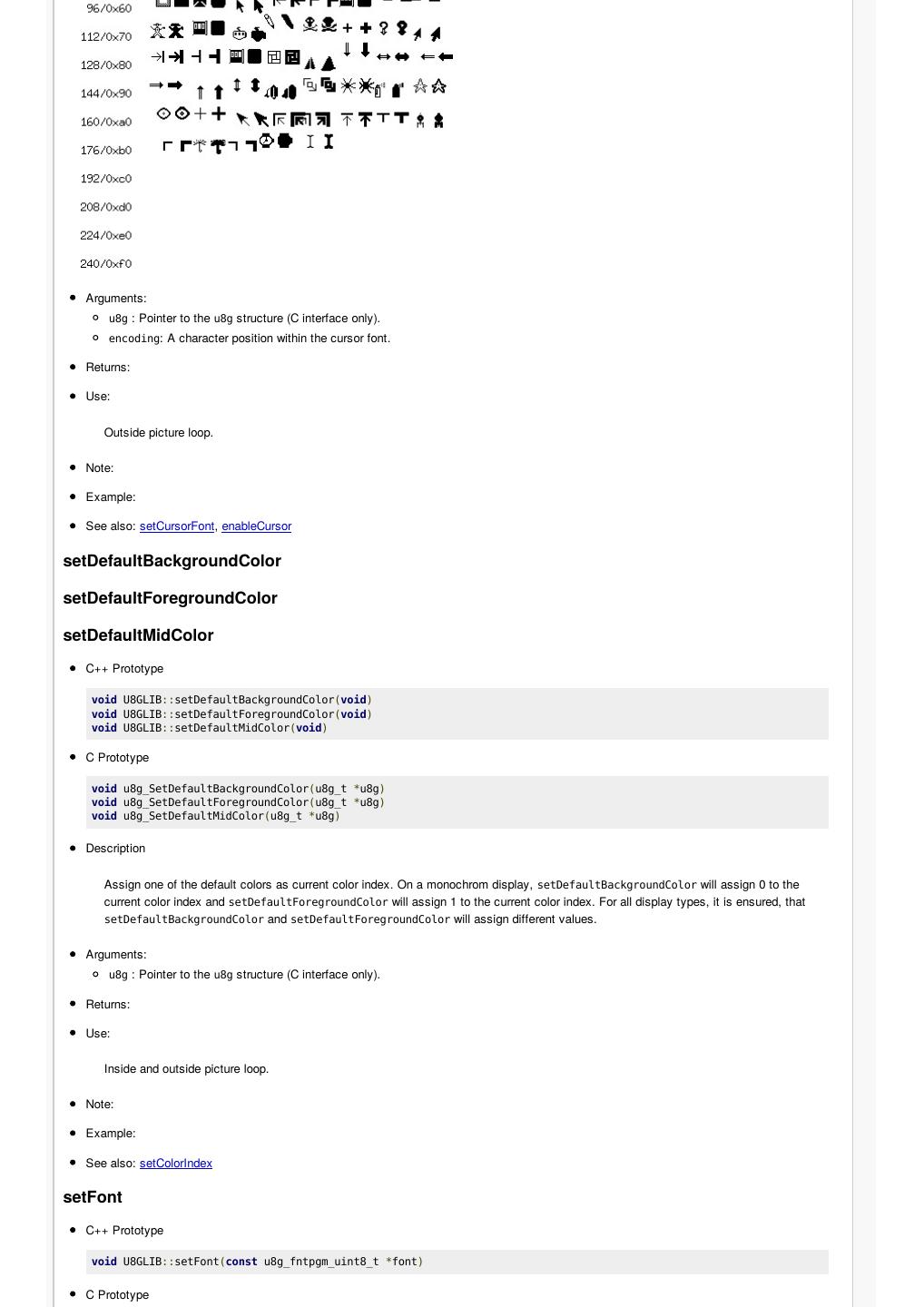 22 . Arguments: u8g : Pointer to the u8g structure (C interface only). encoding: A character position within the cursor font. Returns: Use: Outside picture loop. Note: Example: See also: setCursorFont, enableCursor setDefaultBackgroundColor setDefaultForegroundColor setDefaultMidColor C++ Prototype void U8GLIB::setDefaultBackgroundColor(void) void U8GLIB::setDefaultForegroundColor(void) void U8GLIB::setDefaultMidColor(void) C Prototype void u8g_SetDefaultBackgroundColor(u8g_t *u8g) void u8g_SetDefaultForegroundColor(u8g_t *u8g) void u8g_SetDefaultMidColor(u8g_t *u8g) Description Assign one of the default colors as current color index. On a monochrom display, setDefaultBackgroundColor will assign 0 to the current color index and setDefaultForegroundColor will assign 1 to the current color index. For all display types, it is ensured, that setDefaultBackgroundColor and setDefaultForegroundColor will assign different values. Arguments: u8g : Pointer to the u8g structure (C interface only). Returns: Use: Inside and outside picture loop. Note: Example: See also: setColorIndex setFont C++ Prototype void U8GLIB::setFont(const u8g_fntpgm_uint8_t *font) C Prototype