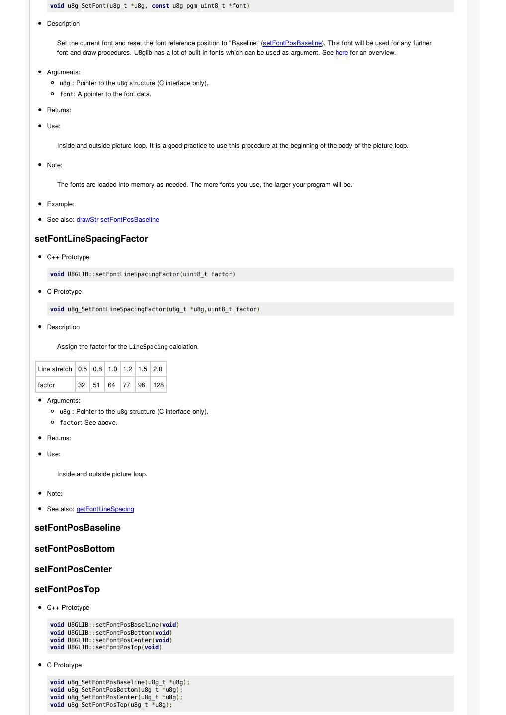 23 . void u8g_SetFont(u8g_t *u8g, const u8g_pgm_uint8_t *font) Description Set the current font and reset the font reference position to "Baseline" (setFontPosBaseline). This font will be used for any further font and draw procedures. U8glib has a lot of built-in fonts which can be used as argument. See here for an overview. Arguments: u8g : Pointer to the u8g structure (C interface only). font: A pointer to the font data. Returns: Use: Inside and outside picture loop. It is a good practice to use this procedure at the beginning of the body of the picture loop. Note: The fonts are loaded into memory as needed. The more fonts you use, the larger your program will be. Example: See also: drawStr setFontPosBaseline setFontLineSpacingFactor C++ Prototype void U8GLIB::setFontLineSpacingFactor(uint8_t factor) C Prototype void u8g_SetFontLineSpacingFactor(u8g_t *u8g,uint8_t factor) Description Assign the factor for the LineSpacing calclation. Line stretch 0.5 0.8 1.0 1.2 1.5 2.0 factor 32 51 64 77 96 128 Arguments: u8g : Pointer to the u8g structure (C interface only). factor: See above. Returns: Use: Inside and outside picture loop. Note: See also: getFontLineSpacing setFontPosBaseline setFontPosBottom setFontPosCenter setFontPosTop C++ Prototype void U8GLIB::setFontPosBaseline(void) void U8GLIB::setFontPosBottom(void) void U8GLIB::setFontPosCenter(void) void U8GLIB::setFontPosTop(void) C Prototype void u8g_SetFontPosBaseline(u8g_t *u8g); void u8g_SetFontPosBottom(u8g_t *u8g); void u8g_SetFontPosCenter(u8g_t *u8g); void u8g_SetFontPosTop(u8g_t *u8g);