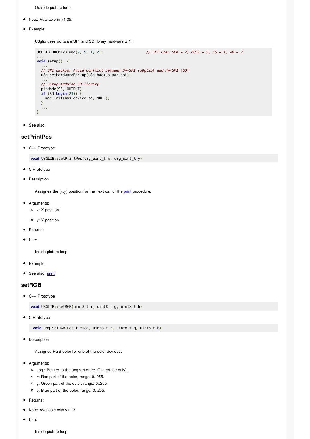 26 . Outside picture loop. Note: Available in v1.05. Example: U8glib uses software SPI and SD library hardware SPI: U8GLIB_DOGM128 u8g(7, 5, 1, 2); // SPI Com: SCK = 7, MOSI = 5, CS = 1, A0 = 2 ... void setup() { ... // SPI backup: Avoid conflict between SW-SPI (u8glib) and HW-SPI (SD) u8g.setHardwareBackup(u8g_backup_avr_spi); ... // Setup Arduino SD library pinMode(SS, OUTPUT); if (SD.begin(23)) { mas_Init(mas_device_sd, NULL); } ... } See also: setPrintPos C++ Prototype void U8GLIB::setPrintPos(u8g_uint_t x, u8g_uint_t y) C Prototype Description Assignes the (x,y) position for the next call of the print procedure. Arguments: x: X-position. y: Y-position. Returns: Use: Inside picture loop. Example: See also: print setRGB C++ Prototype void U8GLIB::setRGB(uint8_t r, uint8_t g, uint8_t b) C Prototype void u8g_SetRGB(u8g_t *u8g, uint8_t r, uint8_t g, uint8_t b) Description Assignes RGB color for one of the color devices. Arguments: u8g : Pointer to the u8g structure (C interface only). r: Red part of the color, range: 0..255. g: Green part of the color, range: 0..255. b: Blue part of the color, range: 0..255. Returns: Note: Available with v1.13 Use: Inside picture loop.