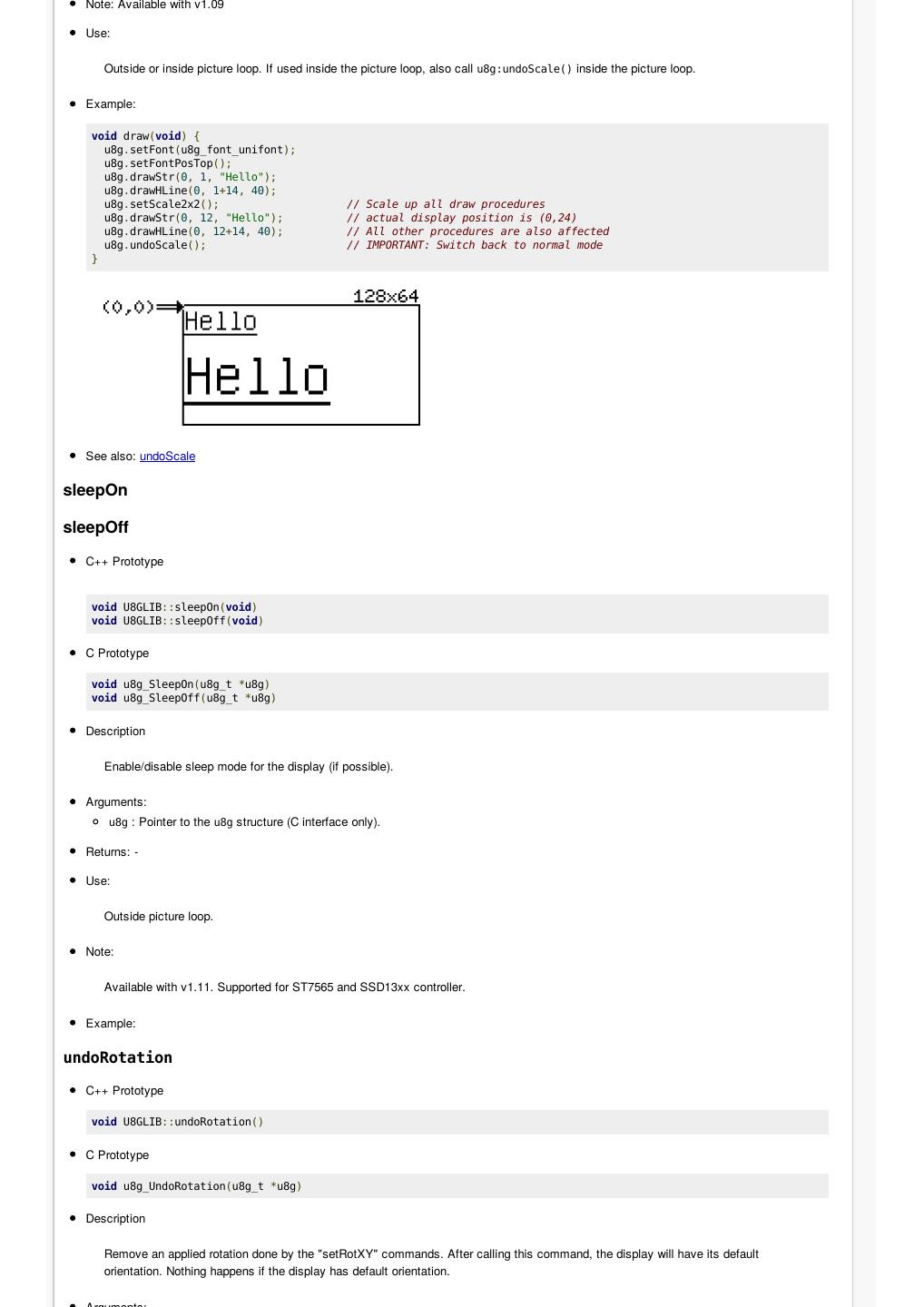 28 . Note: Available with v1.09 Use: Outside or inside picture loop. If used inside the picture loop, also call u8g:undoScale() inside the picture loop. Example: void draw(void) { u8g.setFont(u8g_font_unifont); u8g.setFontPosTop(); u8g.drawStr(0, 1, "Hello"); u8g.drawHLine(0, 1+14, 40); u8g.setScale2x2(); // Scale up all draw procedures u8g.drawStr(0, 12, "Hello"); // actual display position is (0,24) u8g.drawHLine(0, 12+14, 40); // All other procedures are also affected u8g.undoScale(); // IMPORTANT: Switch back to normal mode } See also: undoScale sleepOn sleepOff C++ Prototype void U8GLIB::sleepOn(void) void U8GLIB::sleepOff(void) C Prototype void u8g_SleepOn(u8g_t *u8g) void u8g_SleepOff(u8g_t *u8g) Description Enable/disable sleep mode for the display (if possible). Arguments: u8g : Pointer to the u8g structure (C interface only). Returns: - Use: Outside picture loop. Note: Available with v1.11. Supported for ST7565 and SSD13xx controller. Example: undoRotation C++ Prototype void U8GLIB::undoRotation() C Prototype void u8g_UndoRotation(u8g_t *u8g) Description Remove an applied rotation done by the "setRotXY" commands. After calling this command, the display will have its default orientation. Nothing happens if the display has default orientation.