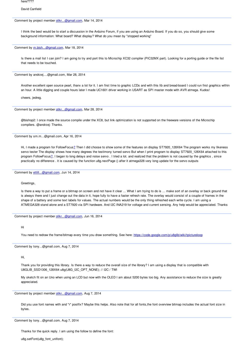 29 . u8g : Pointer to the u8g structure (C interface only). Returns: Use: Outside picture loop. Example: See also: setRot90 undoScale C++ Prototype void U8GLIB::undoScale() C Prototype void u8g_UndoScale(u8g_t *u8g) Description Remove an applied scaling. If the scaling has been applied within the body of the picture loop, then this command should be called within the body of the picture loop. Arguments: u8g : Pointer to the u8g structure (C interface only). Returns: Note: Available with v1.09 Example: See also: setScale2x2 U8GLIB C++ Prototype void U8GLIB::U8GLIB(u8g_dev_t *dev) void U8GLIB::U8GLIB(u8g_dev_t *dev, uint8_t sck, uint8_t mosi, uint8_t cs, uint8_t a0, uint8_t reset) void U8GLIB::U8GLIB(u8g_dev_t *dev, uint8_t d0, uint8_t d1, uint8_t d2, uint8_t d3, uint8_t d4, uint8_t d5, uint8_t d6, uint8_t d7 uint8_t en, uint8_t cs1, uint8_t cs2, uint8_t di, uint8_t rw, uint8_t reset) Description Create a new interface to a graphics display. The dev argument describes the type of the display. See here for a complete list of available devices. Usually this constructor is not called directly. Instead there are drived classes for each available device. See also the last column of the device list for a complete list of available constructor calls. Arguments: dev: A pointer to a device structure. Arduino pins: Required pins to connect the display depending on the communication interface. reset: The reset pin is optional and can be U8G_PIN_NONE Returns: Use: Outside picture loop. Note: Example: See also: List of supported devices Comment by cooljian...@gmail.com, Dec 31, 2012 HI,a problem---arduino 12864,when in parallel there are "noises",when in spi ,it's okay,could you tell me why,thanks? Comment by project member olikr...@gmail.com, Dec 31, 2012