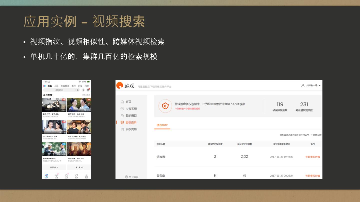 23 .应用实例 – 视频搜索 ▪ 视频指纹、视频相似性、跨媒体视频检索 ▪ 单机几十亿的,集群几百亿的检索规模