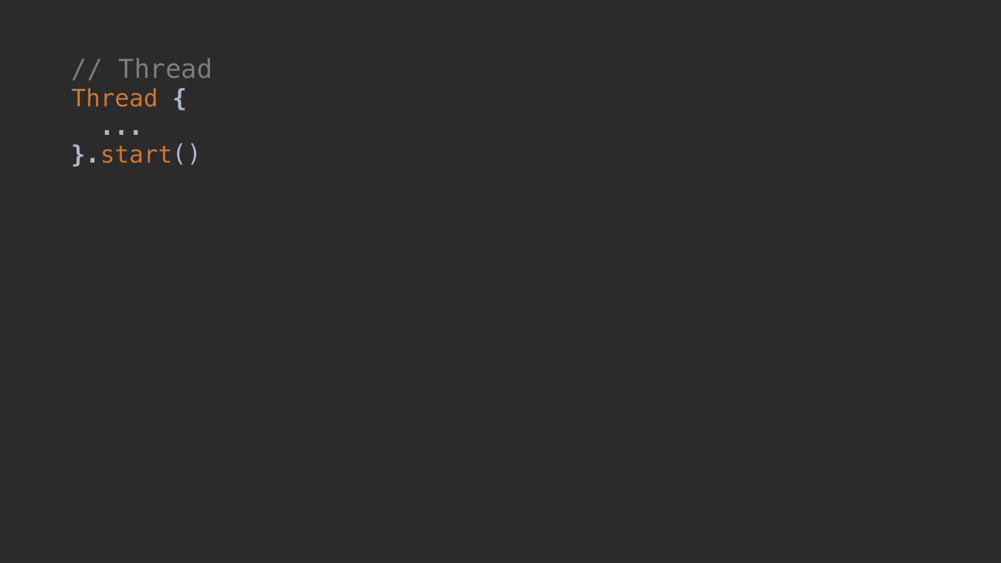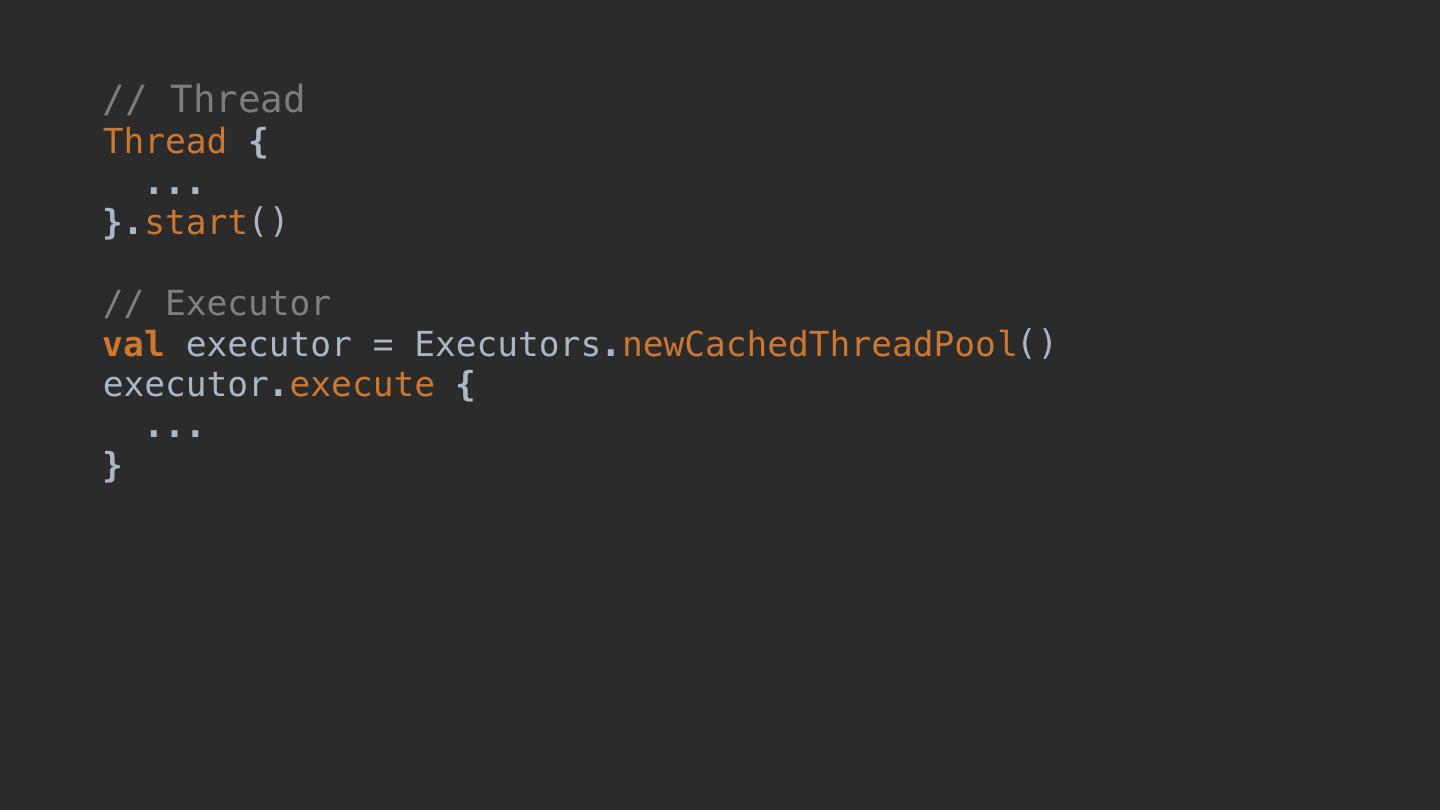 8 .// Thread Thread { ... }.start() // Executor val executor = Executors.newCachedThreadPool() executor.execute { ... }
